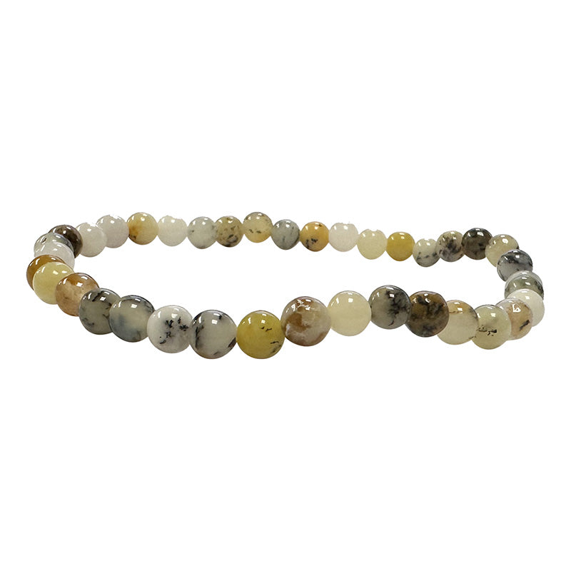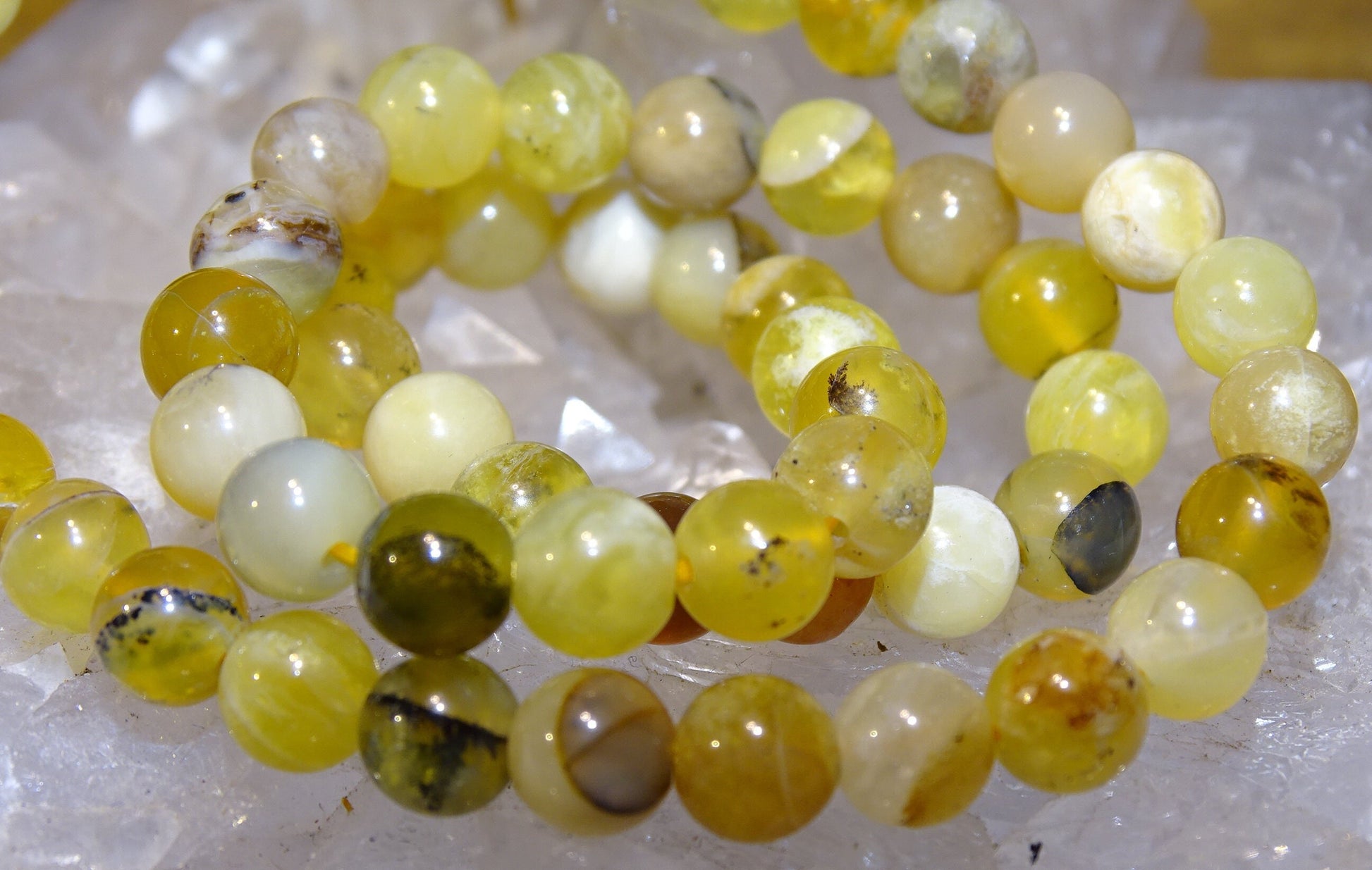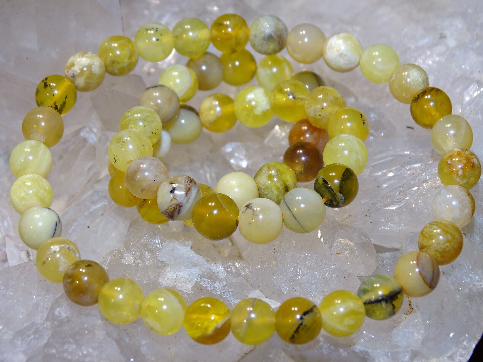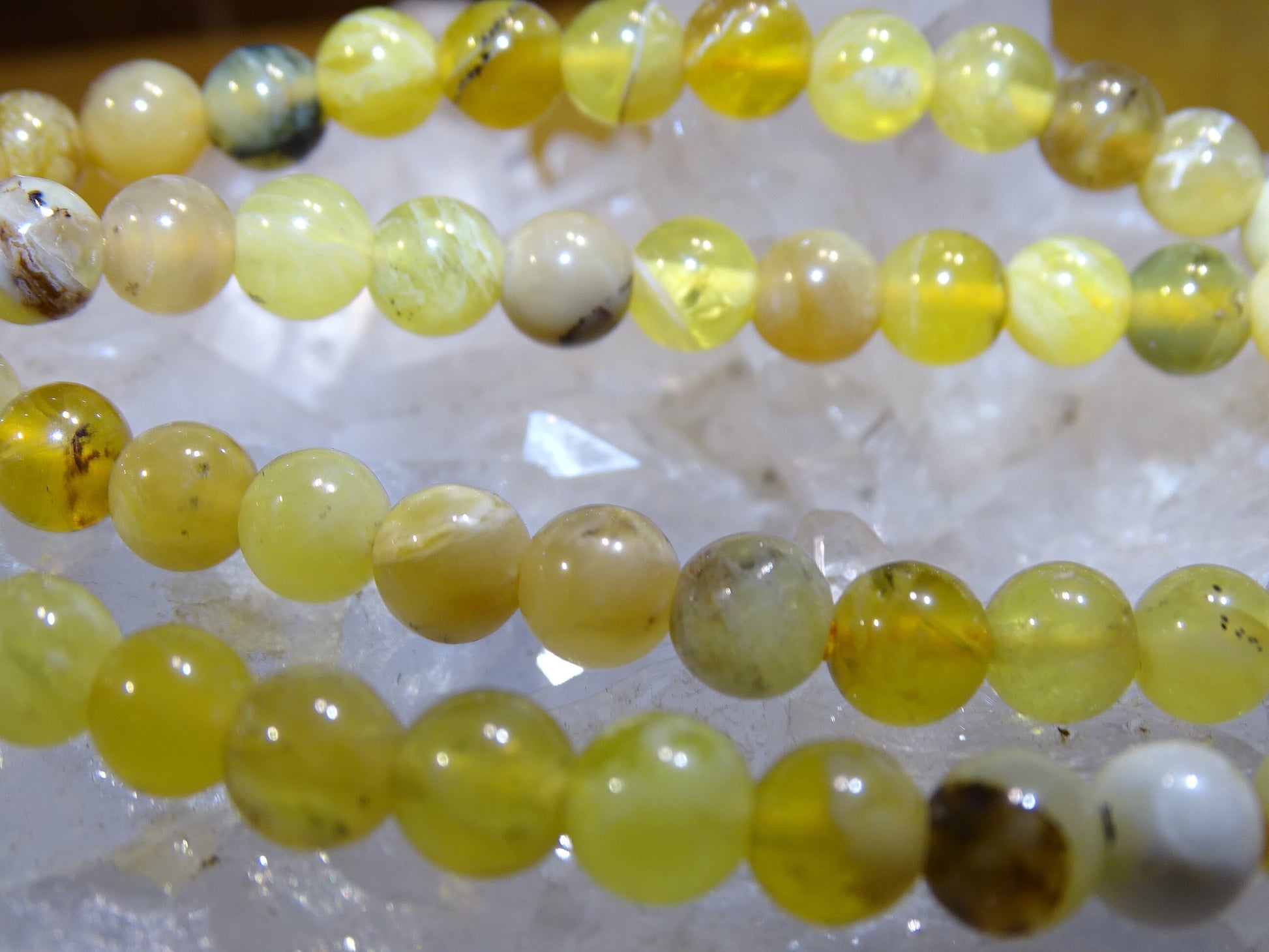 Opale jaune d'Australie, perles rondes de 4, 6 ou 8 mm. Vendu en fil de perle 38/39 cm, en bracelet de 17 à 21cm, en collier de 45 ou sautoir de 60cm. Qualité AA à AAA, superbes perles aux reflets dentriques !