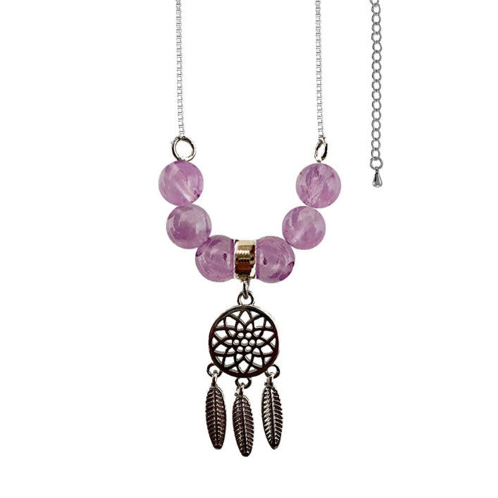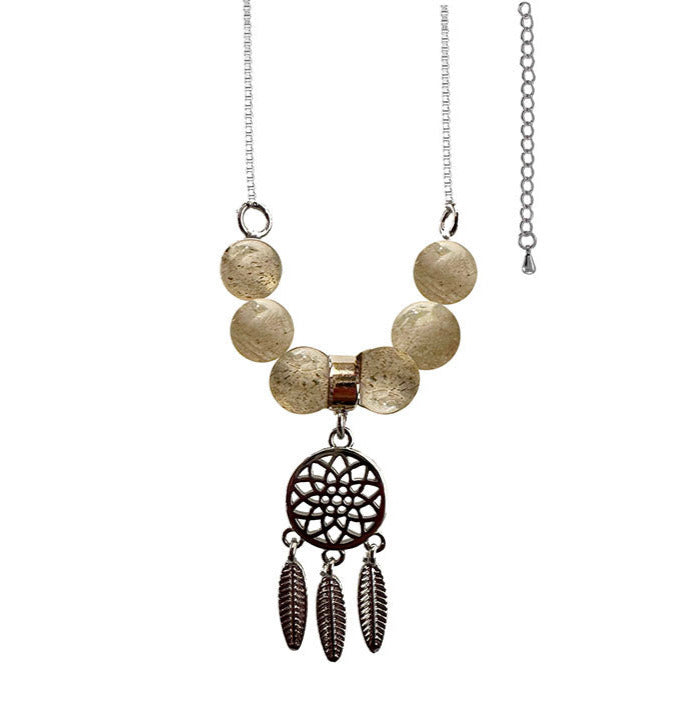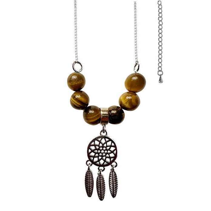 Chaîne avec chaînette de rallonge de 41,5 centimètres, en bronze galvanisé, ornée d'un pendentif attrape rêve et de 6 perles de 6 milimètres en pierres ! Disponible en Améthyste, labradorite, oeil de tigre !
