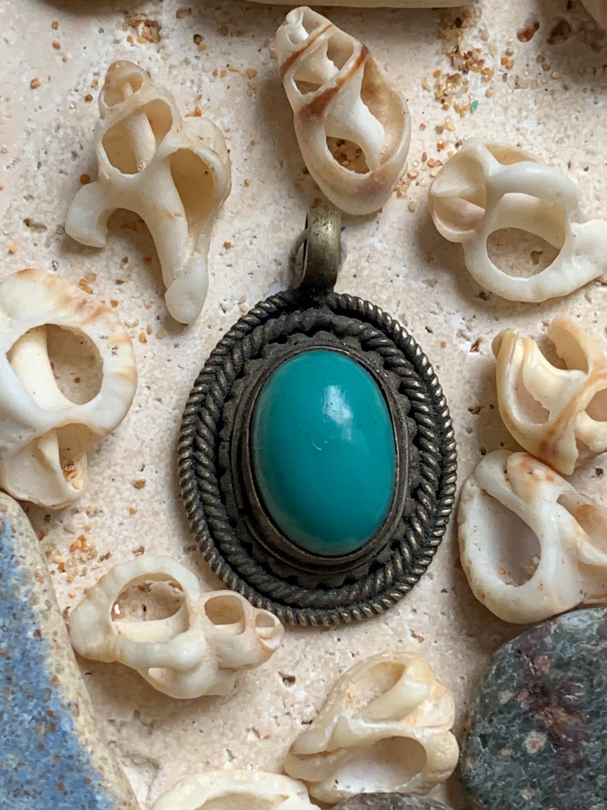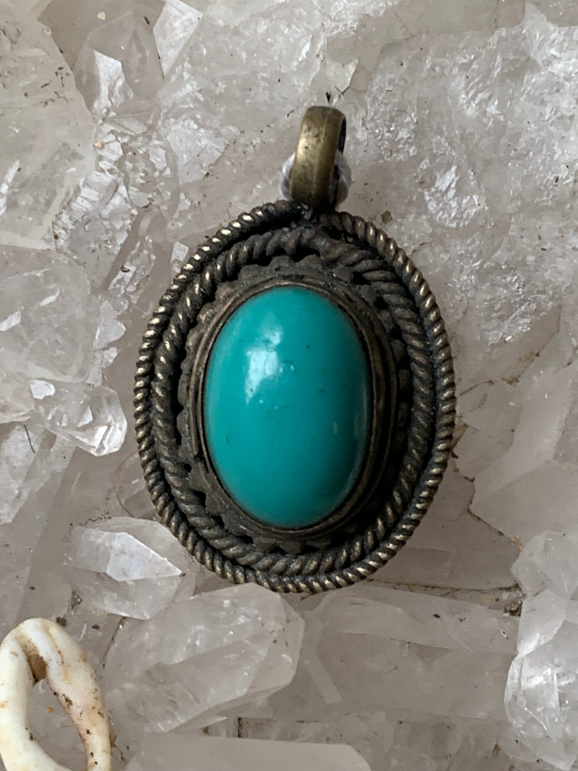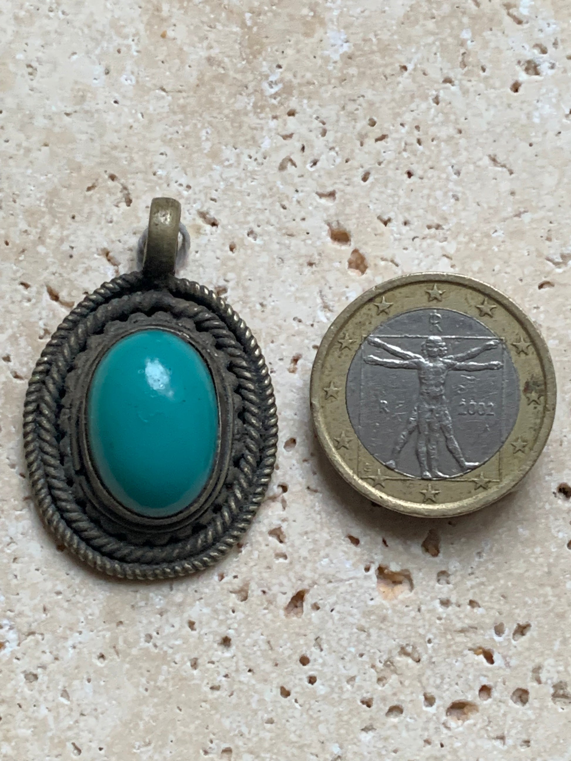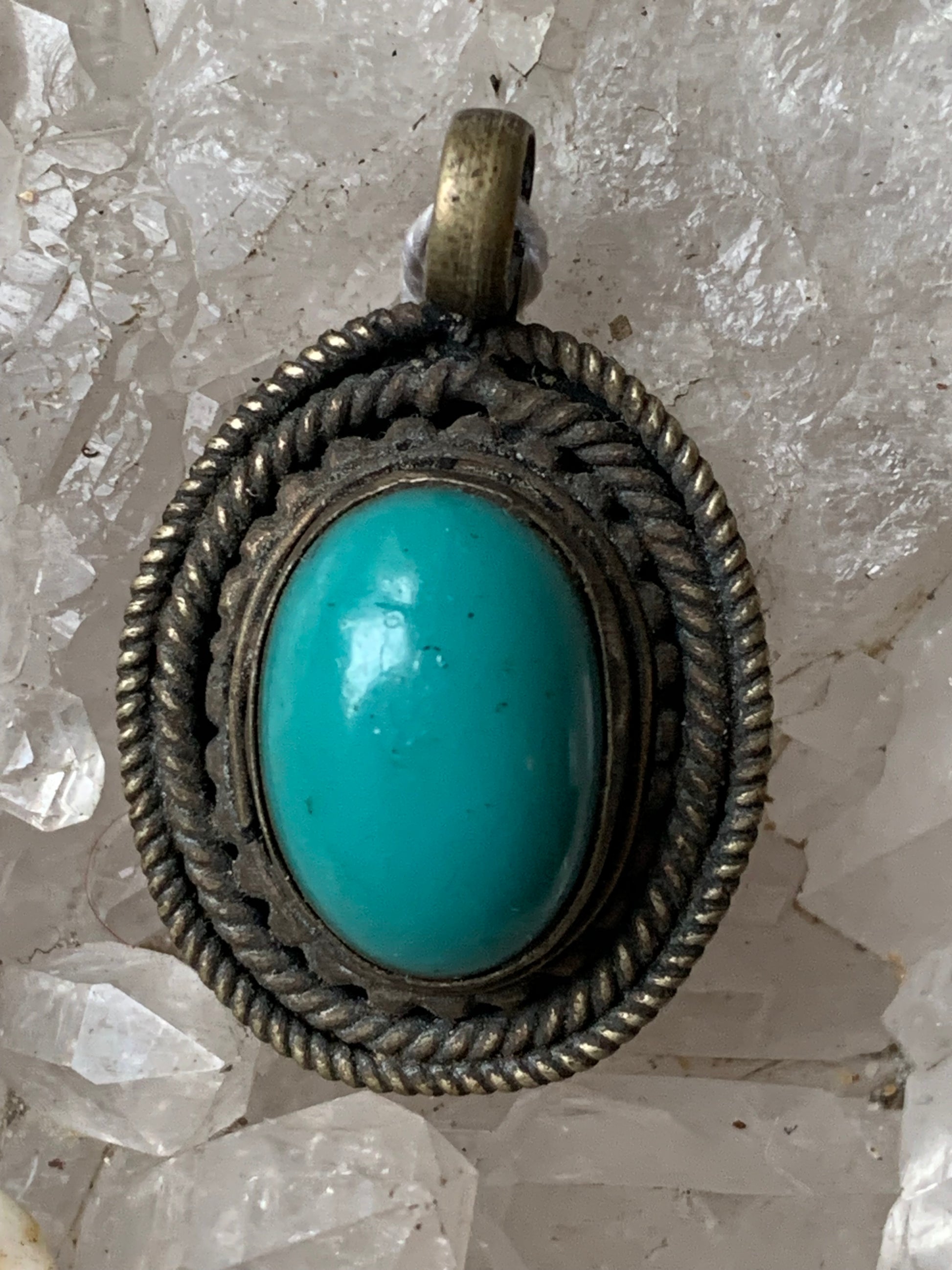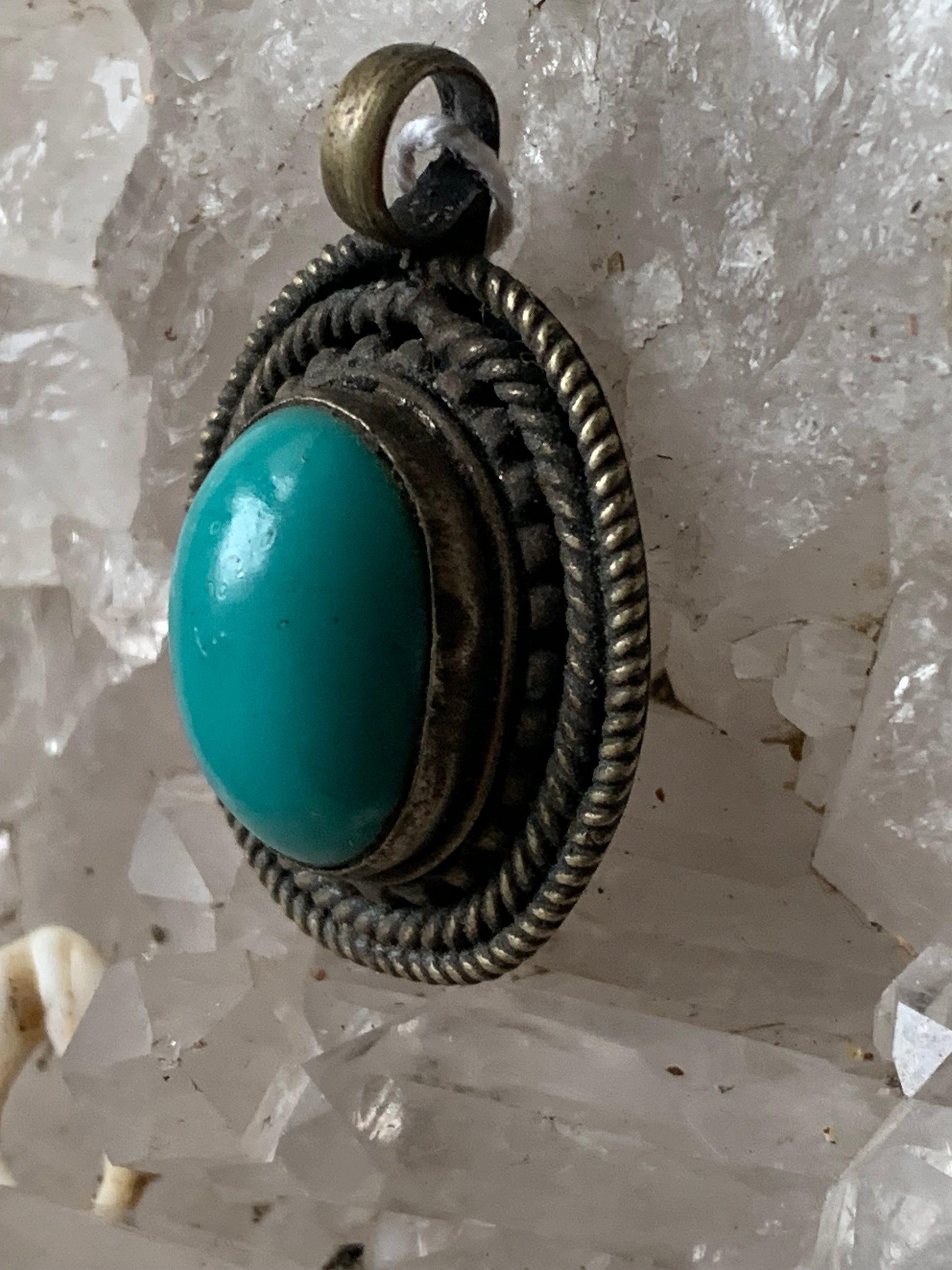Pendentif artisanal du Népal avec pierres de turquoise sertis sur métal ! De 38 millimètres de hauteur x 26 mm de largeur x 11 d'épaisseur. Vendu avec cordon noir réglable offert, parfait !