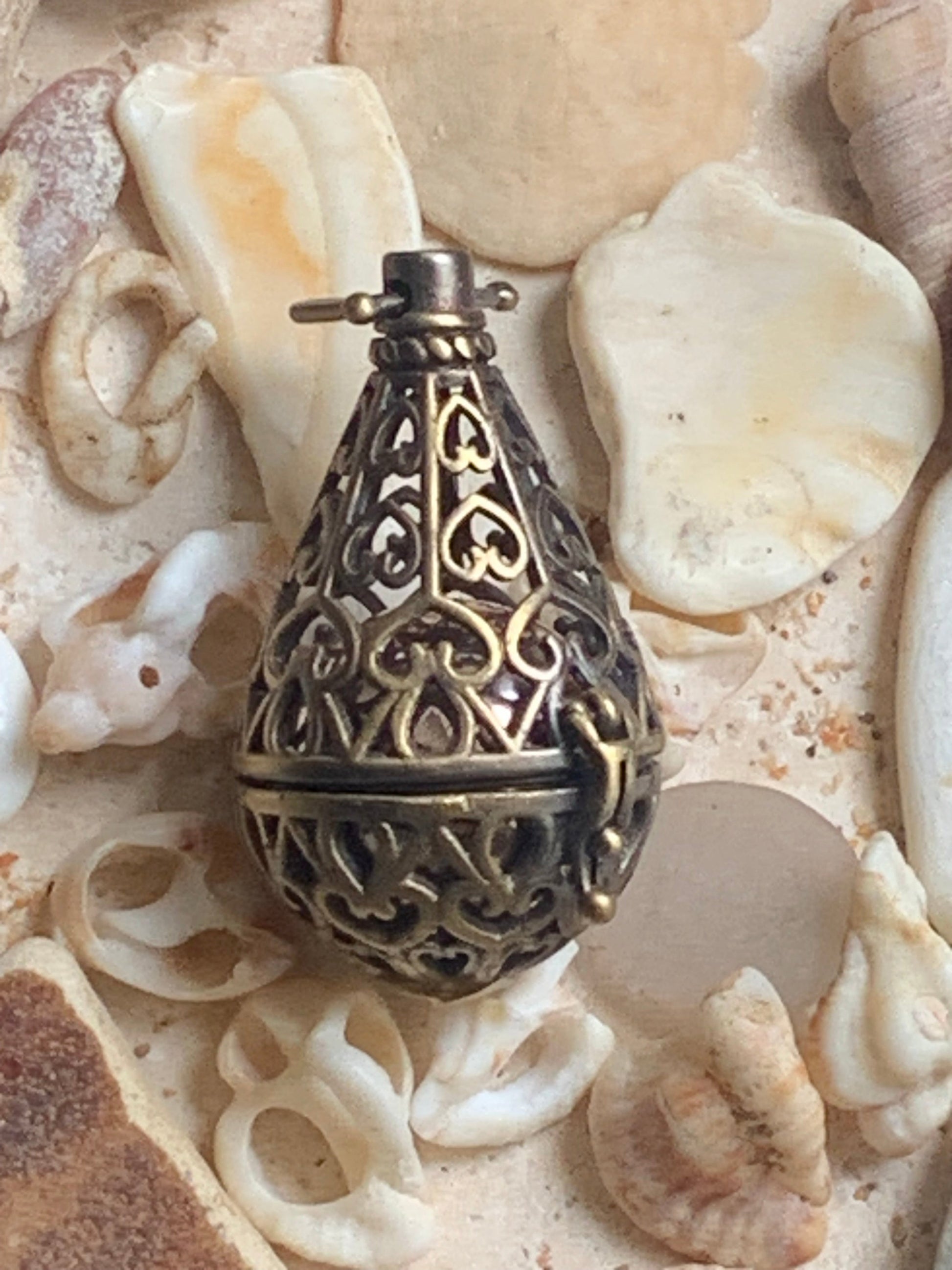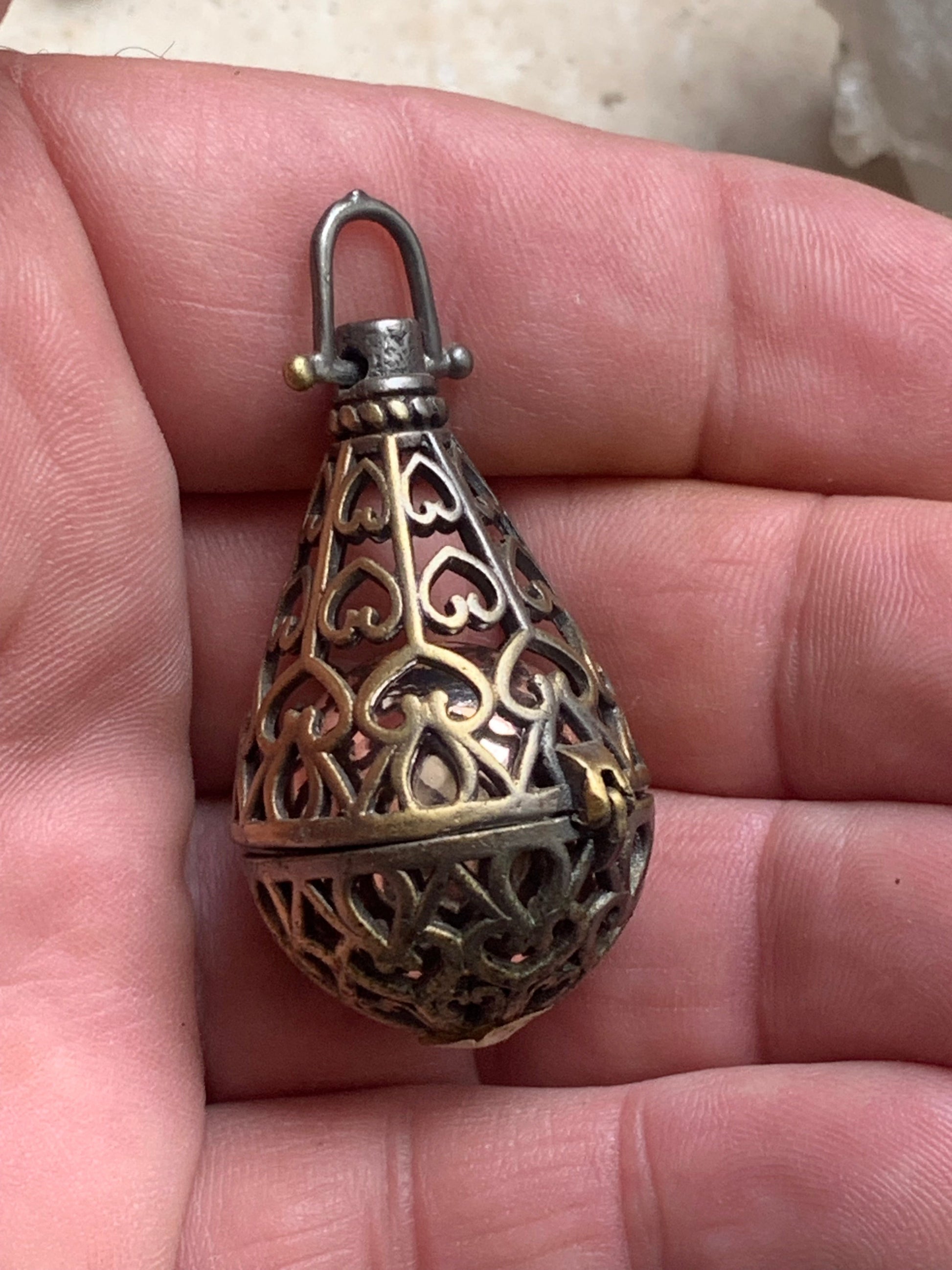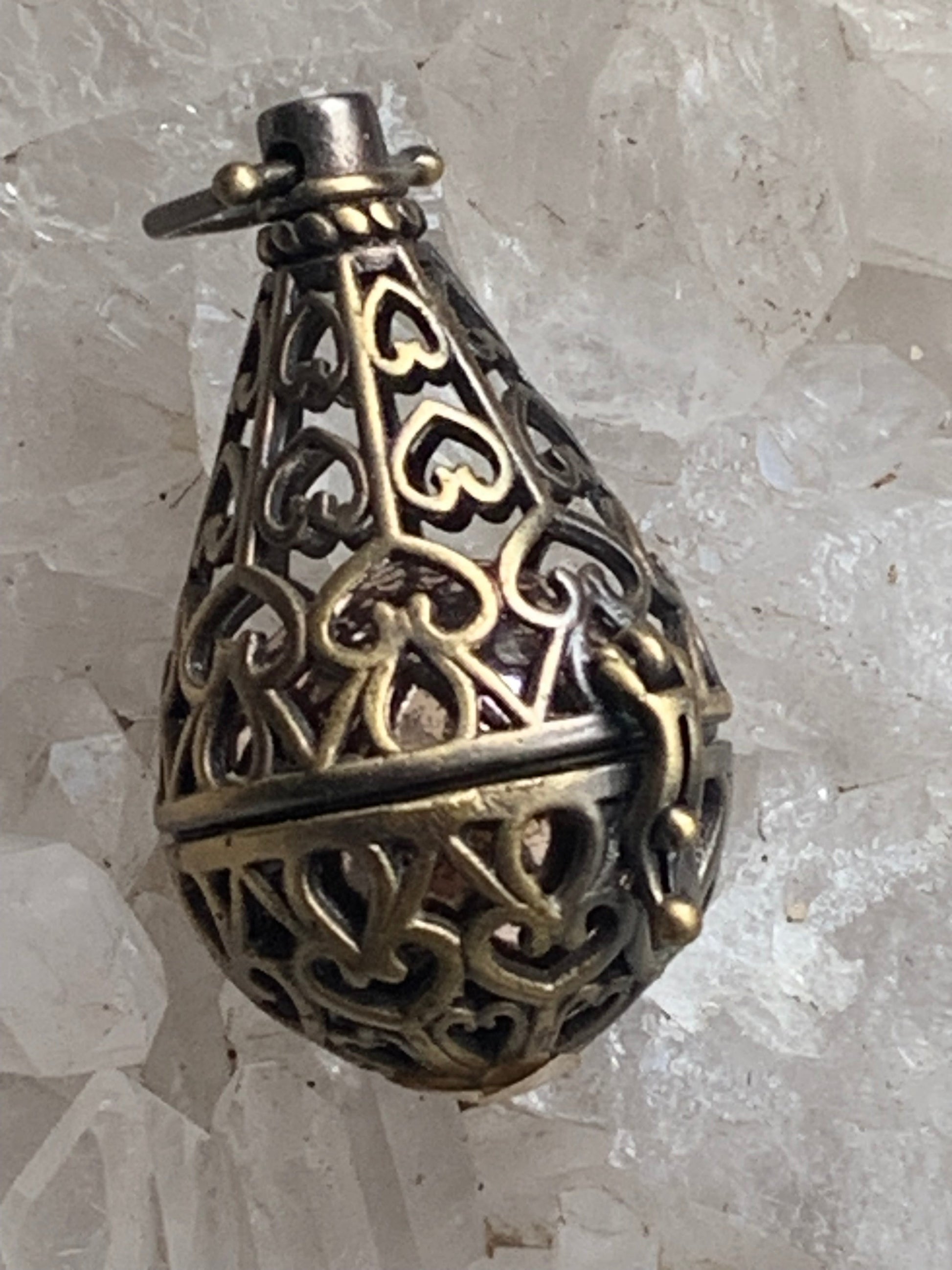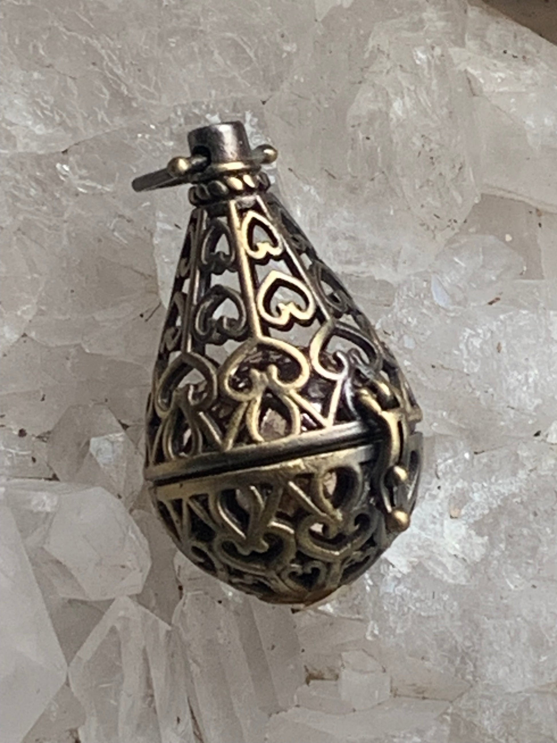 Pendentif/ Cage à pierre, peut servir de Bolas (pendentif de grossesse) ou pour perle de lave pour huile essentielle ! 4,8 centimètres de hauteur x 2 cm de diamètre. Fait en laiton ! Vendu avec une perle de lave de 18 mm !