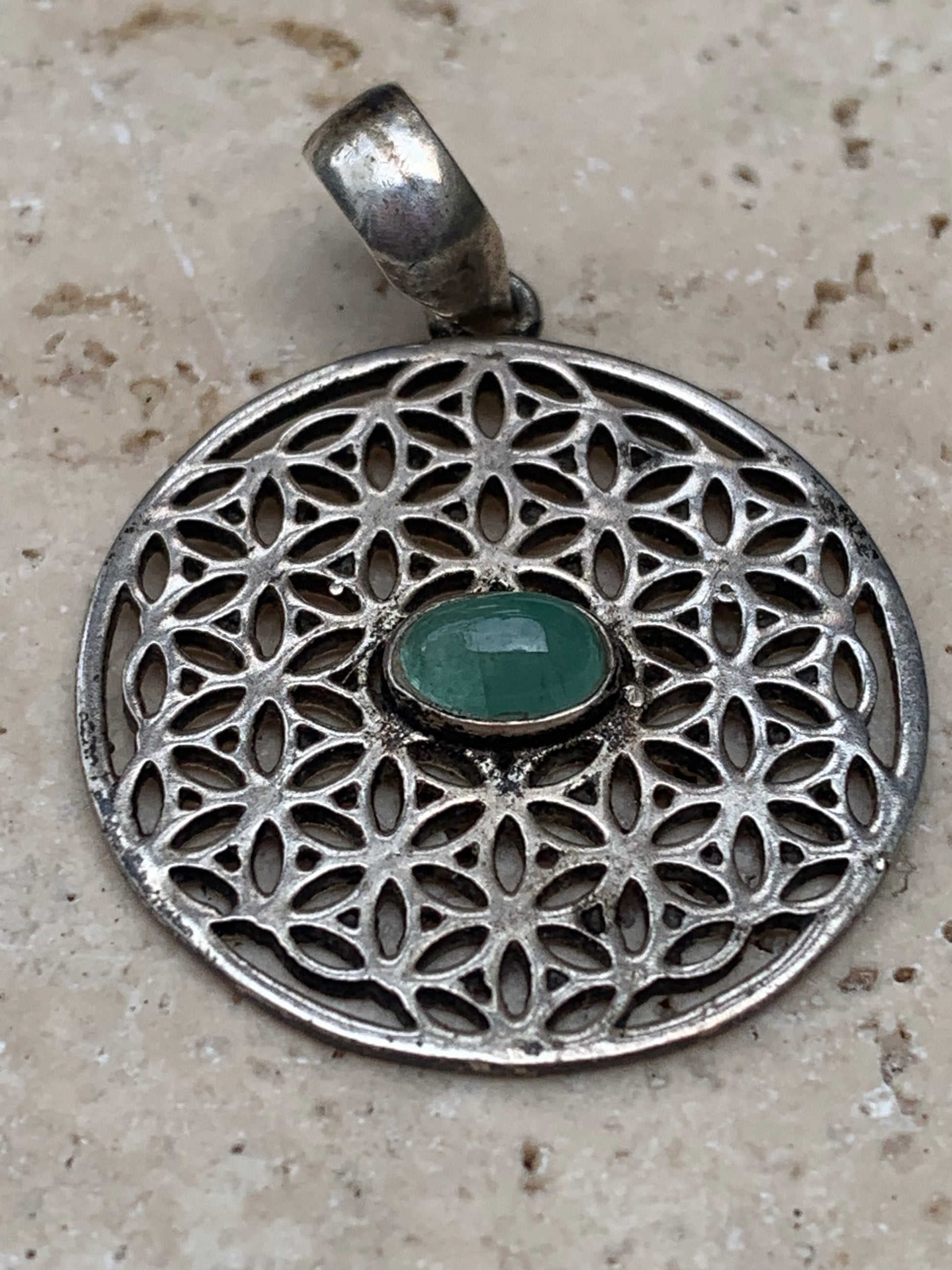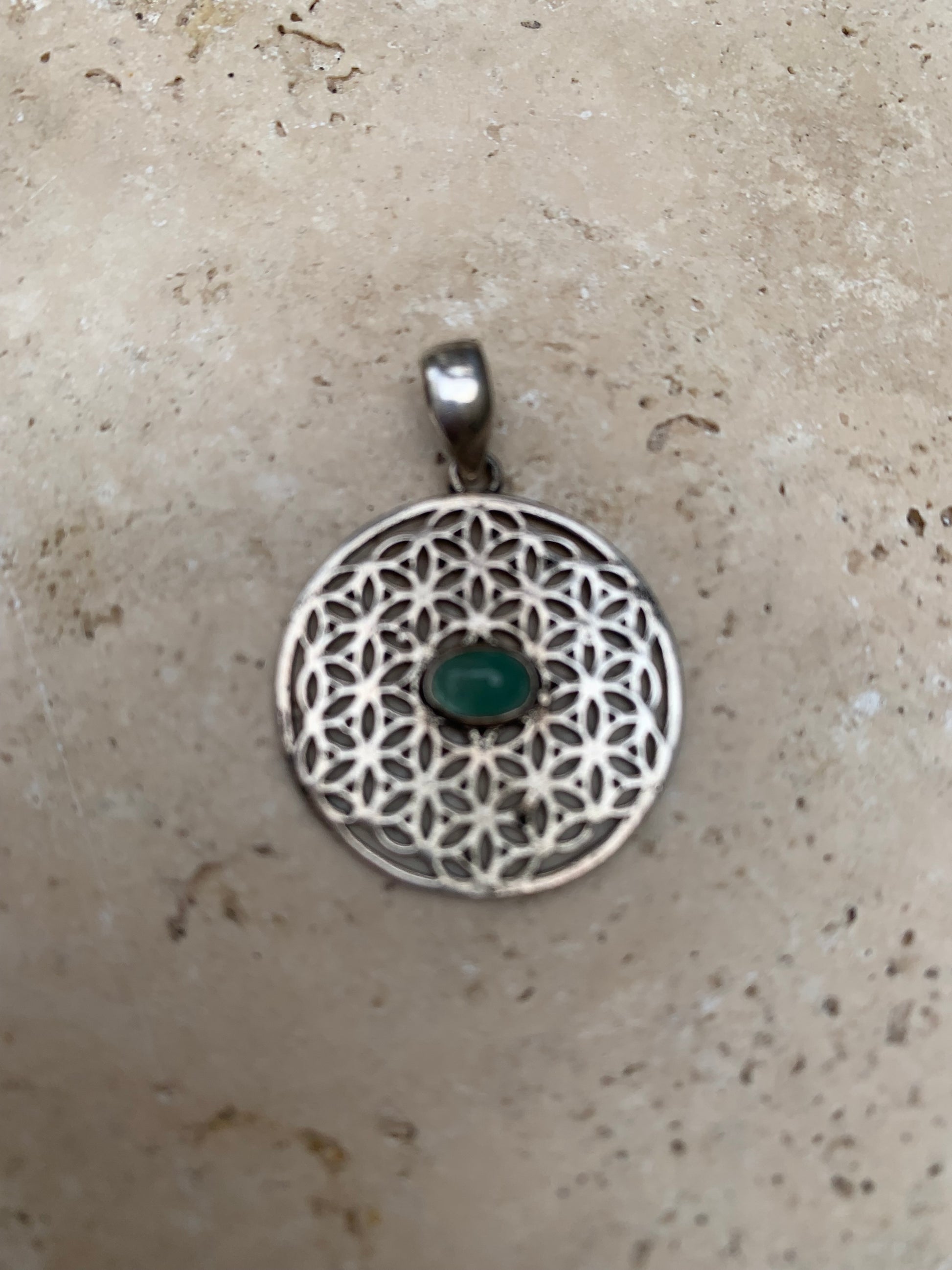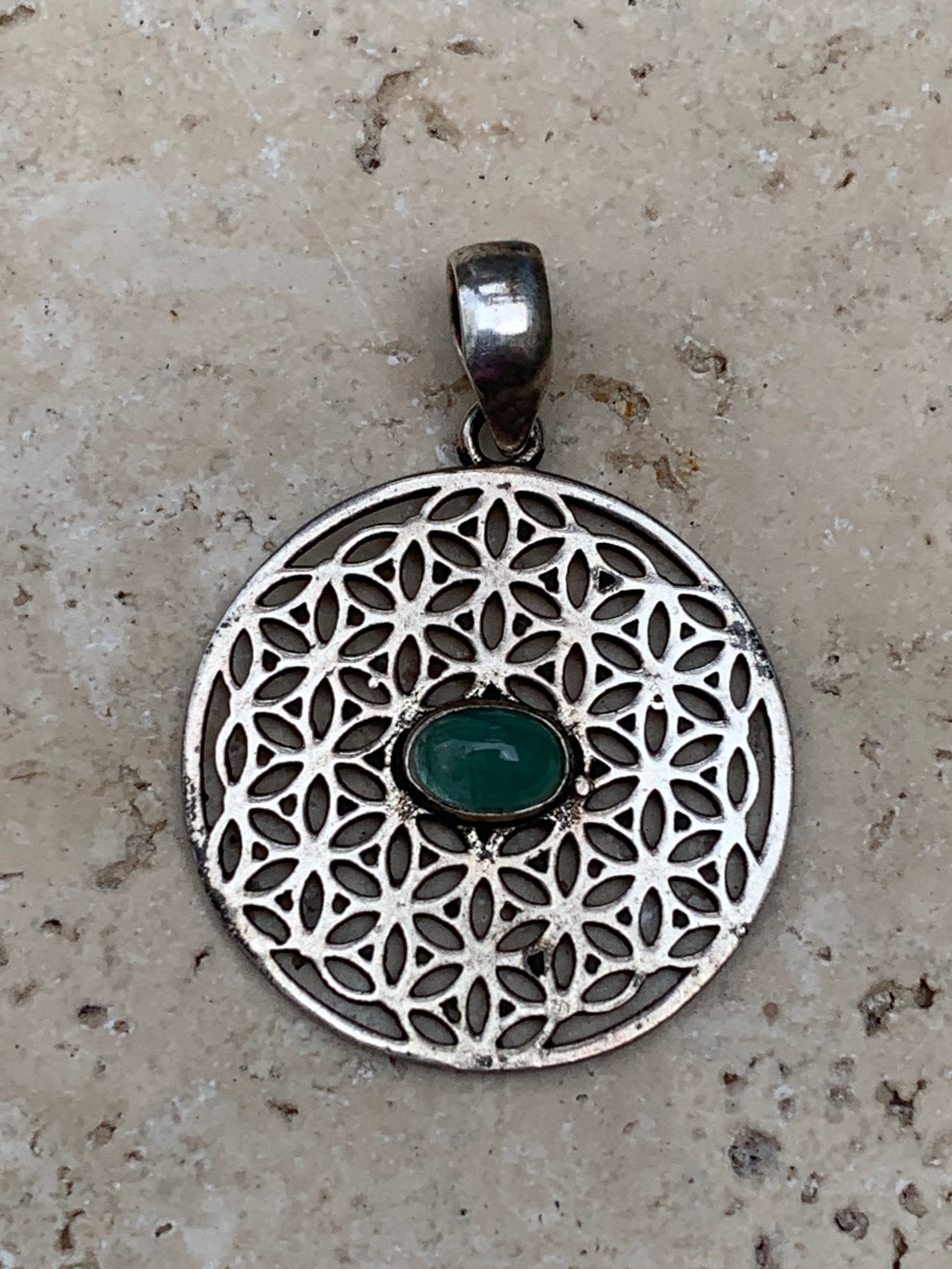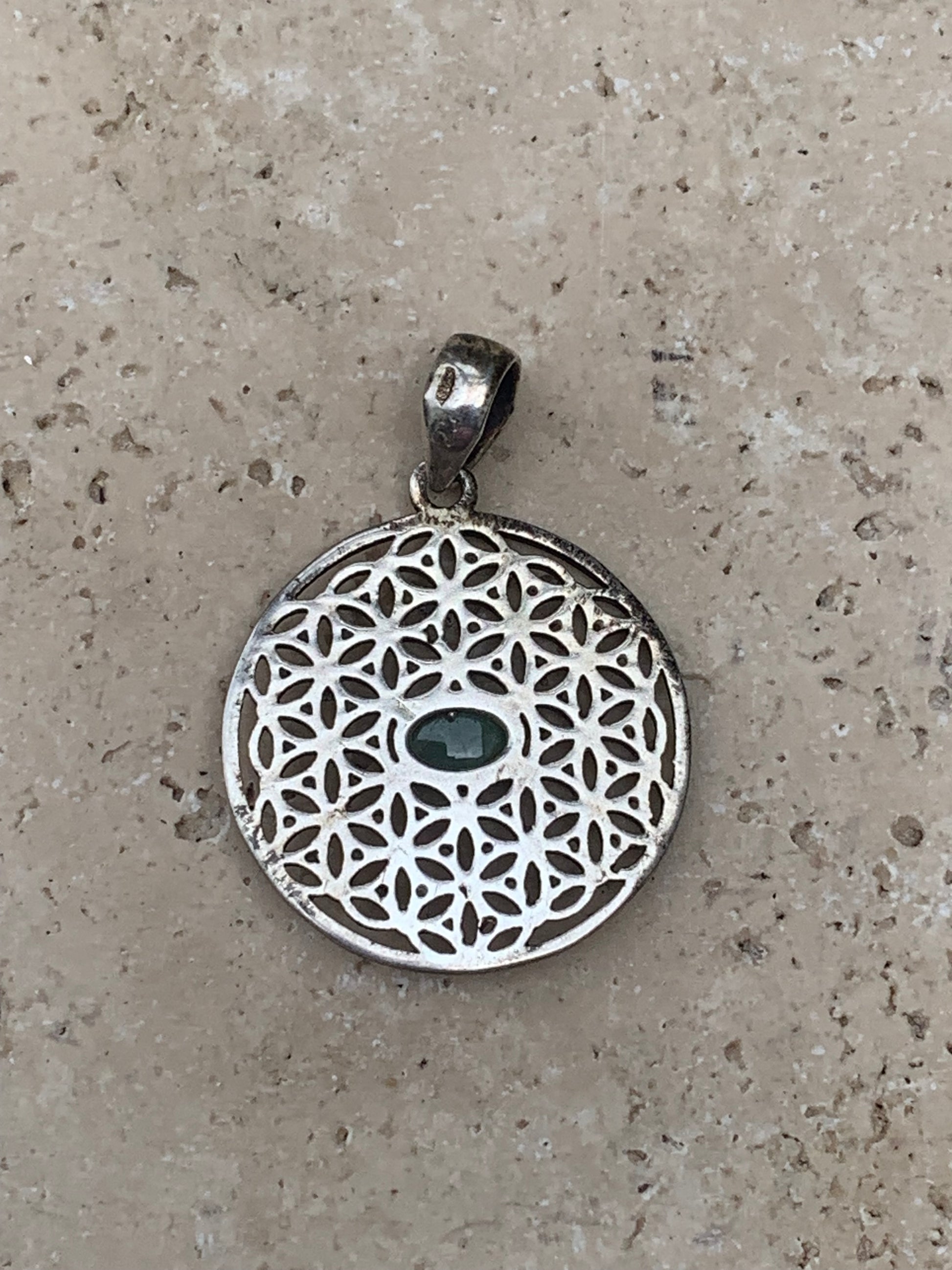 Pendentif en Argent 925 en forme de Fleur de vie avec une émeraude au centre, de 25 millimètres de diamètre. Vendu avec cordon noir réglable offert, parfait !