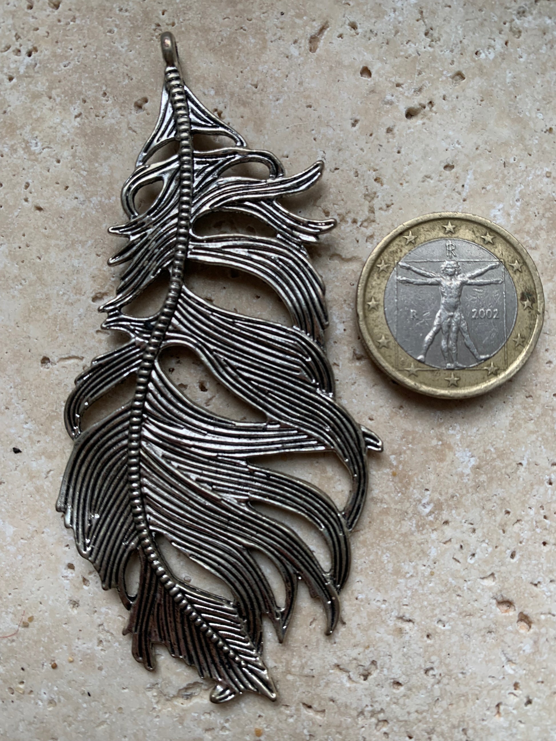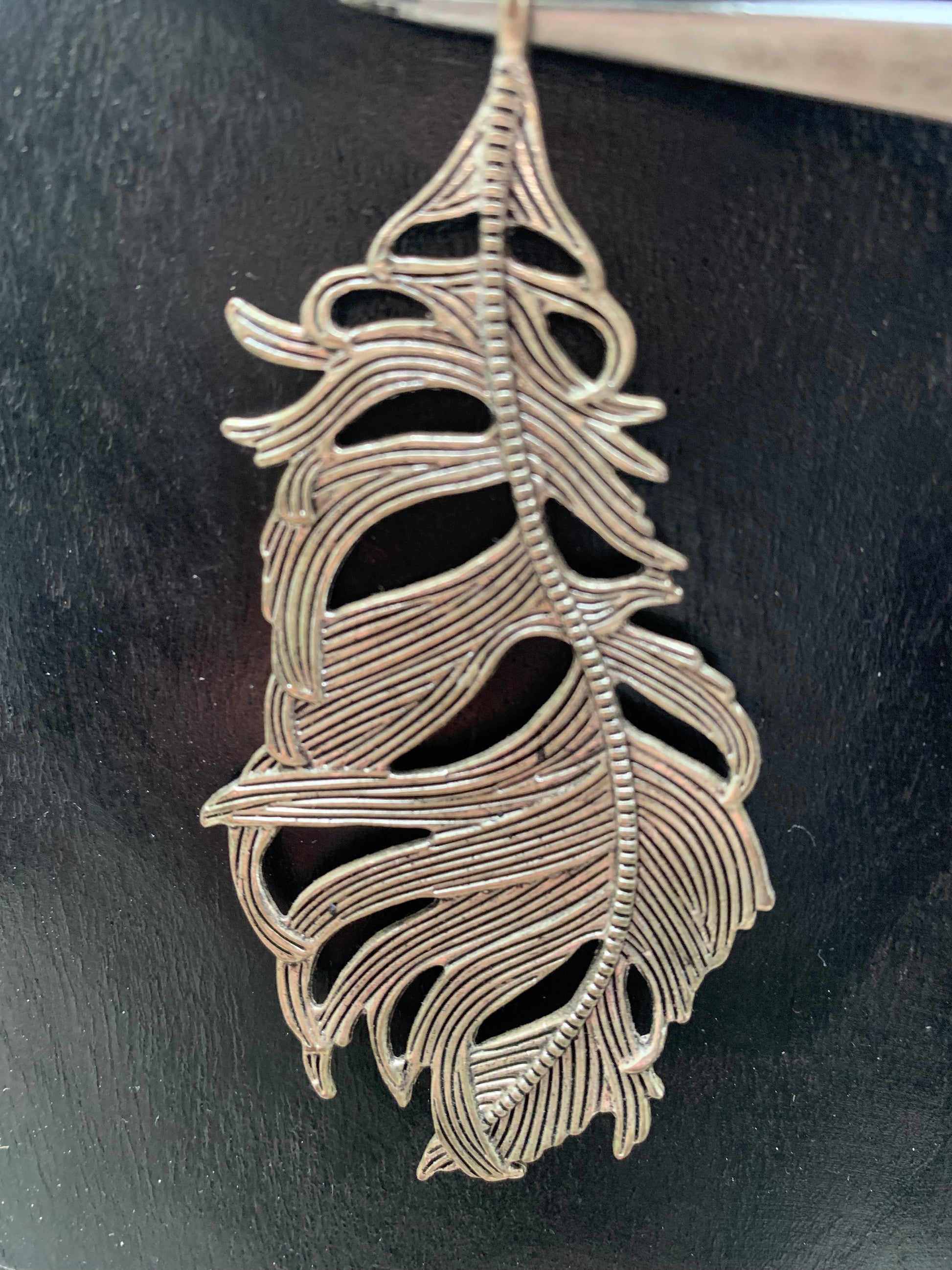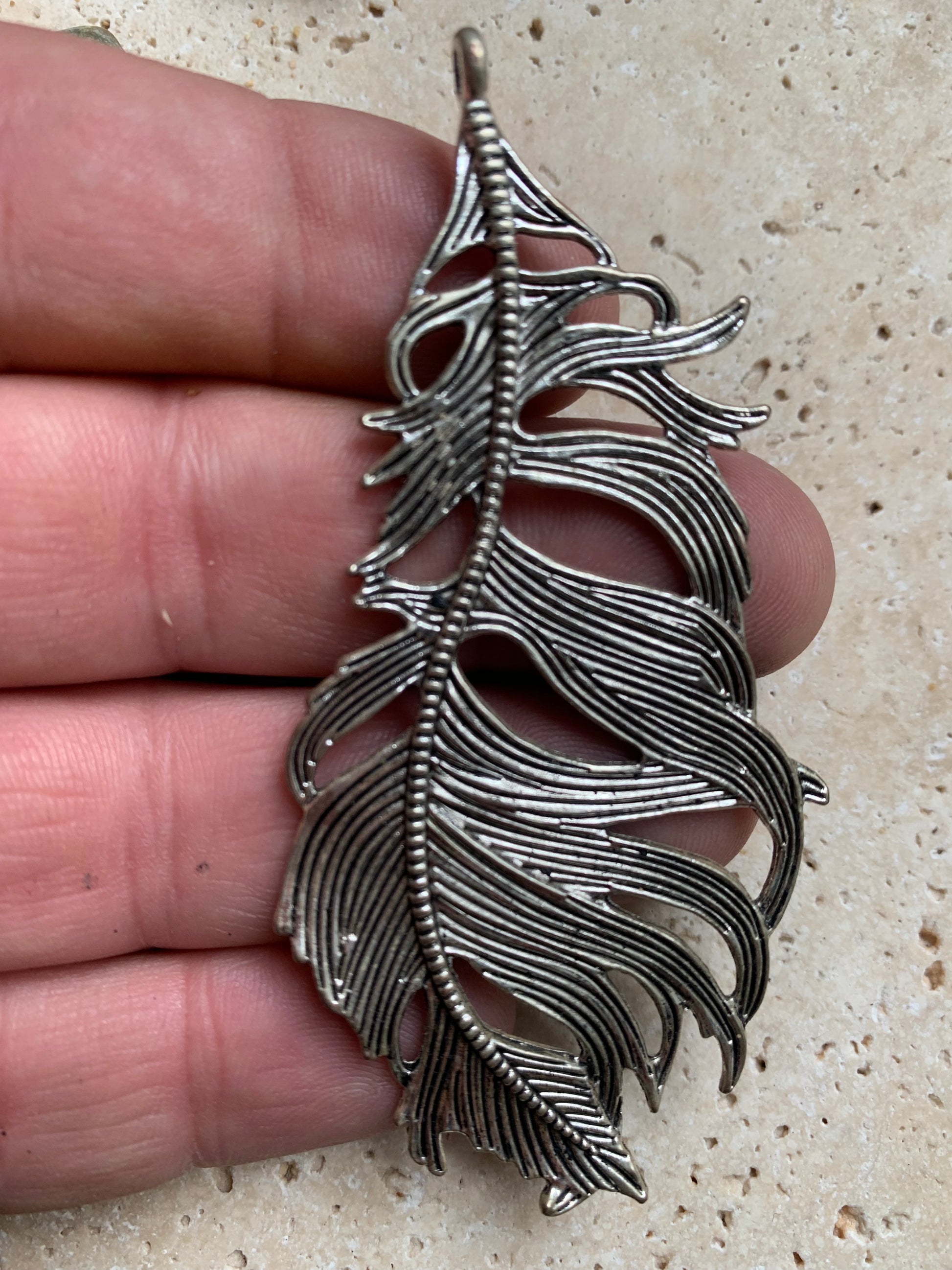 Pendentif en métal argenté en forme de plume. De 85 x 40 x 5 millimètres. Vendu avec cordon noir réglable offert, parfait !