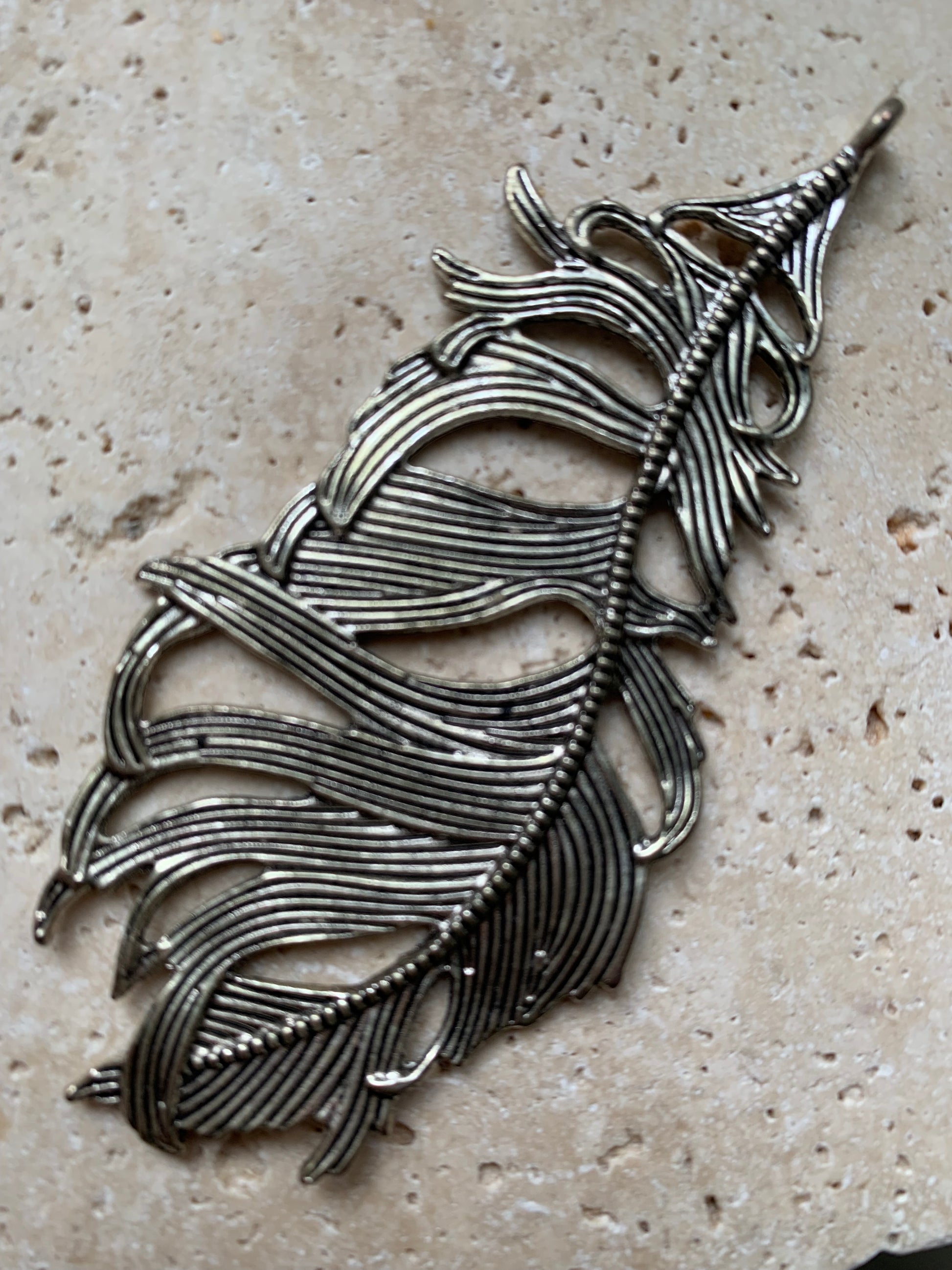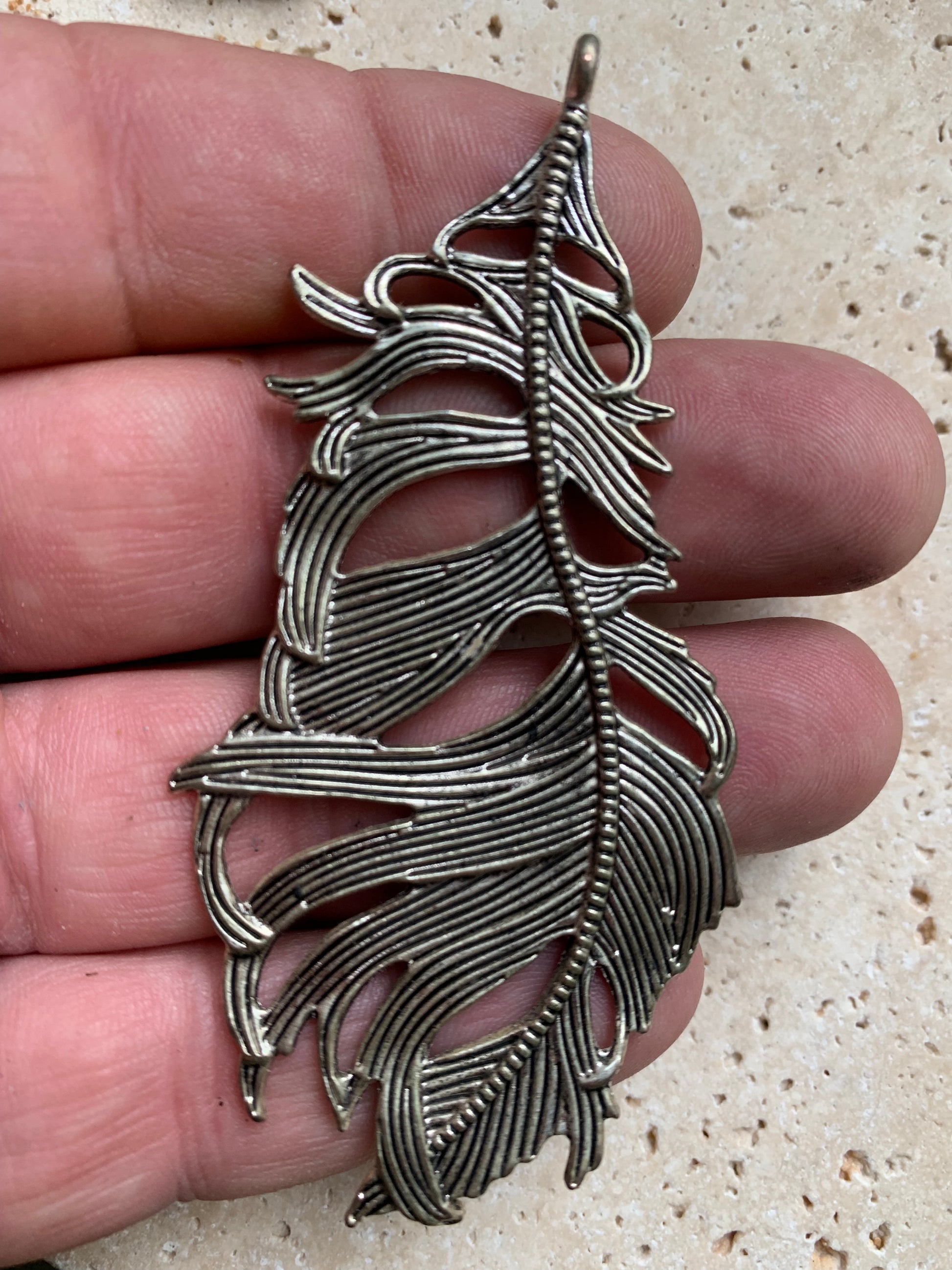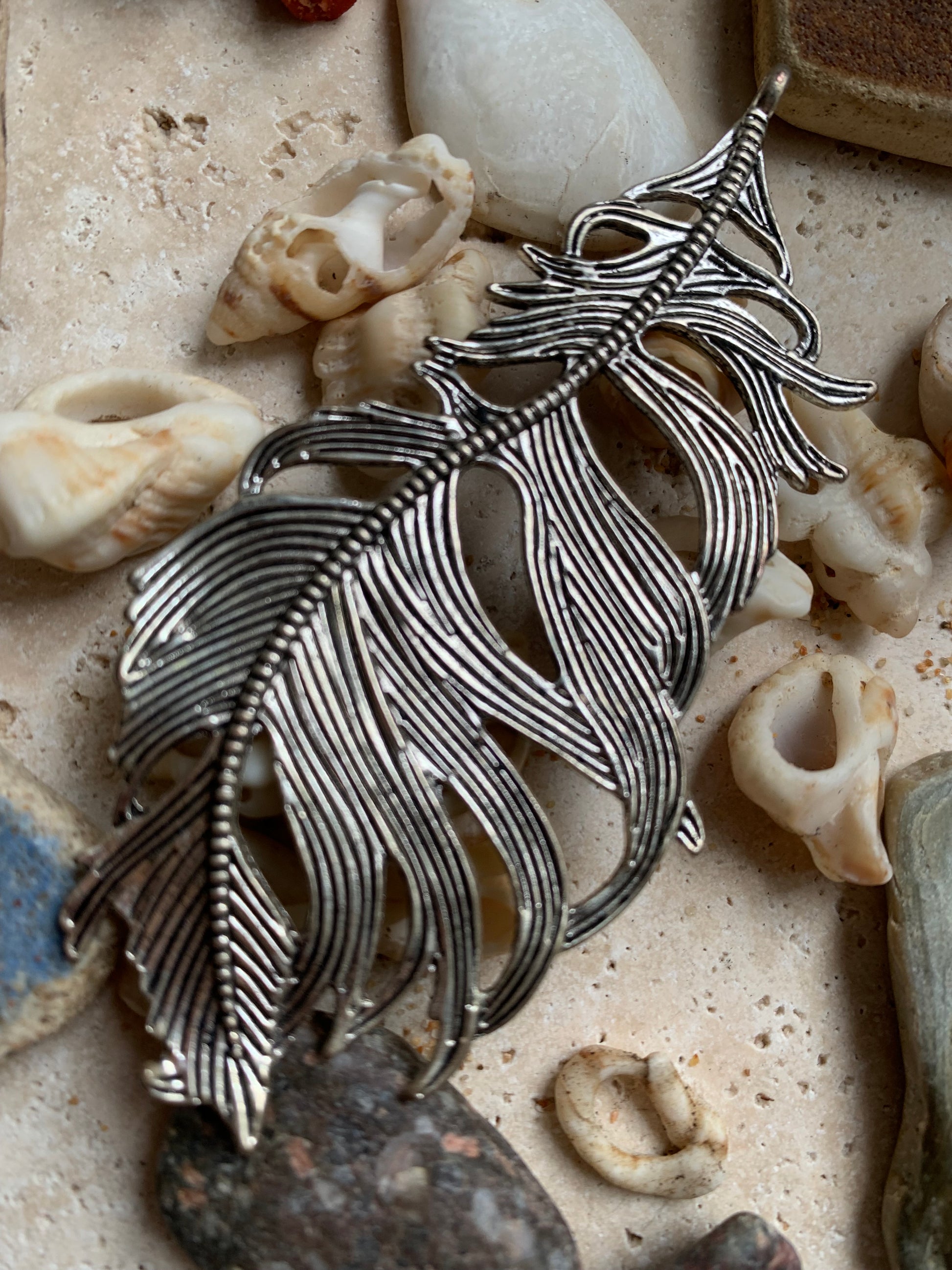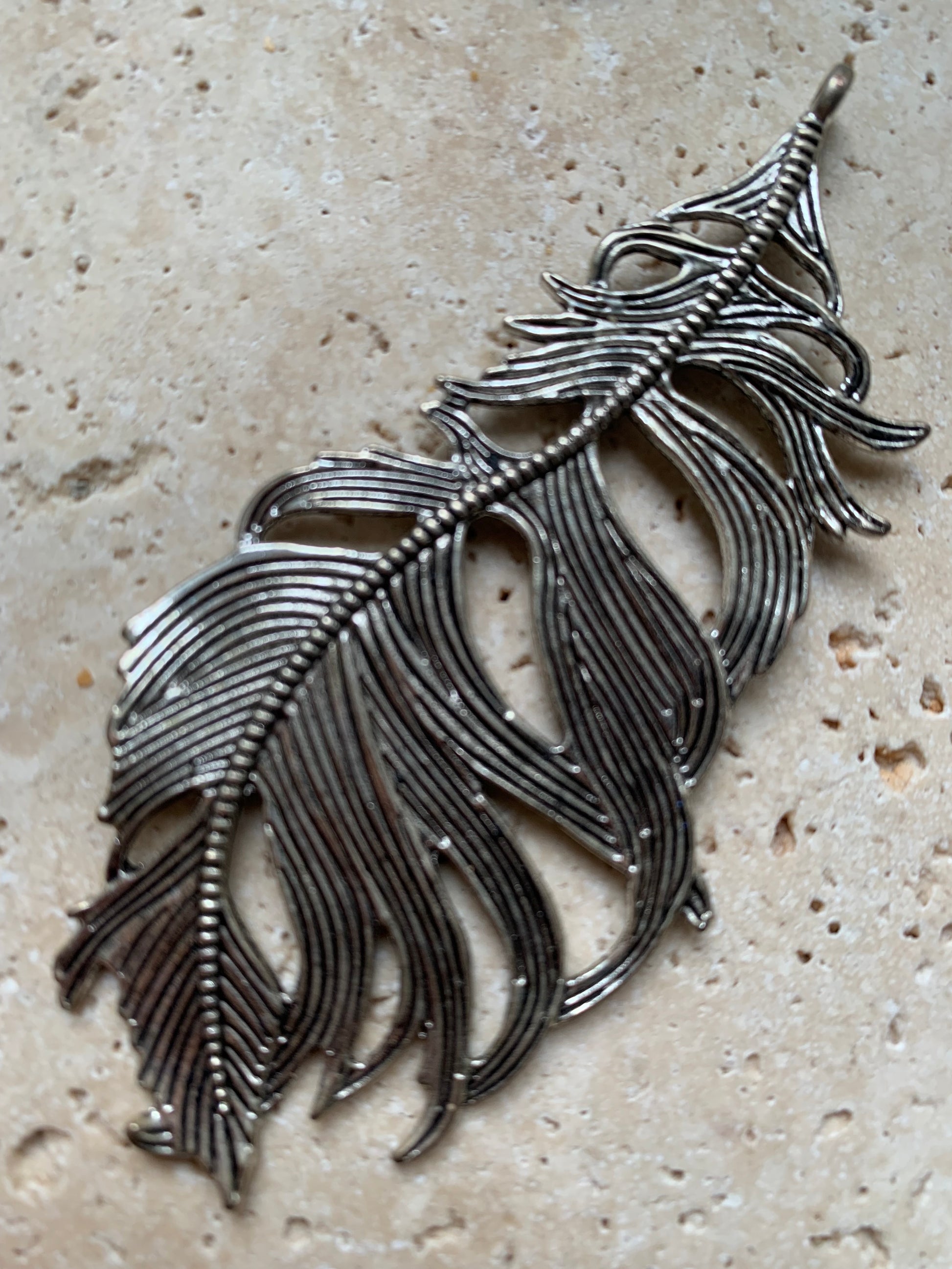 Pendentif en métal argenté en forme de plume. De 85 x 40 x 5 millimètres. Vendu avec cordon noir réglable offert, parfait !