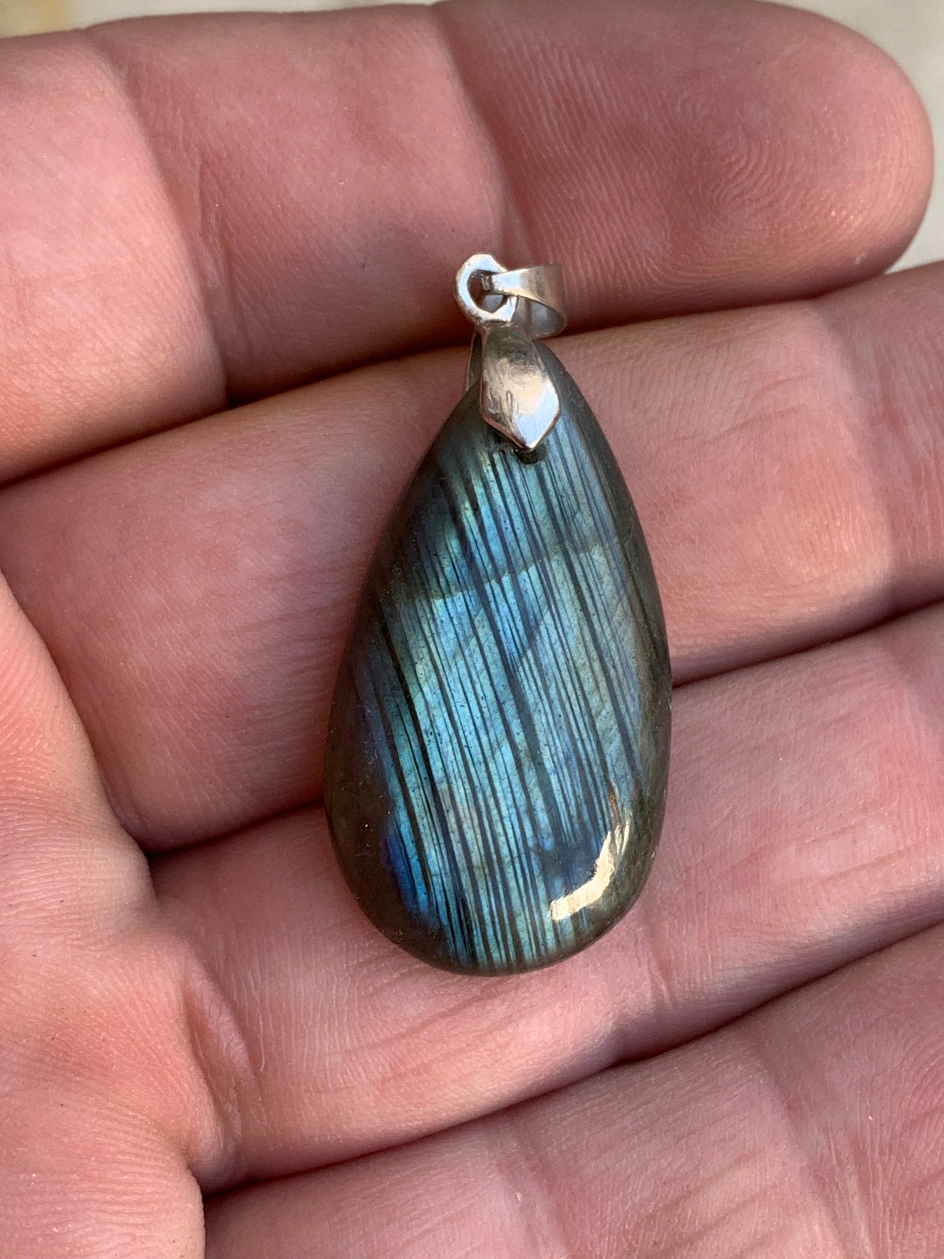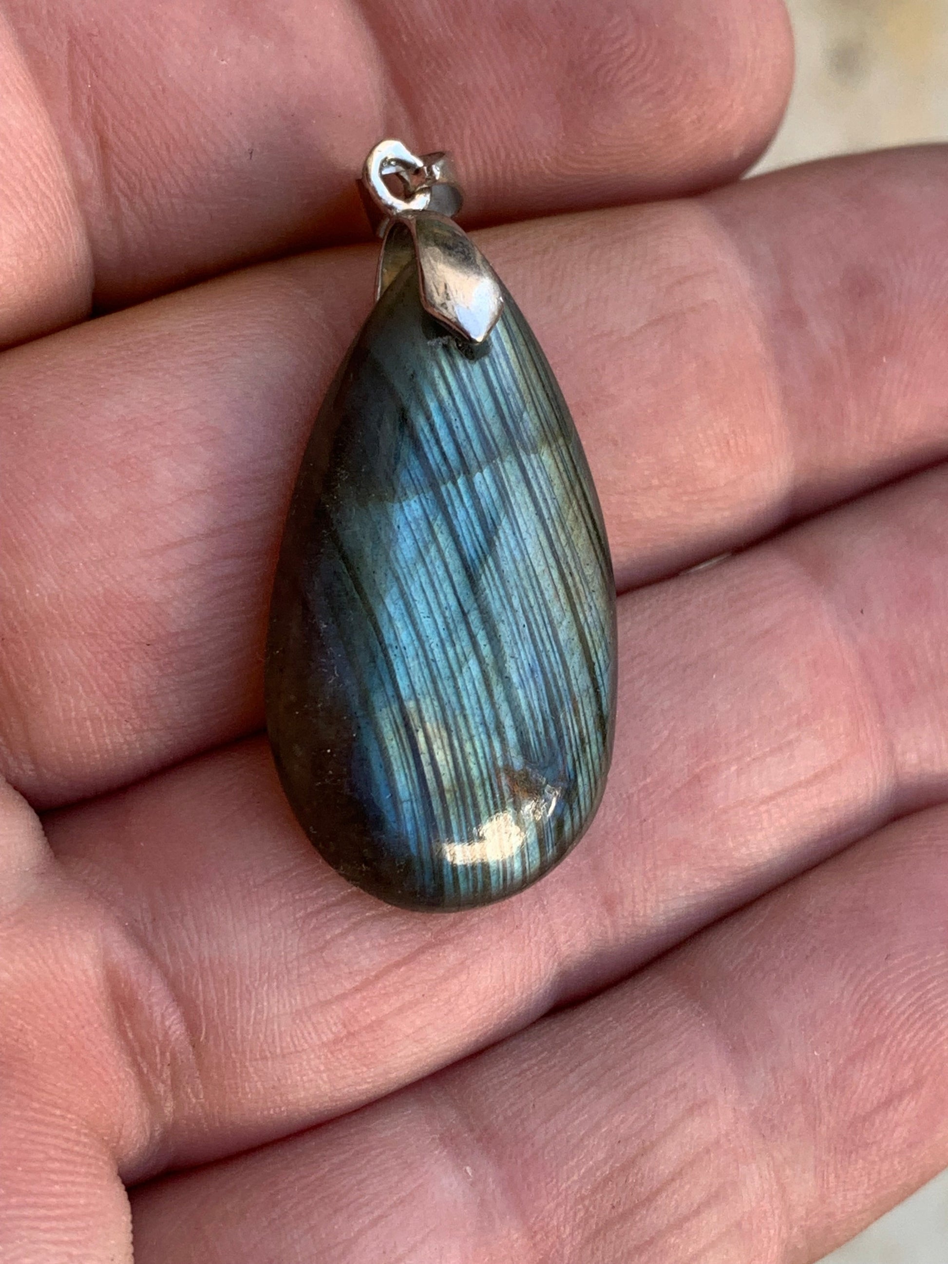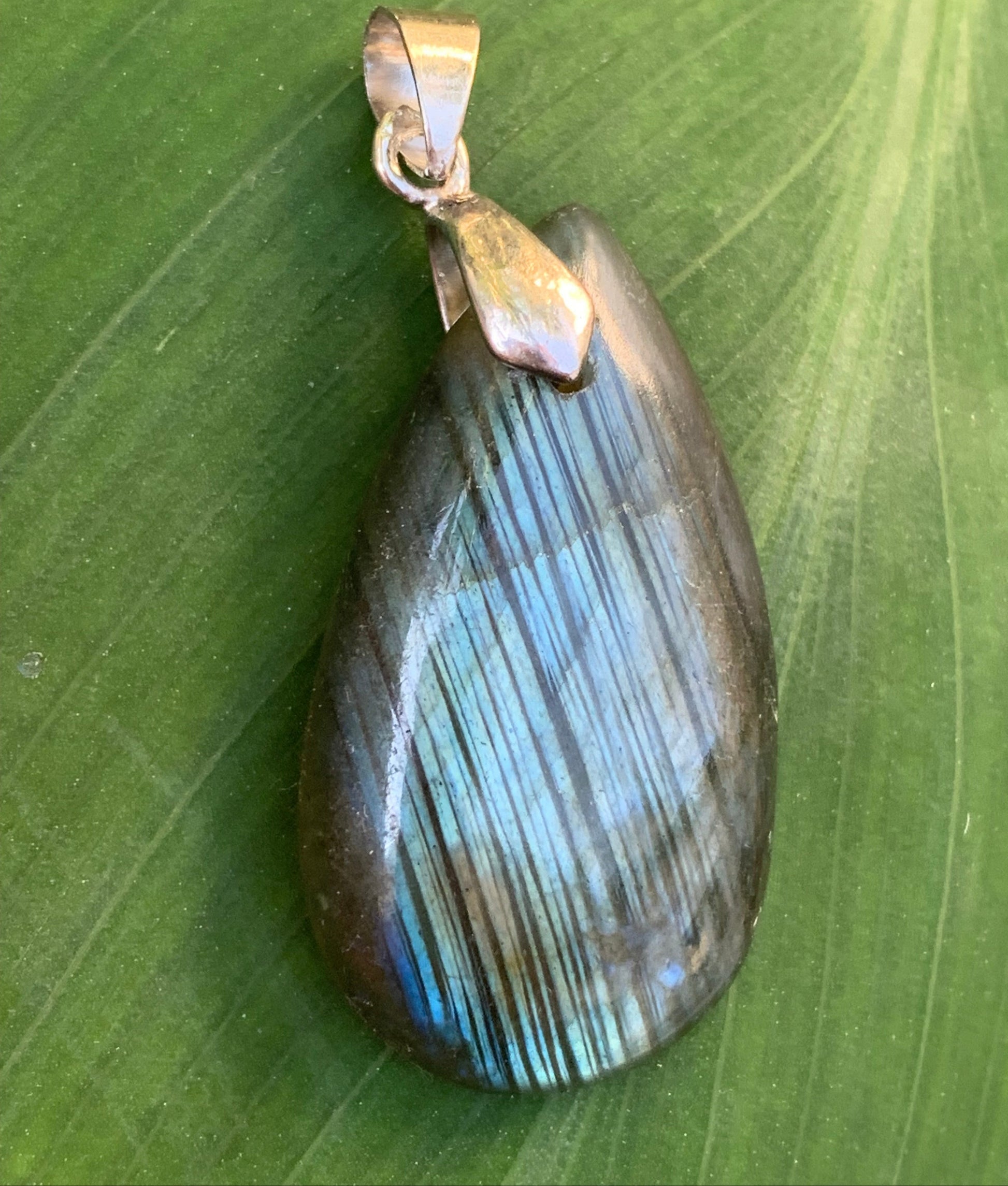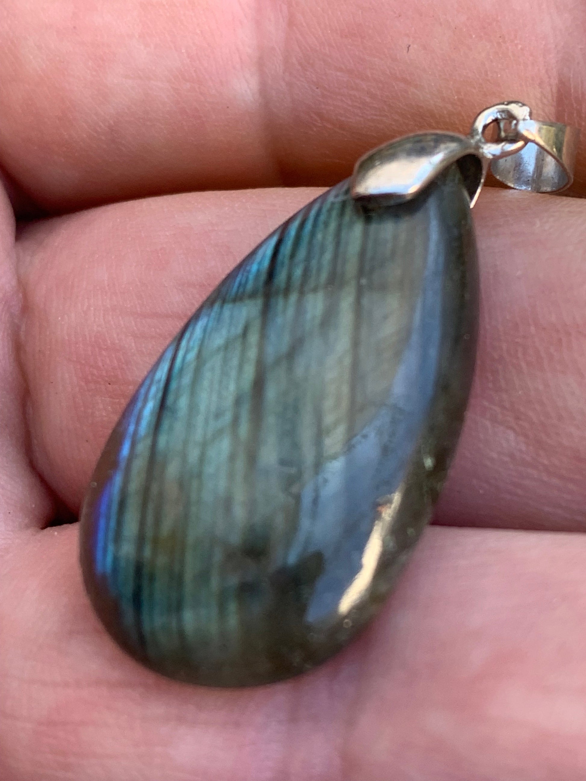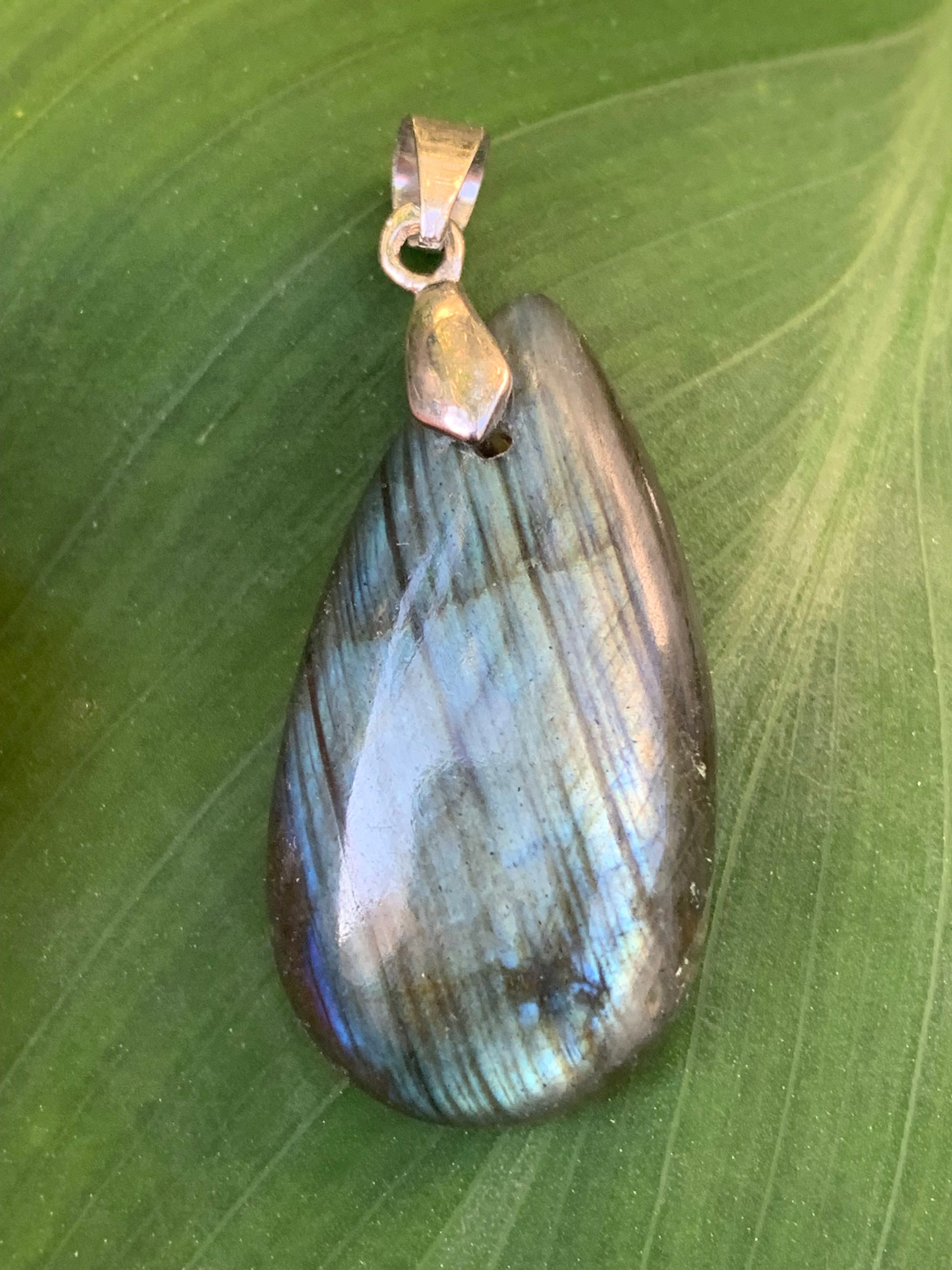 Labradorite, pendentif 'cabochon percé' de 42mm x 18 x 6. Qualité A à AA, vendu avec cordon réglable de couleur noire !