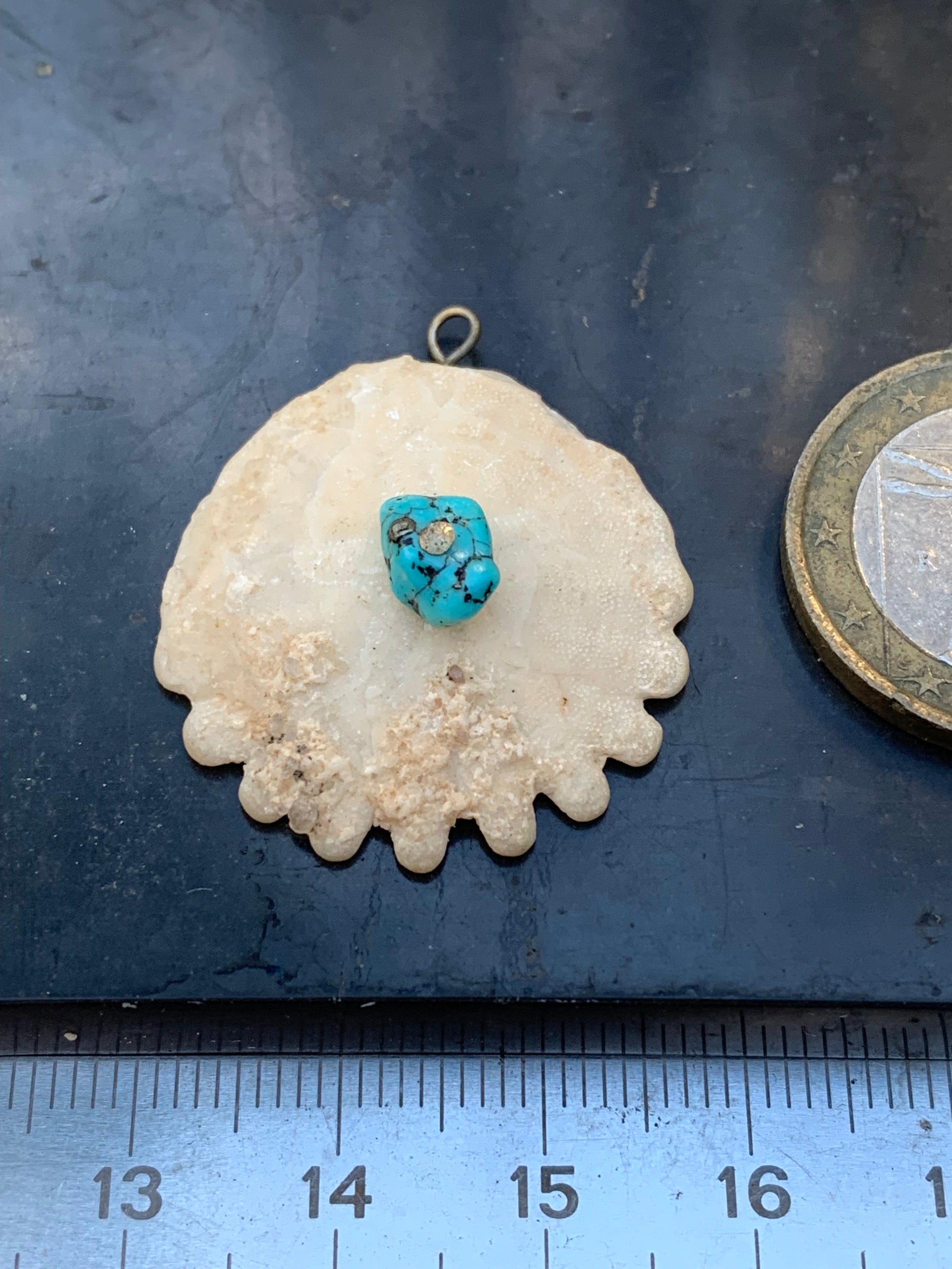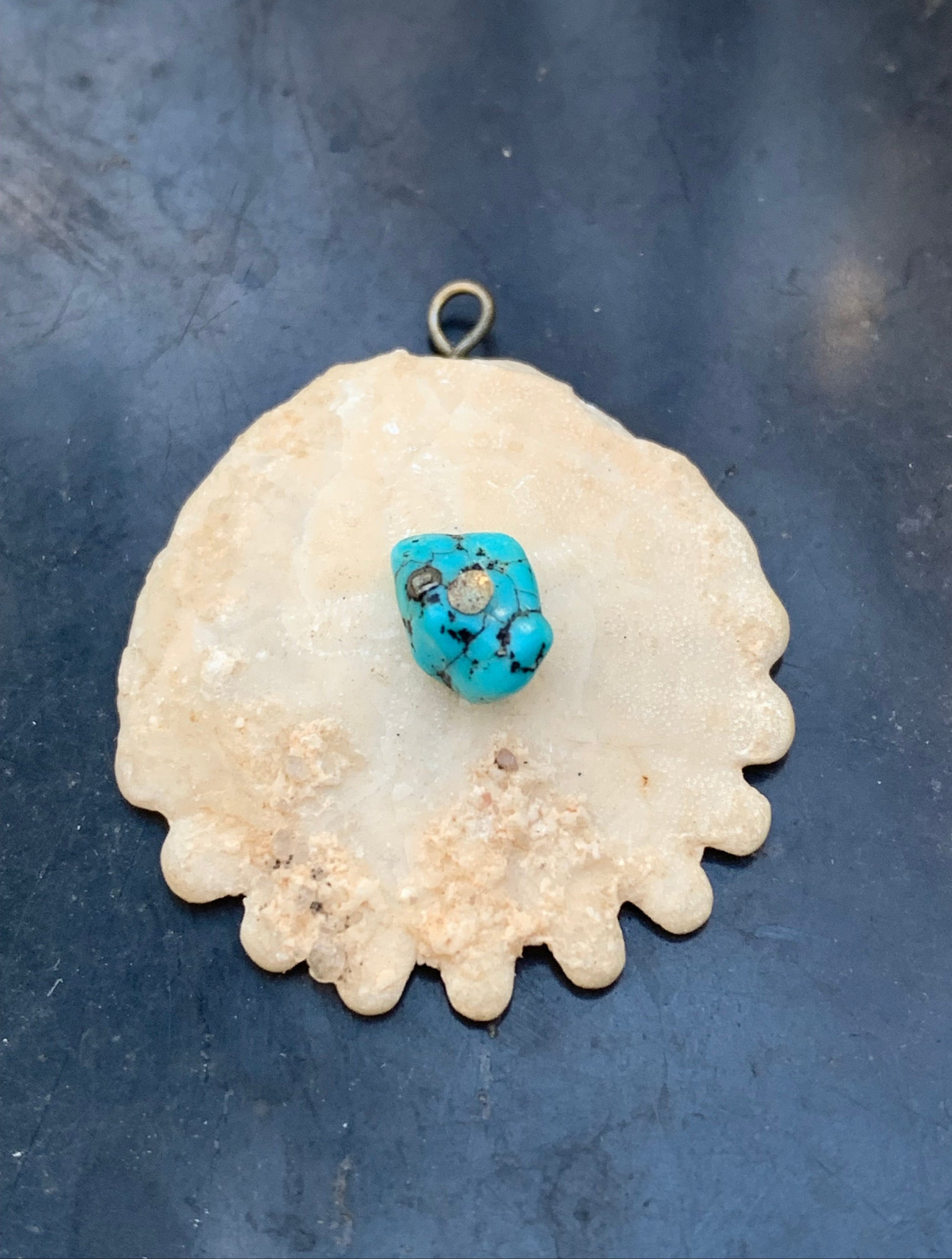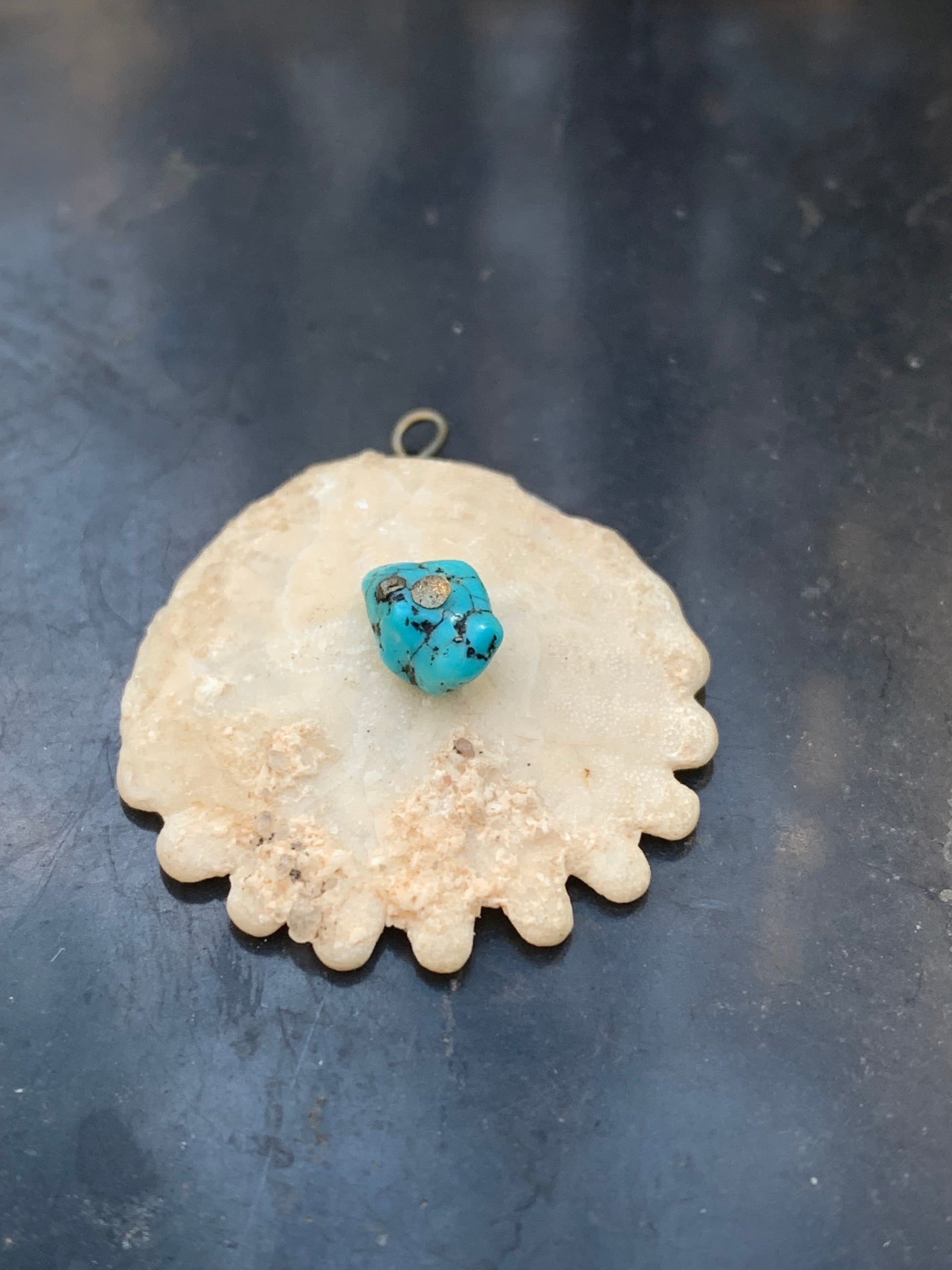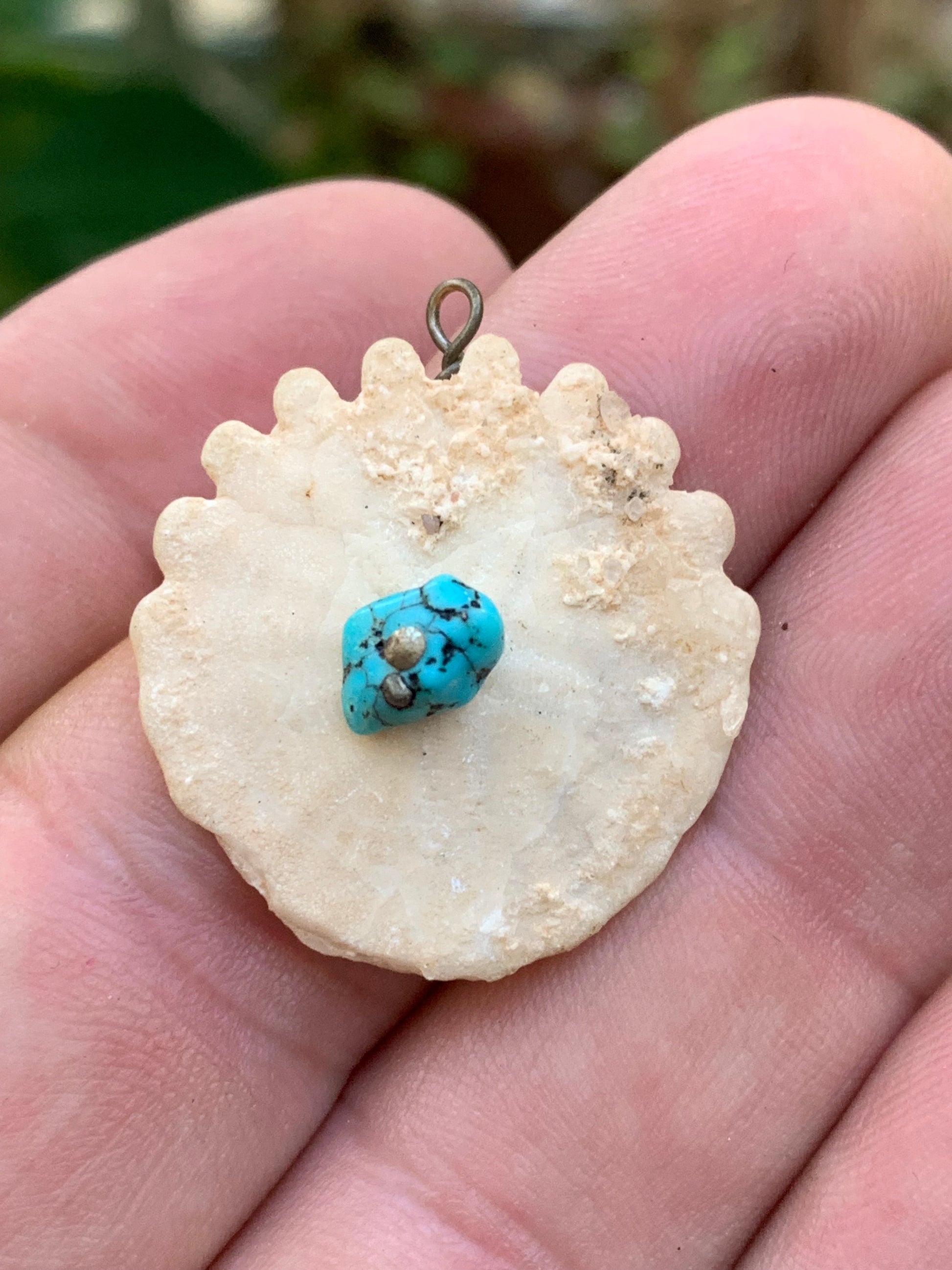 Vertus (synergie) | - Oursin fossile : mémoire ancestrale, stabilité, rappel des cycles de vie - Turquoise : protection, communication, chance, purification énergétique |