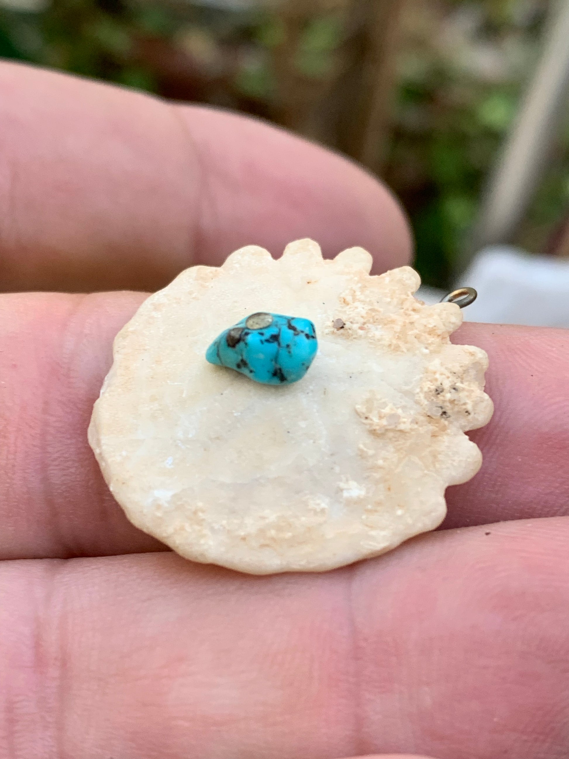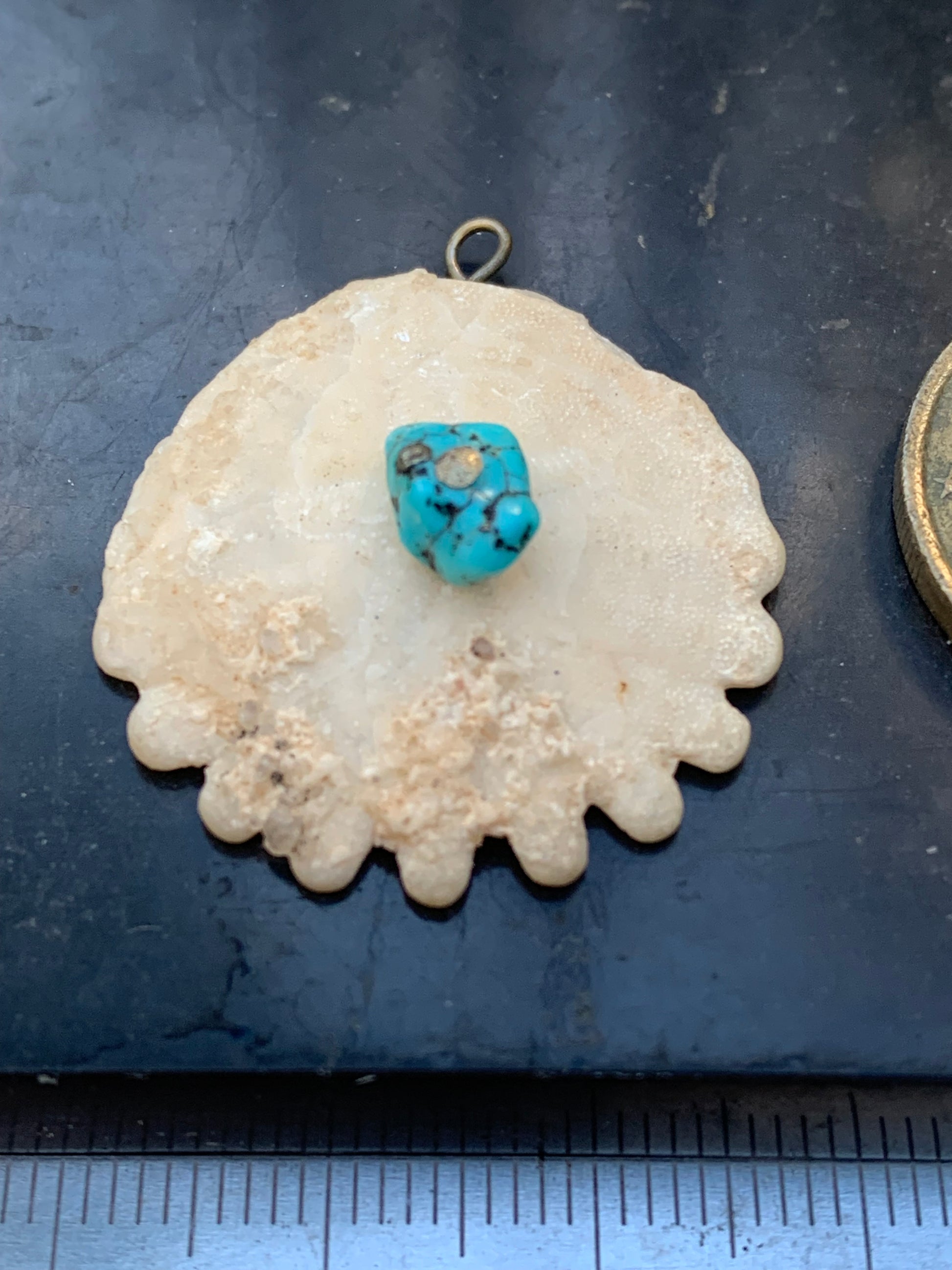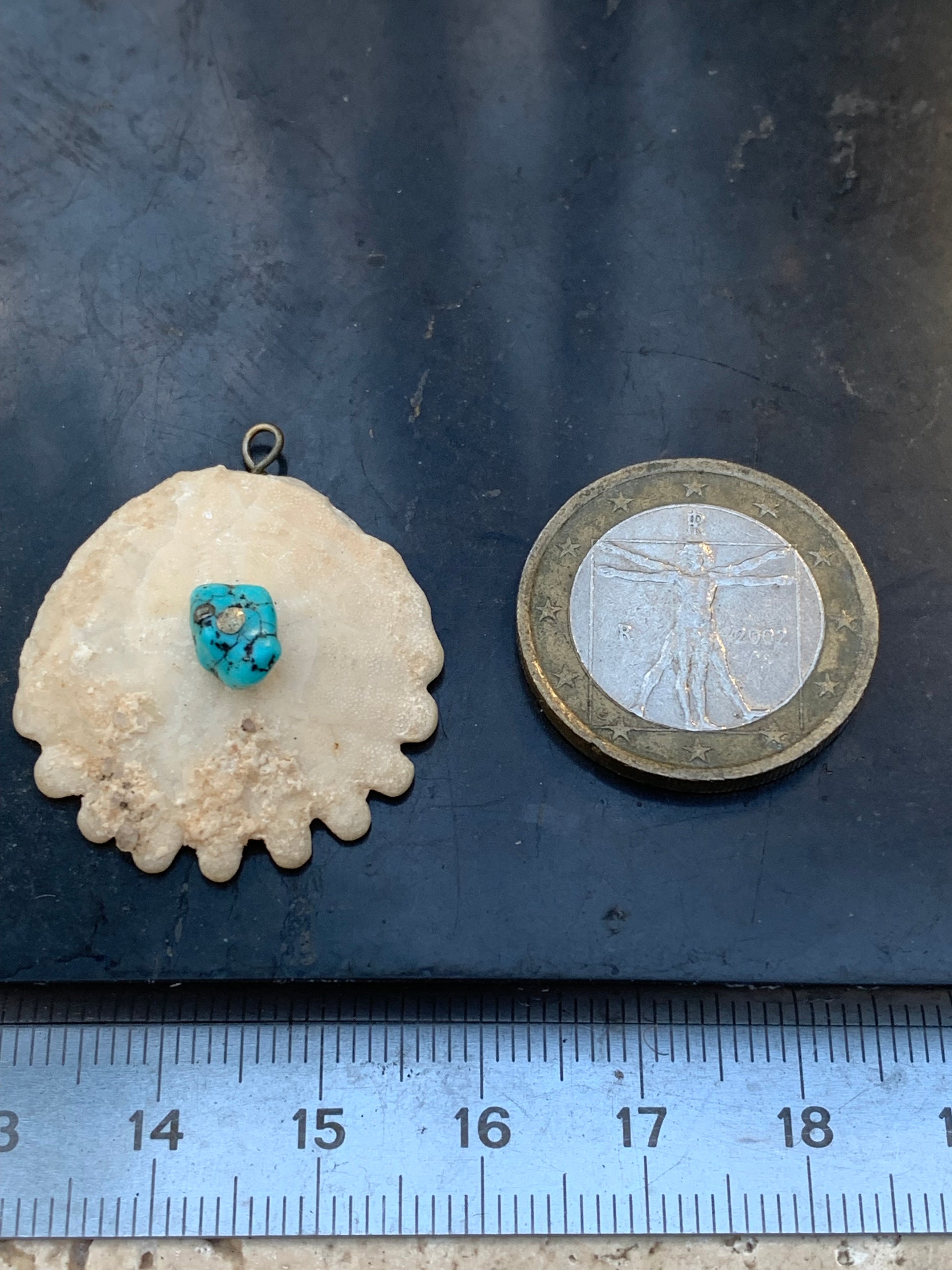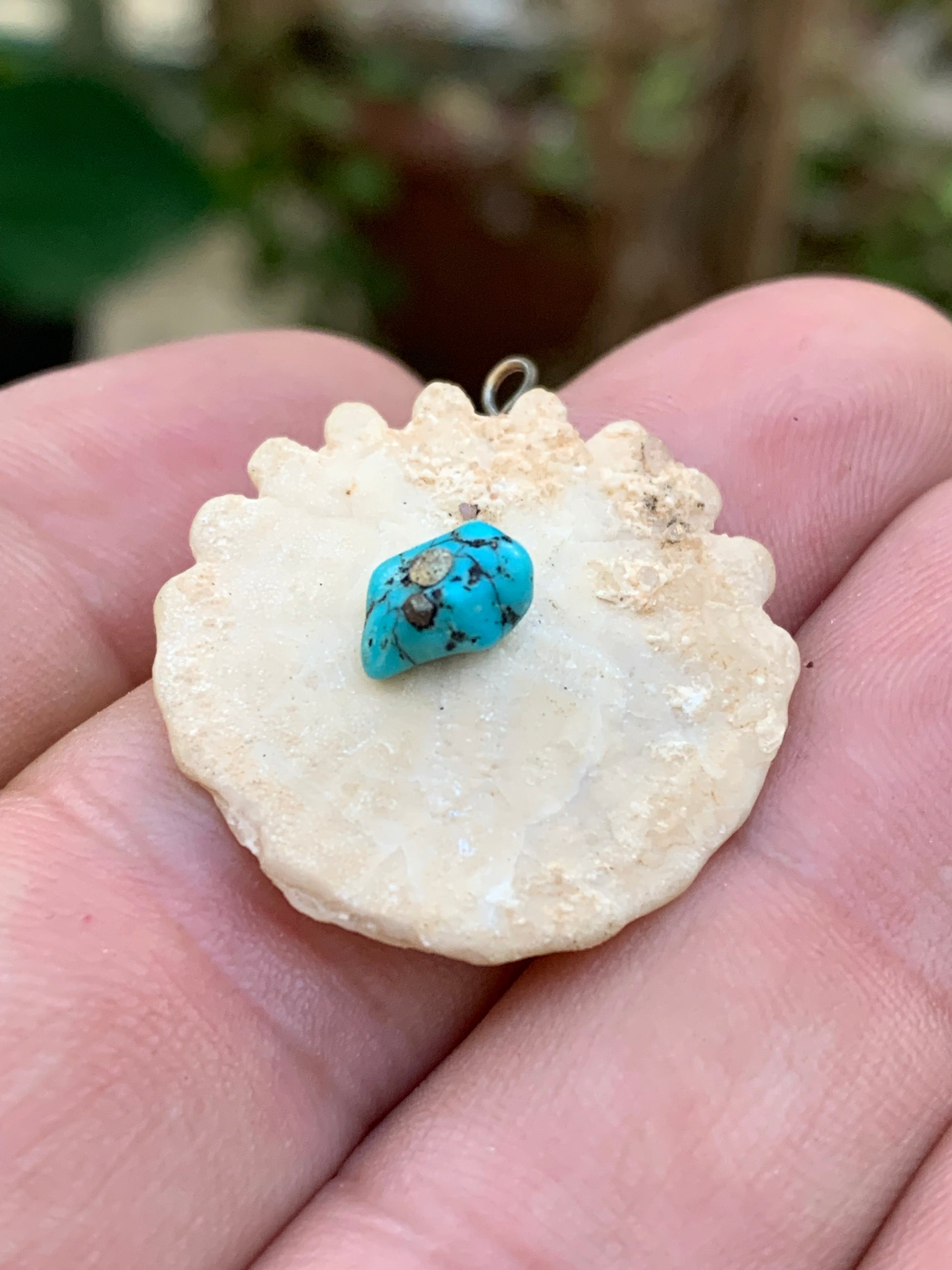 Vertus (synergie) | - Oursin fossile : mémoire ancestrale, stabilité, rappel des cycles de vie - Turquoise : protection, communication, chance, purification énergétique |