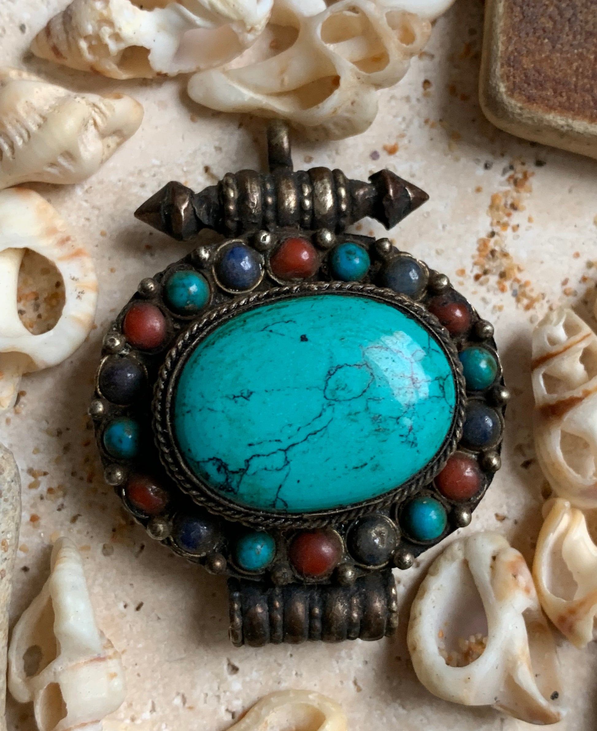 Pendentif/ Reliquaire artisanal du Népal avec pierres de turquoise et de corail sertis sur métal ! De 48 millimètres de hauteur x 37 mm de largeur x 18 d'épaisseur. Vendu avec cordon noir réglable offert, parfait !