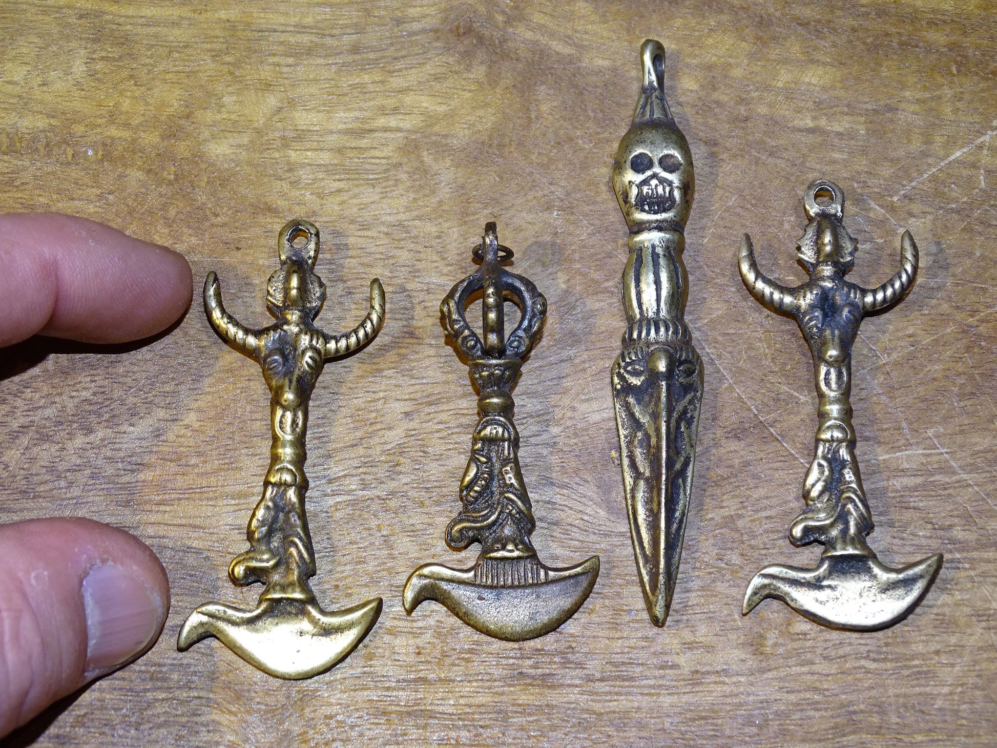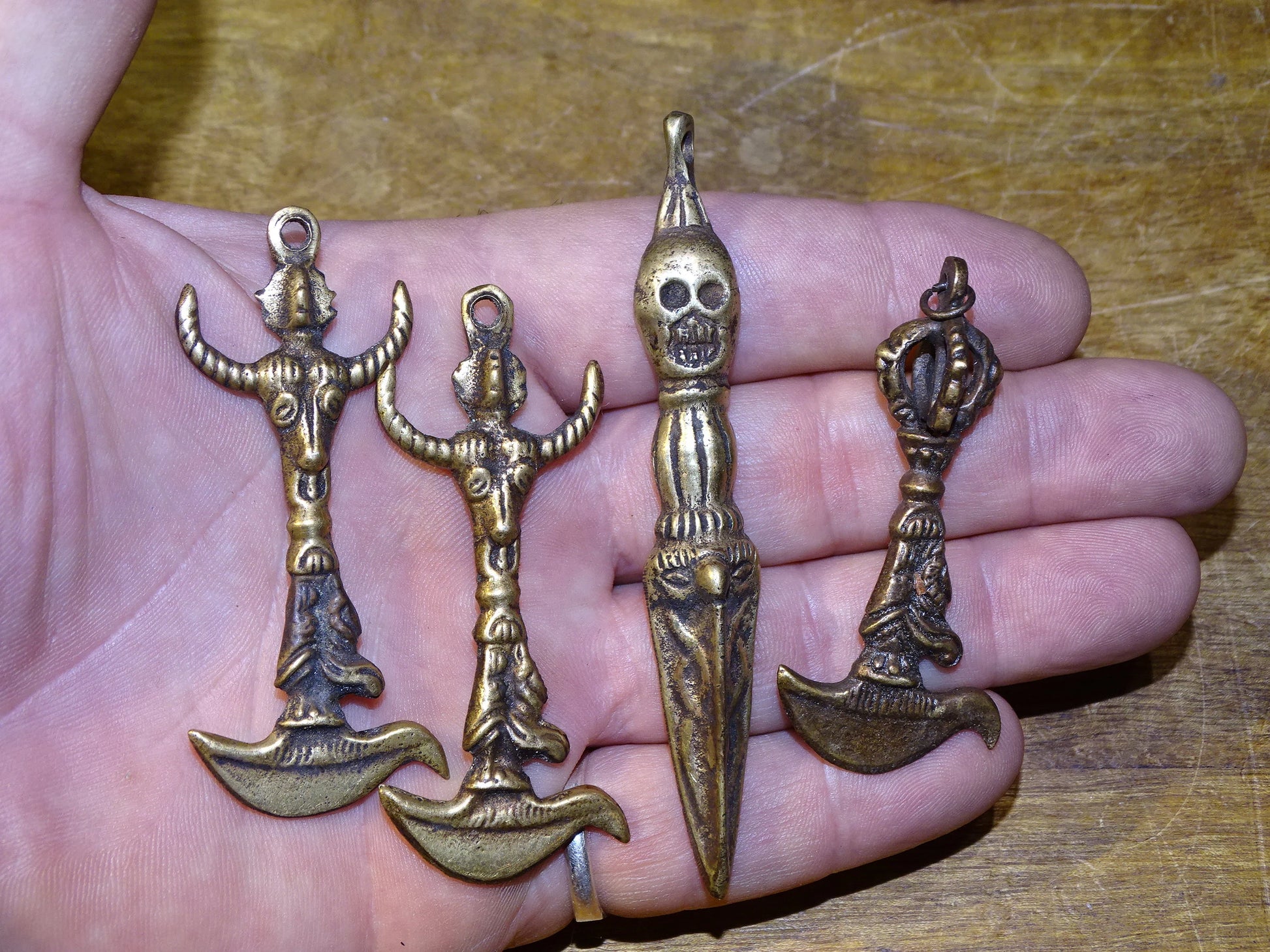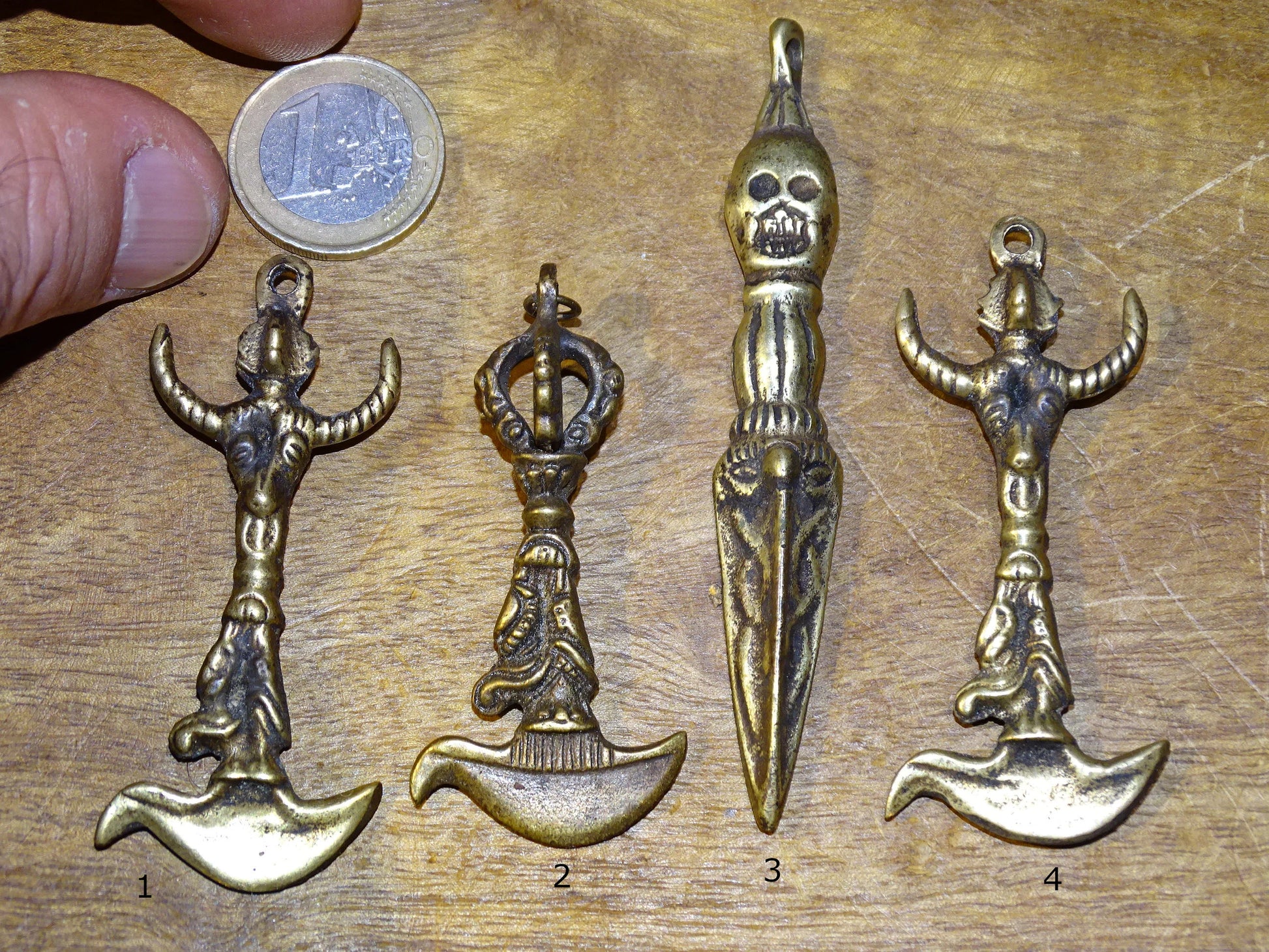 Pendentifs 'Phurba' en bronze, 4 modèles au choix, superbes pièces anciennes de 7 à 8 centimètres ! Magnifiques pièces de l'artisanat du Népal ou Tibet, des outils de rituels sacrés du Bouddhisme !
