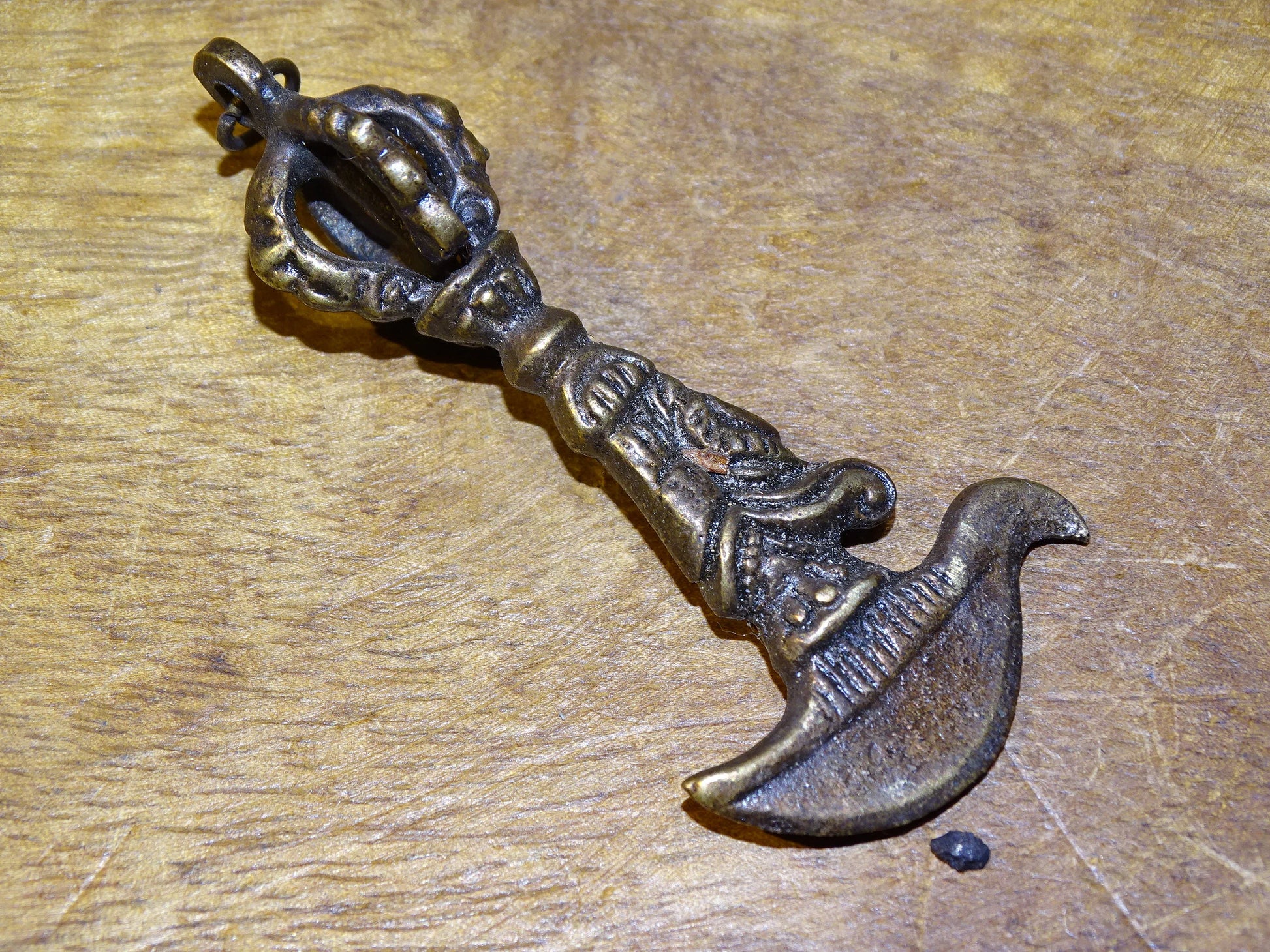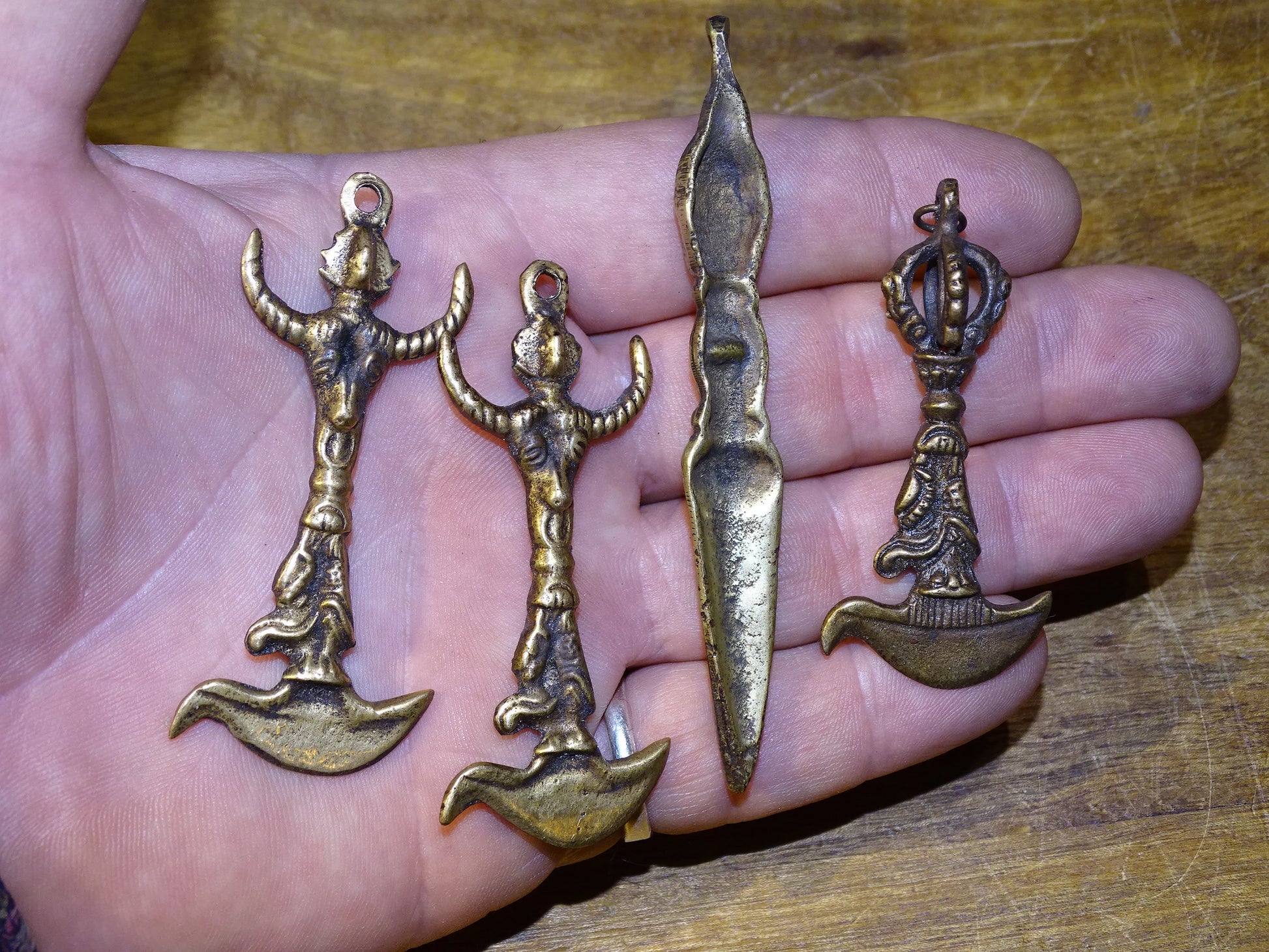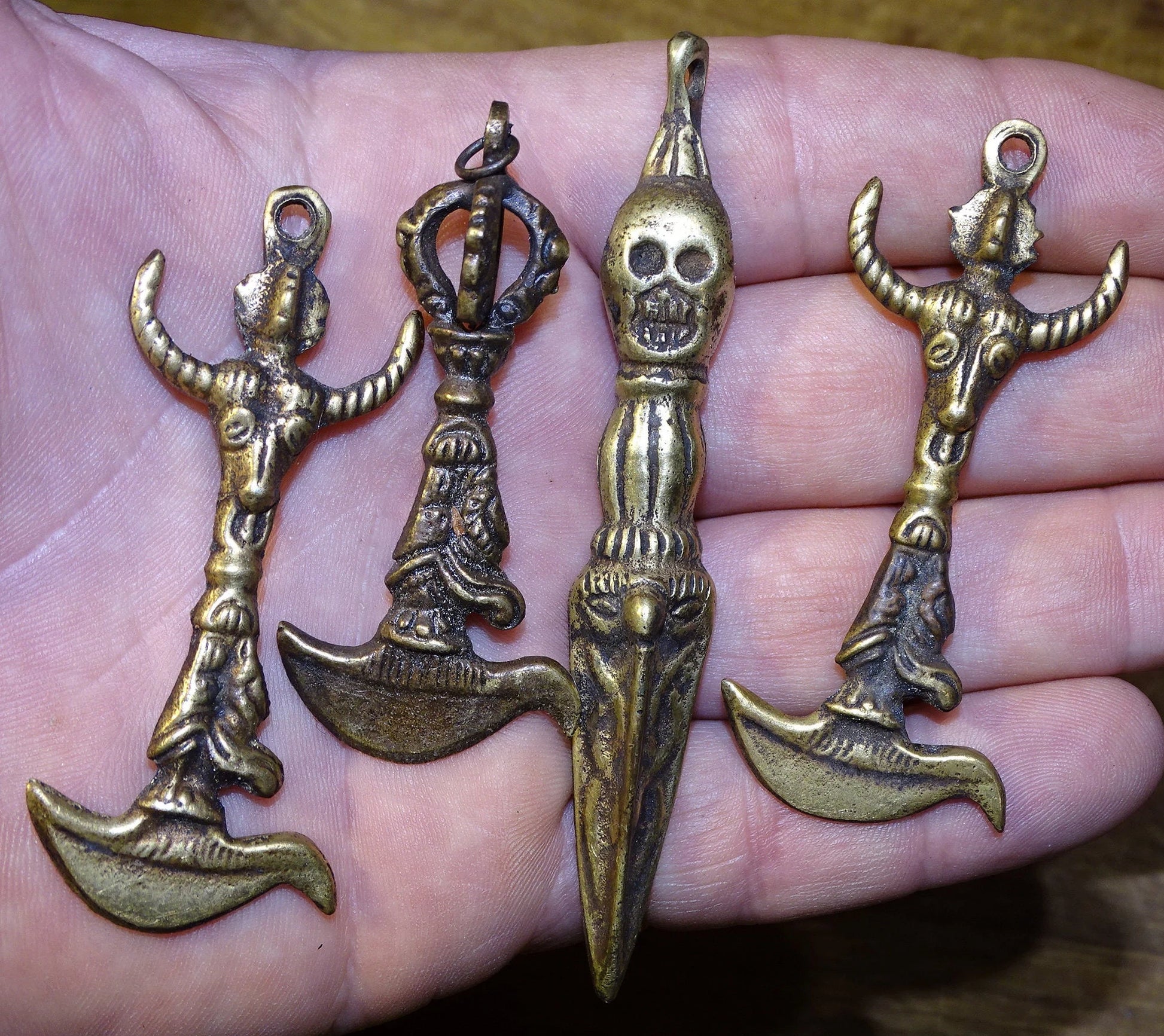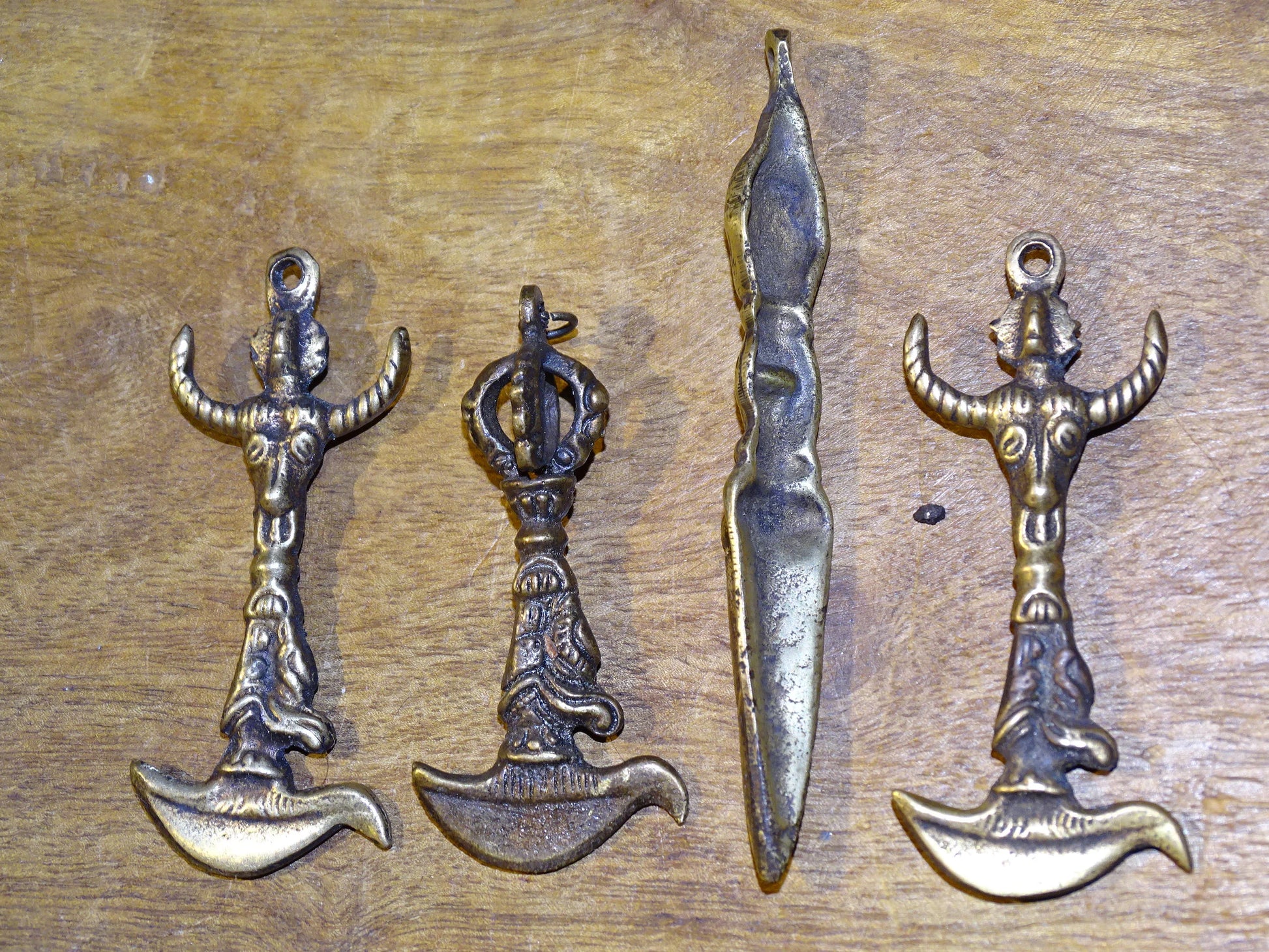 Pendentifs 'Phurba' en bronze, 4 modèles au choix, superbes pièces anciennes de 7 à 8 centimètres ! Magnifiques pièces de l'artisanat du Népal ou Tibet, des outils de rituels sacrés du Bouddhisme !