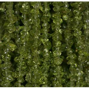 Péridot, bracelet de 17 à 21 cm, collier de 42 cm et sautoir de 85 cm. Perle de type 'baroque/ chips' de formes naturelles montées sur fil élastique ou fil d'acier de haute résistance !