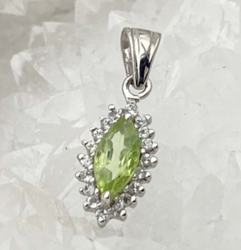 Péridot | Collection Retro' | Pendentif en Argent serti d'une pierre gemme en forme de 'navette', entouré d'Oxyde, 19 x 7 mm !