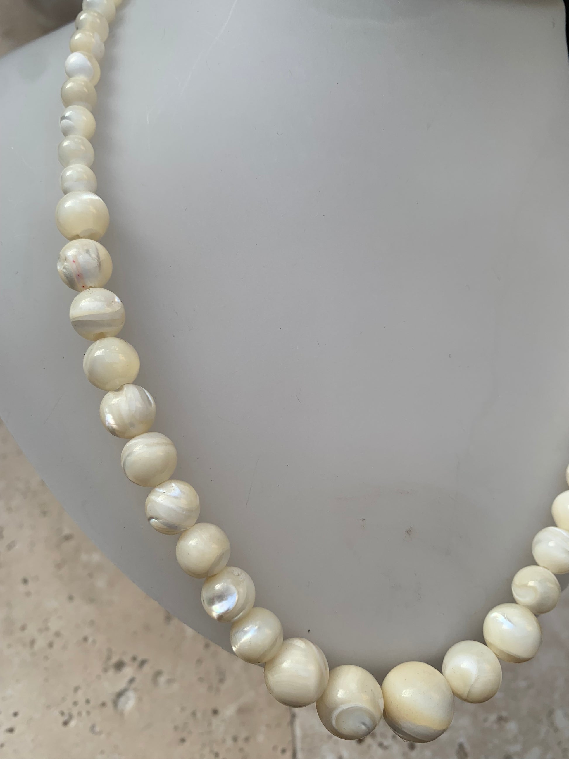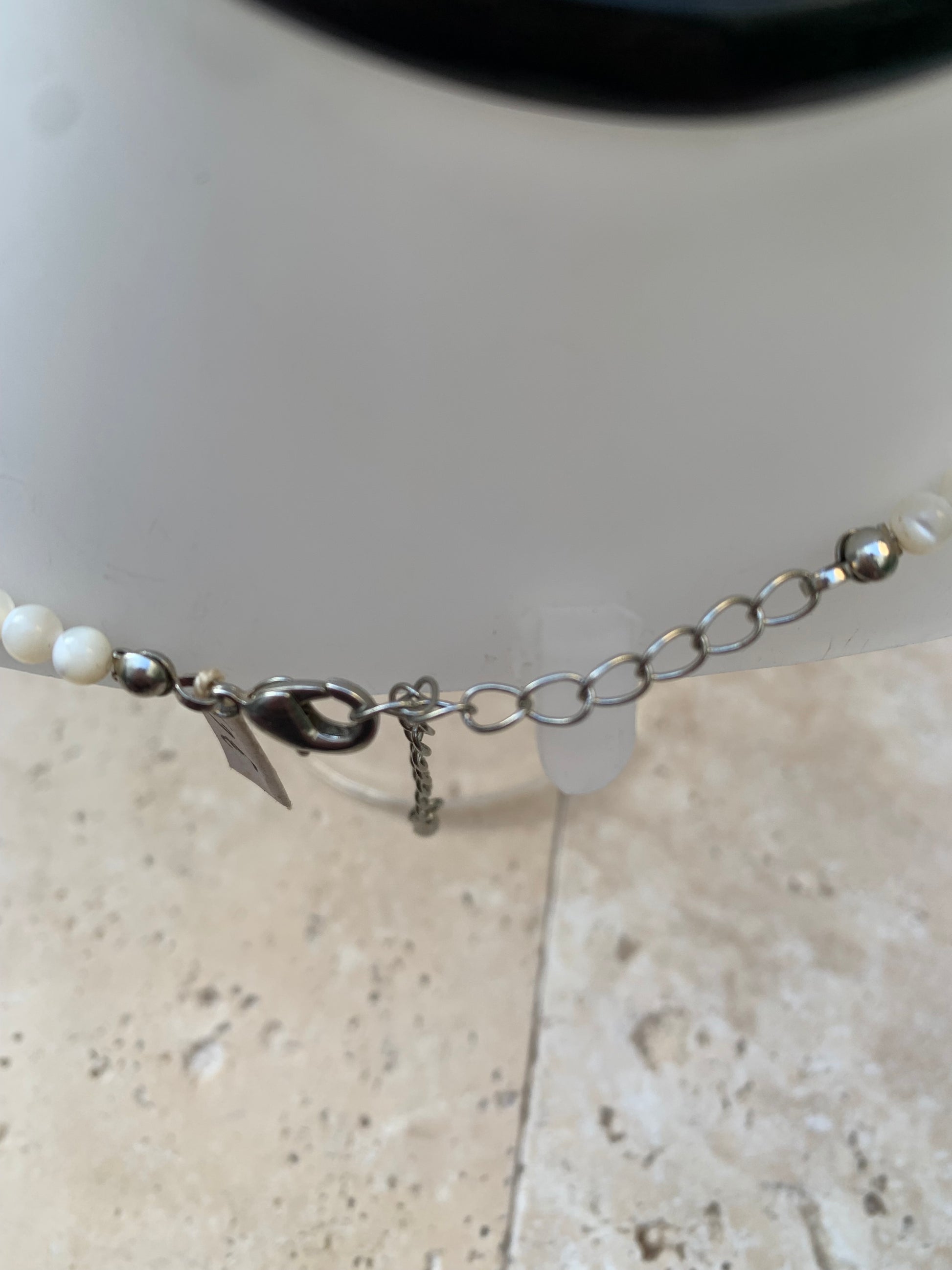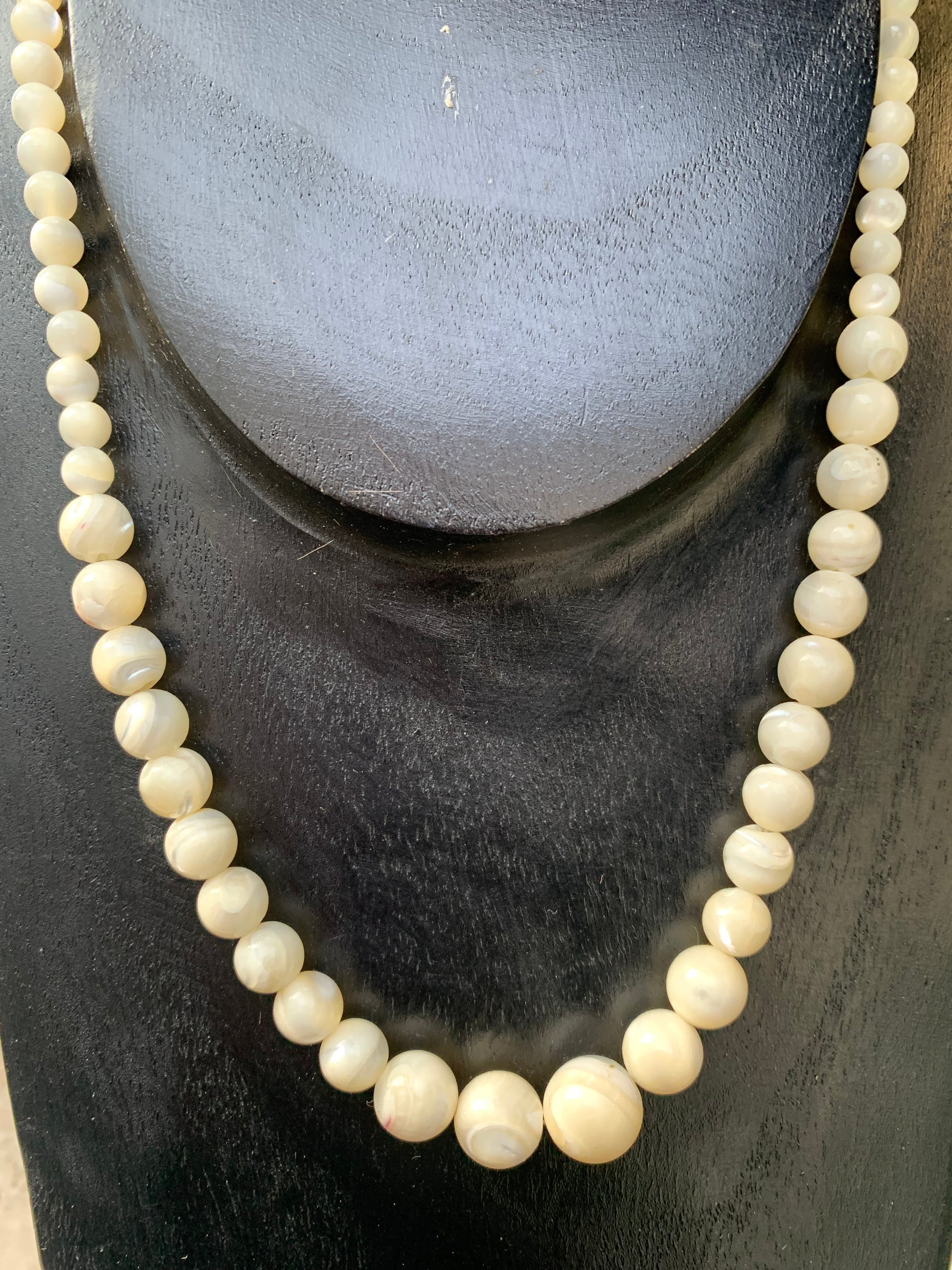 Perle de culture, 'collier/ chute de perle', de forme ronde de 4 à 10 millimètres de diamètre. 44 centimètres de longueur + 4 cm de rajout en chaînette. Fermoir de type 'mousqueton'. Très belle pièce !