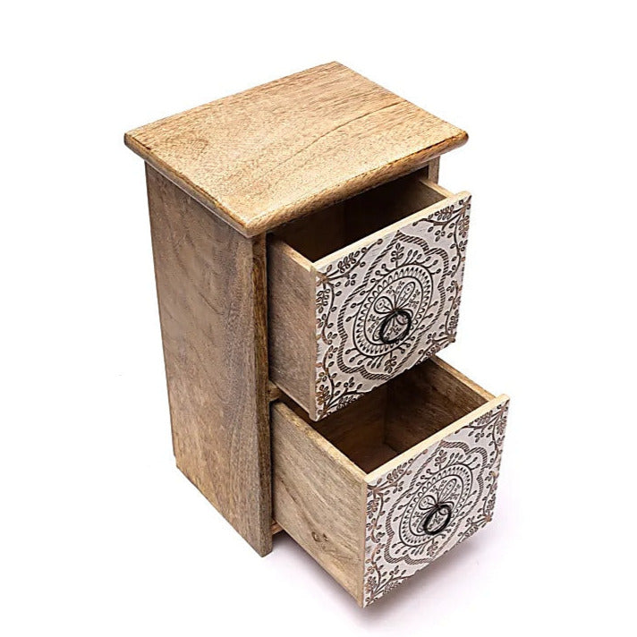 Placard à 2 tiroirs avec impression d'un Mandala de couleur blanche. Taille 15x31 cm - 1810 grammes. Adorable petit meuble !