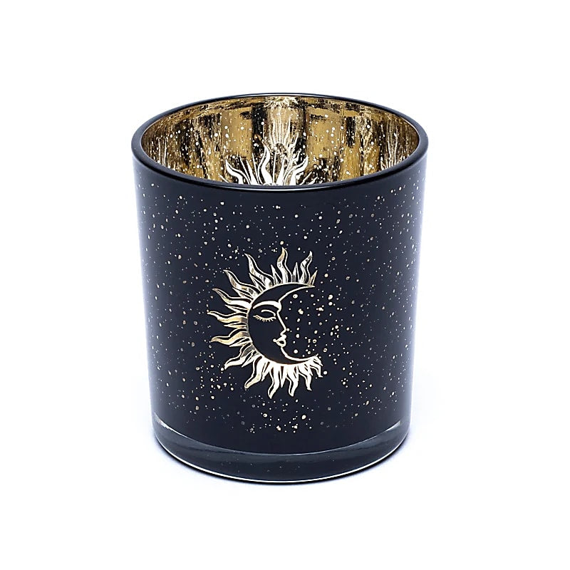 Photophore/ bougeoir, finition 'givré' avec jolis motifs de la lune et du soleil, taille de 10x12.5 cm - 500 gr. - Convient aux bougies chauffe plat et jusqu'à 4 cm environ !
