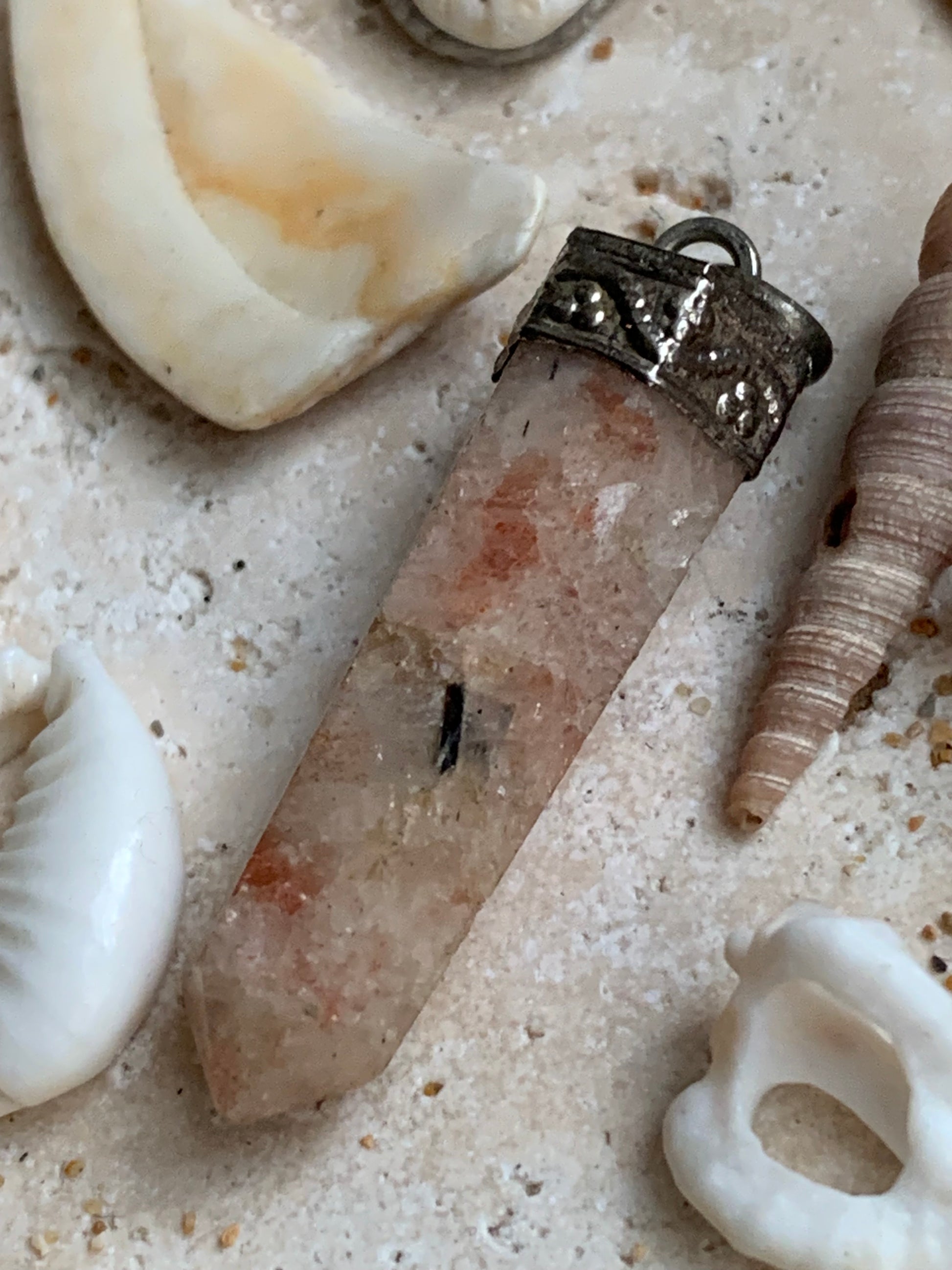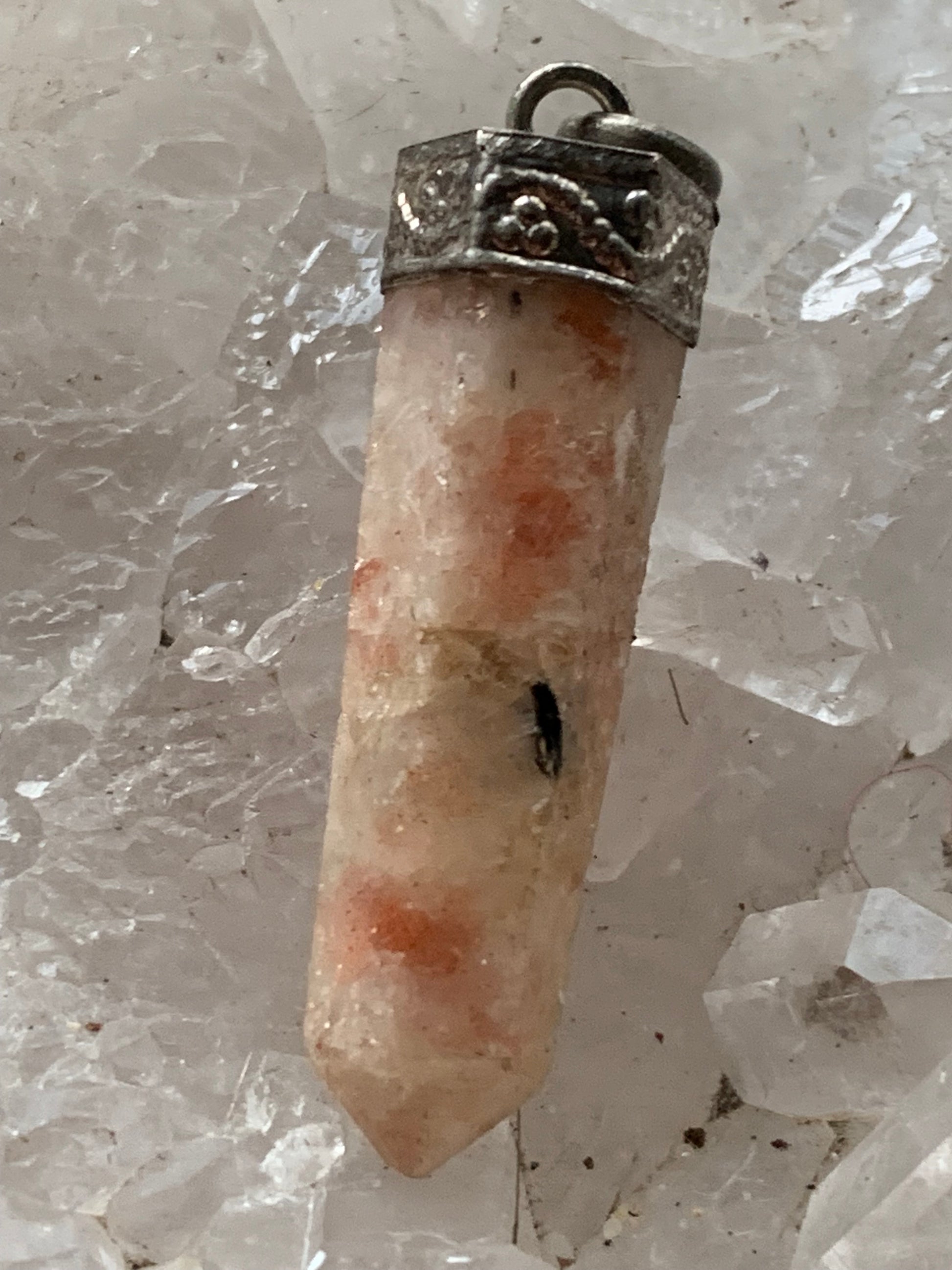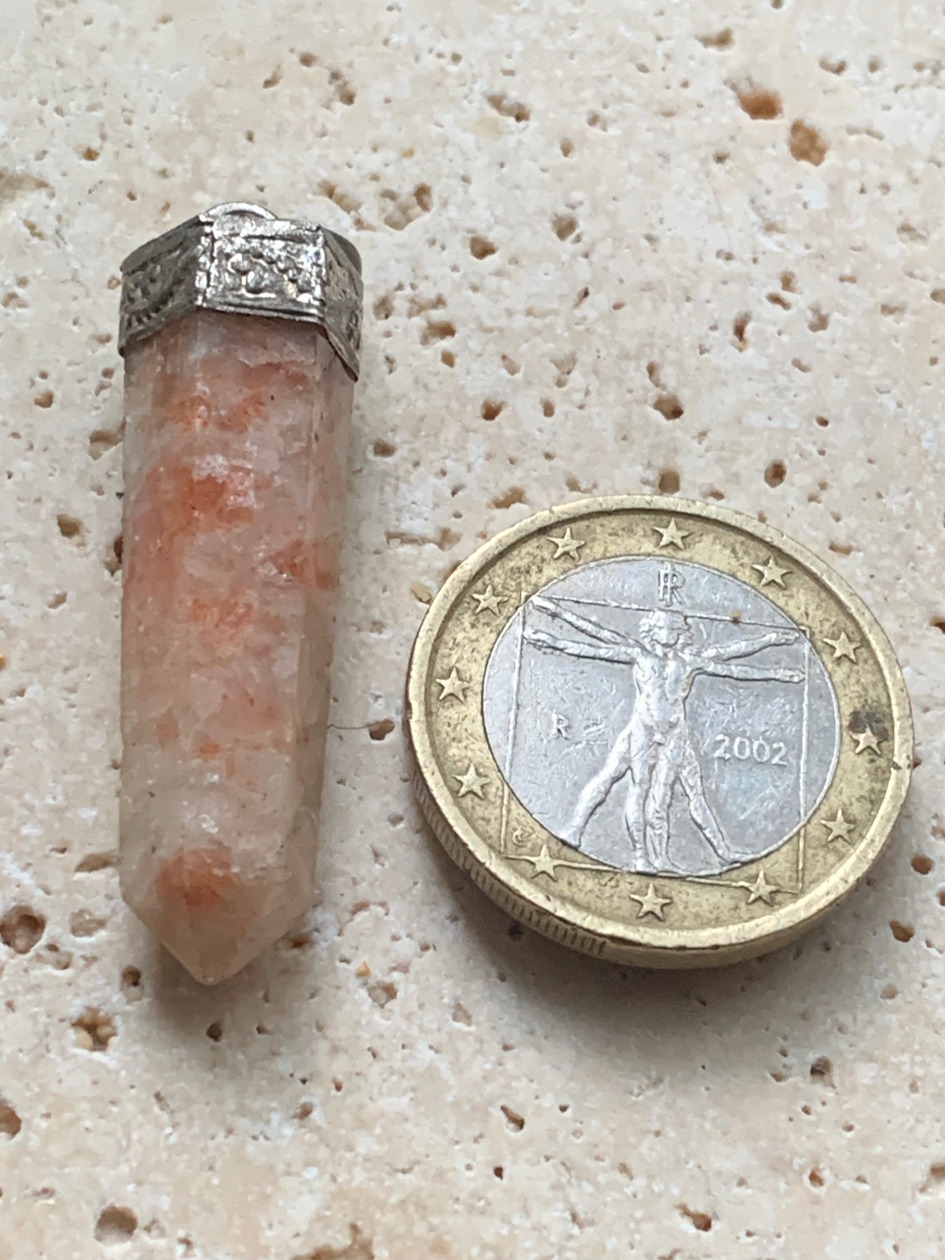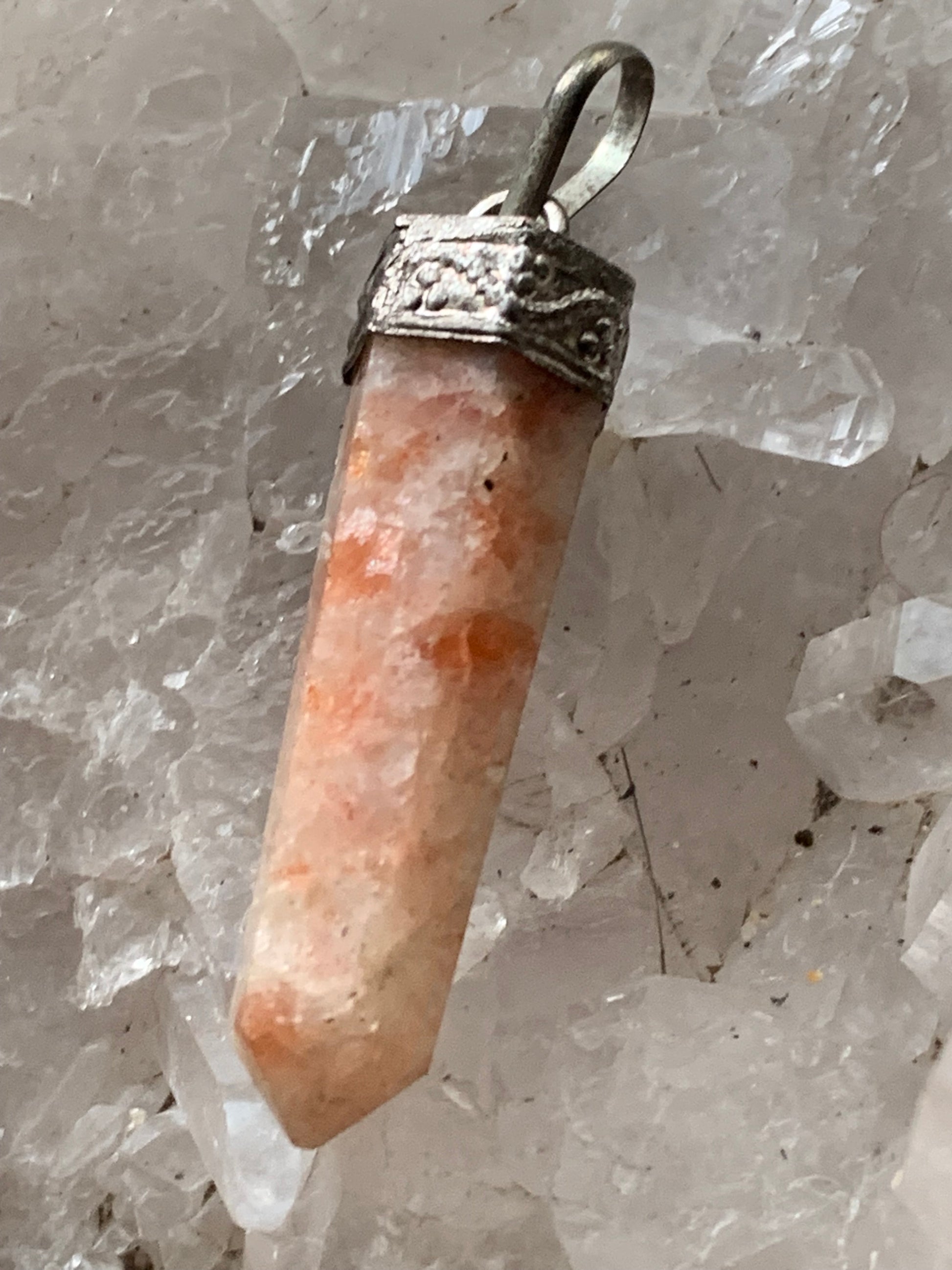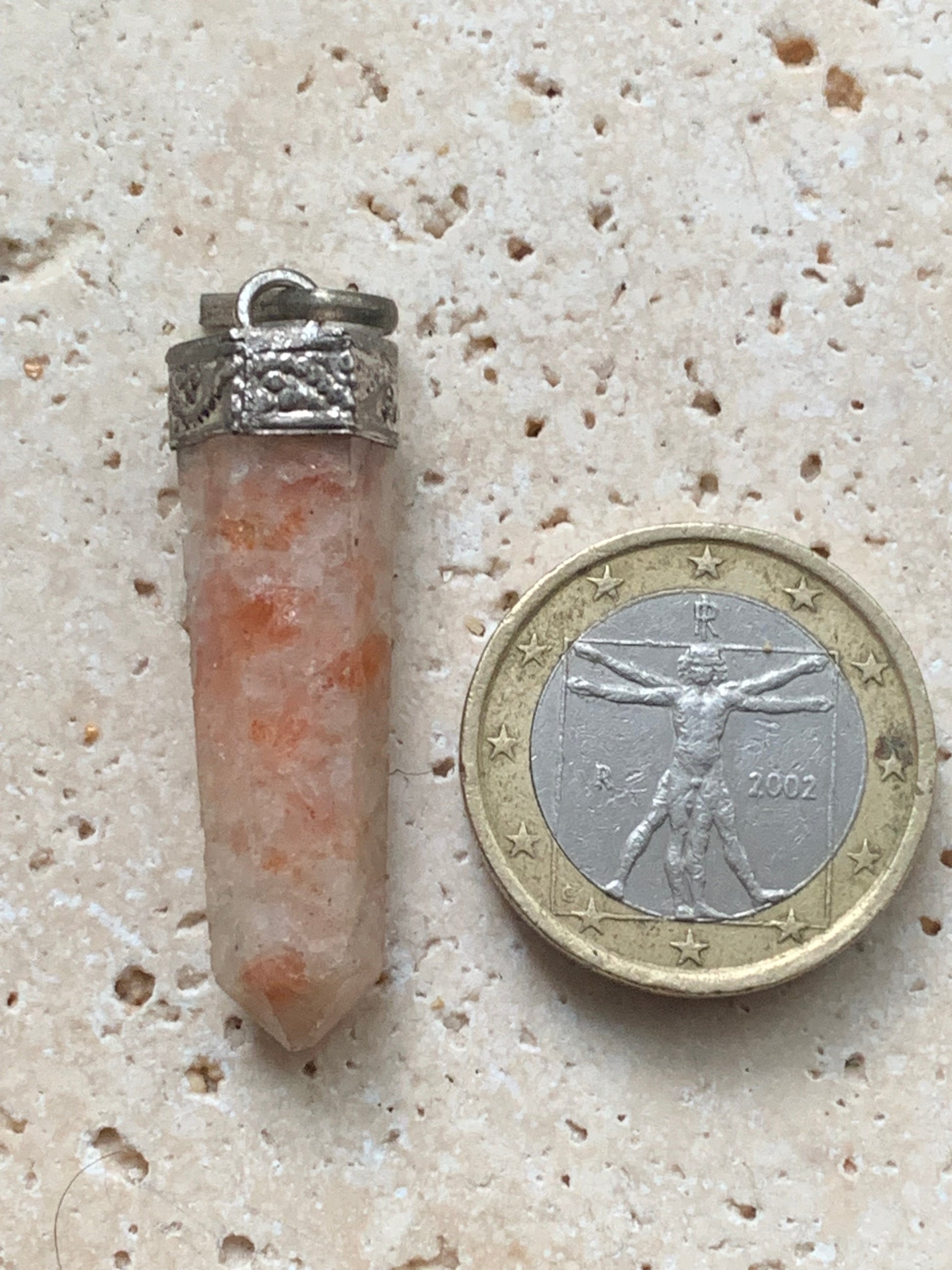Pierre du soleil, pendentif de 44mm x 10 x 10 d'épaisseur. Fait sur métal (laiton), finition argenté. Vendu avec cordon réglable de couleur noire !