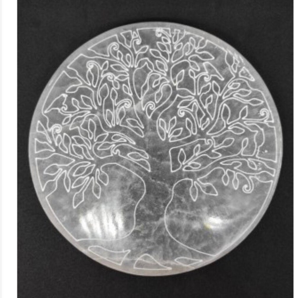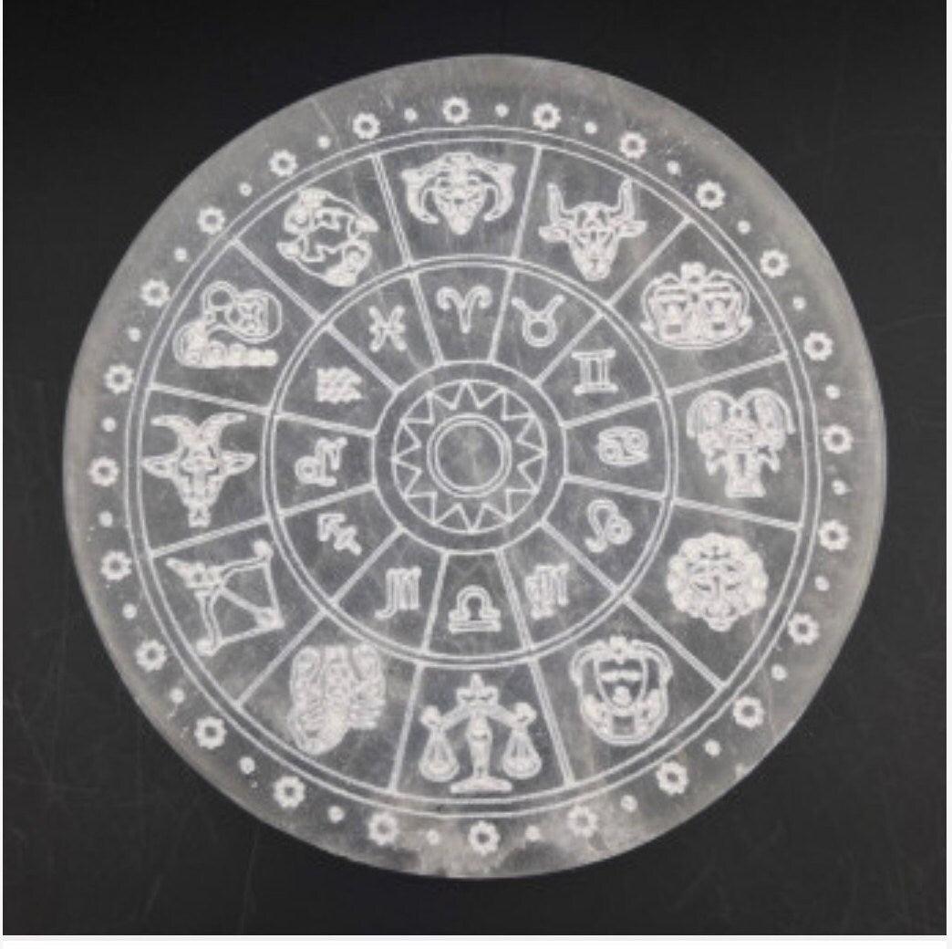 Disques en sélénite gravés – Arbre de Vie, Fleur de Vie, Yin Yang, Horoscope ou Métatron – 2 tailles : 10 ou 15 cm – Idéal pour recharger les minéraux !