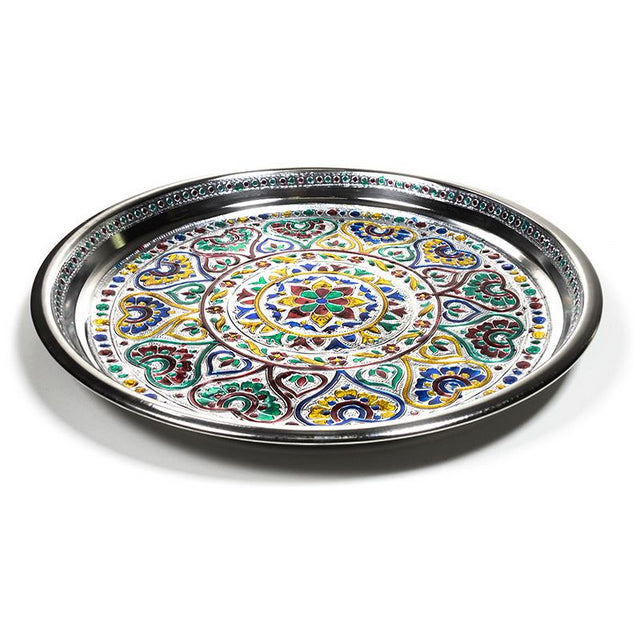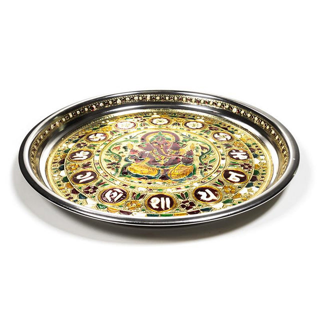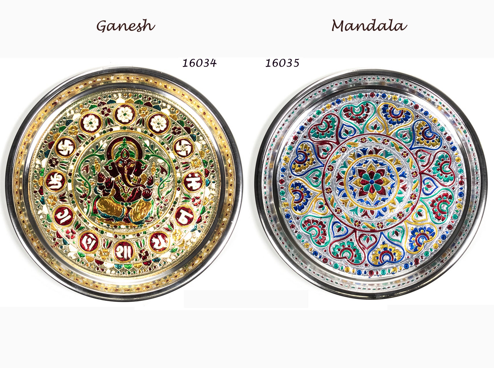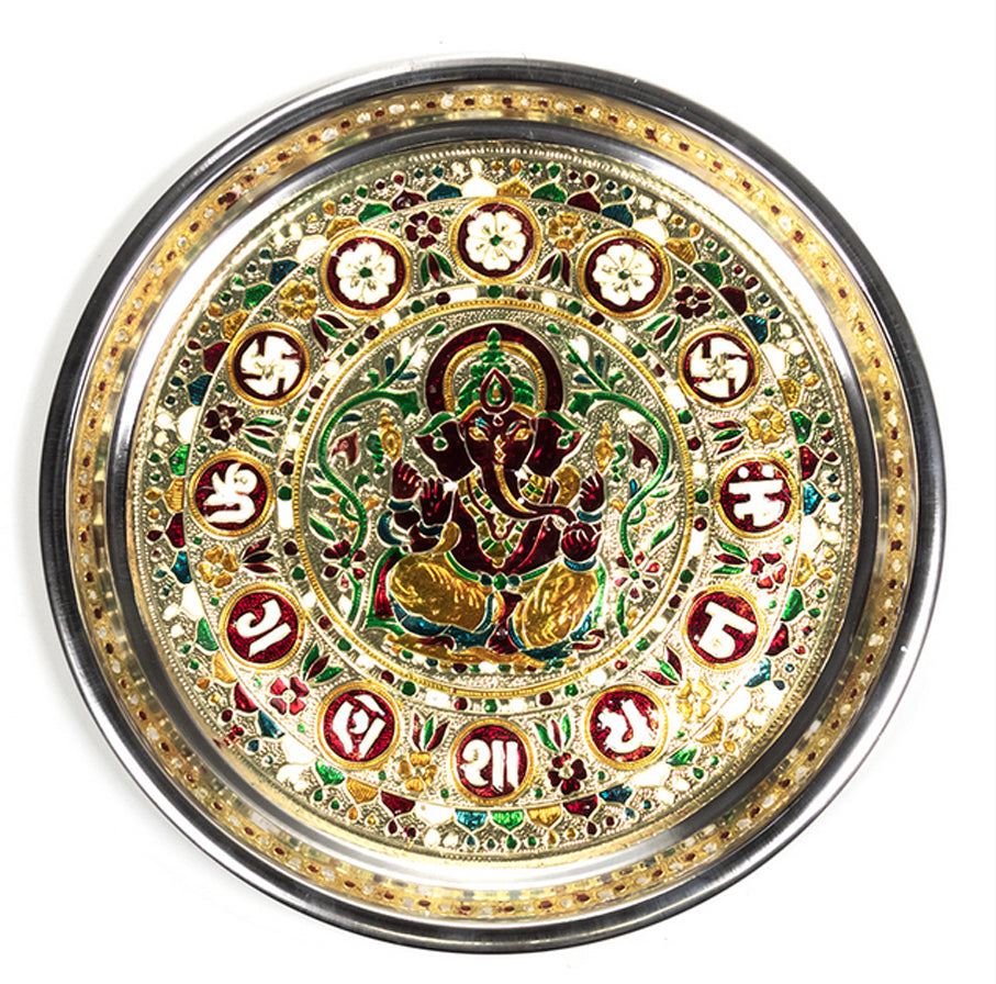Plateaux d'offrandes en acier inoxydable avec gravures de Ganesh ou Mandala, taille de 28x2,5 cm - 300 gr. - Plat indien richement décoré, traditionnellement utilisé pour offrir des bougies, de l'encens, des fleurs, de la nourriture...