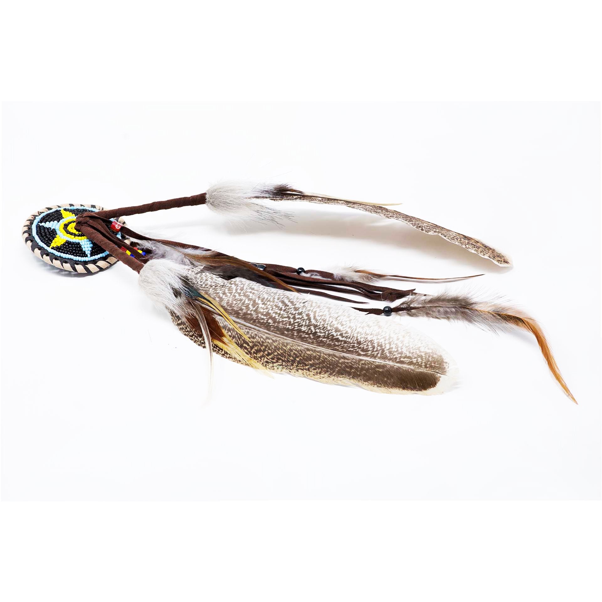 Code article : 301020 / Plume de dinde 28-30cm - Un bijou en perles et plumes de style amérindien. Composé de diverses plumes (principalement de dinde) attachées avec des cordons en daim à une broche en perles décorée dans le style Mandala.