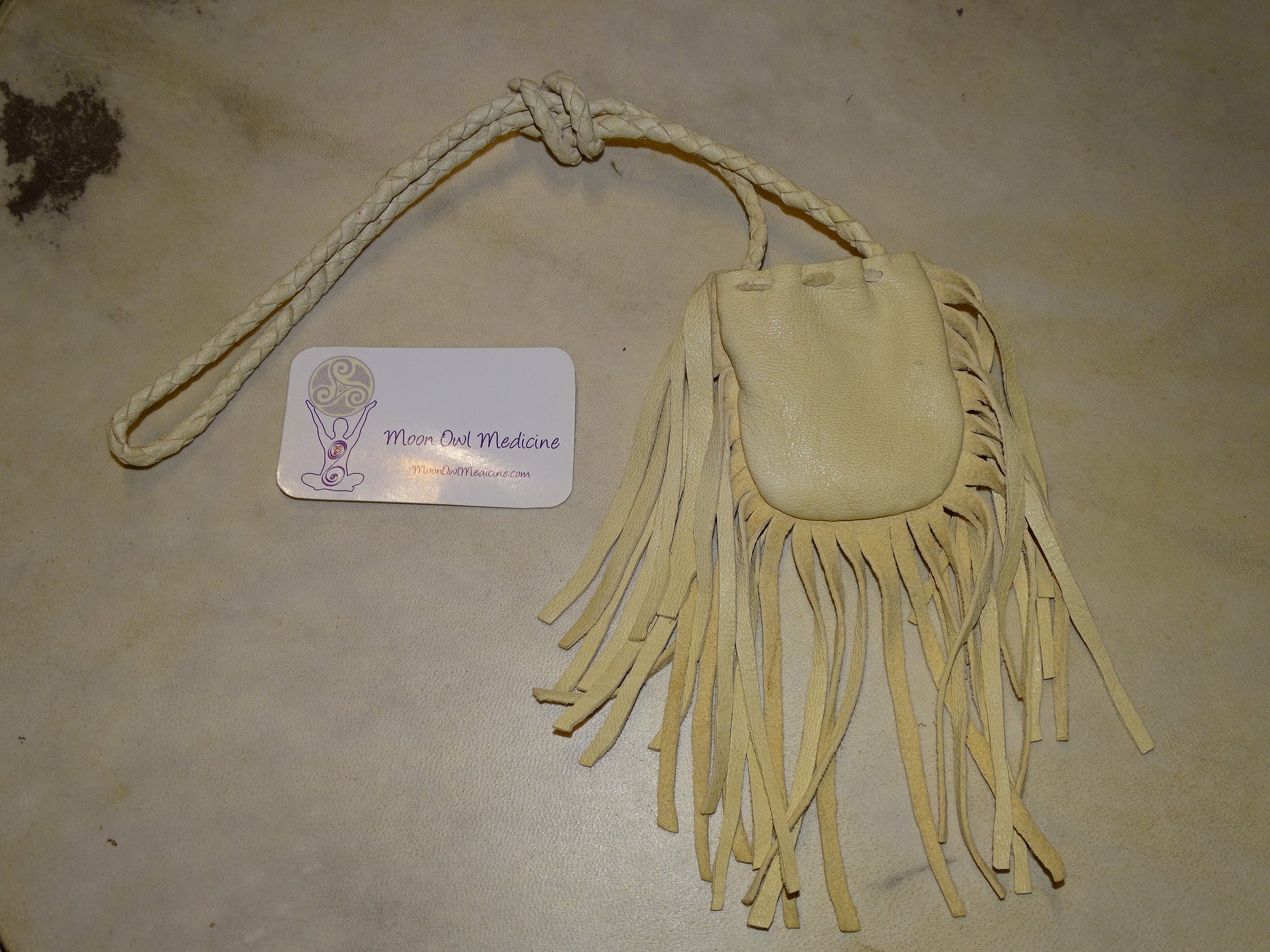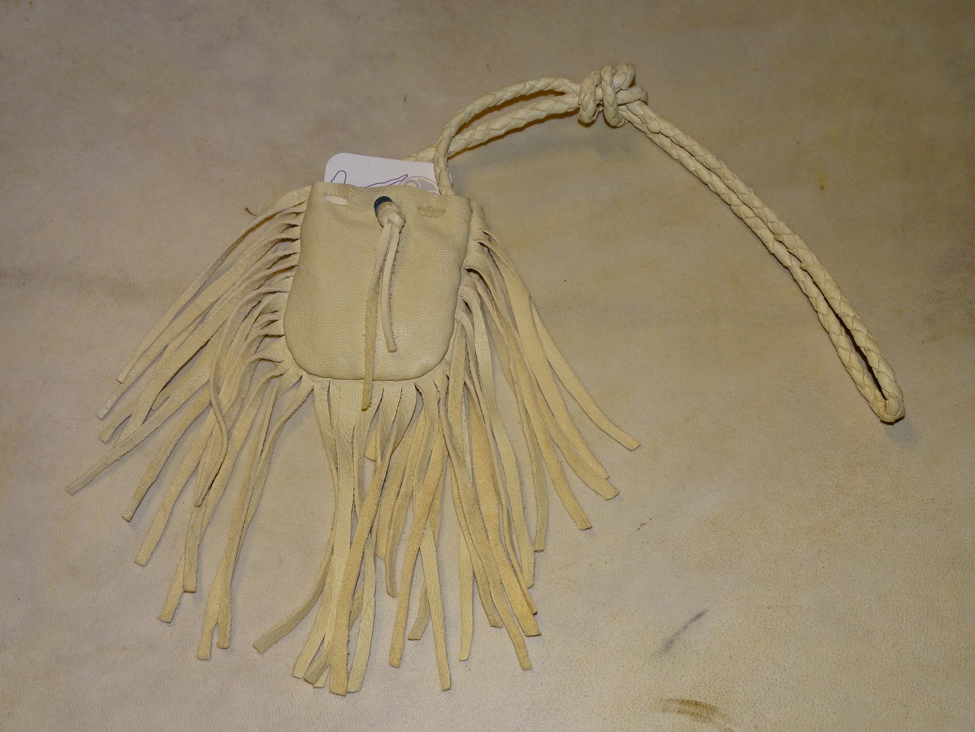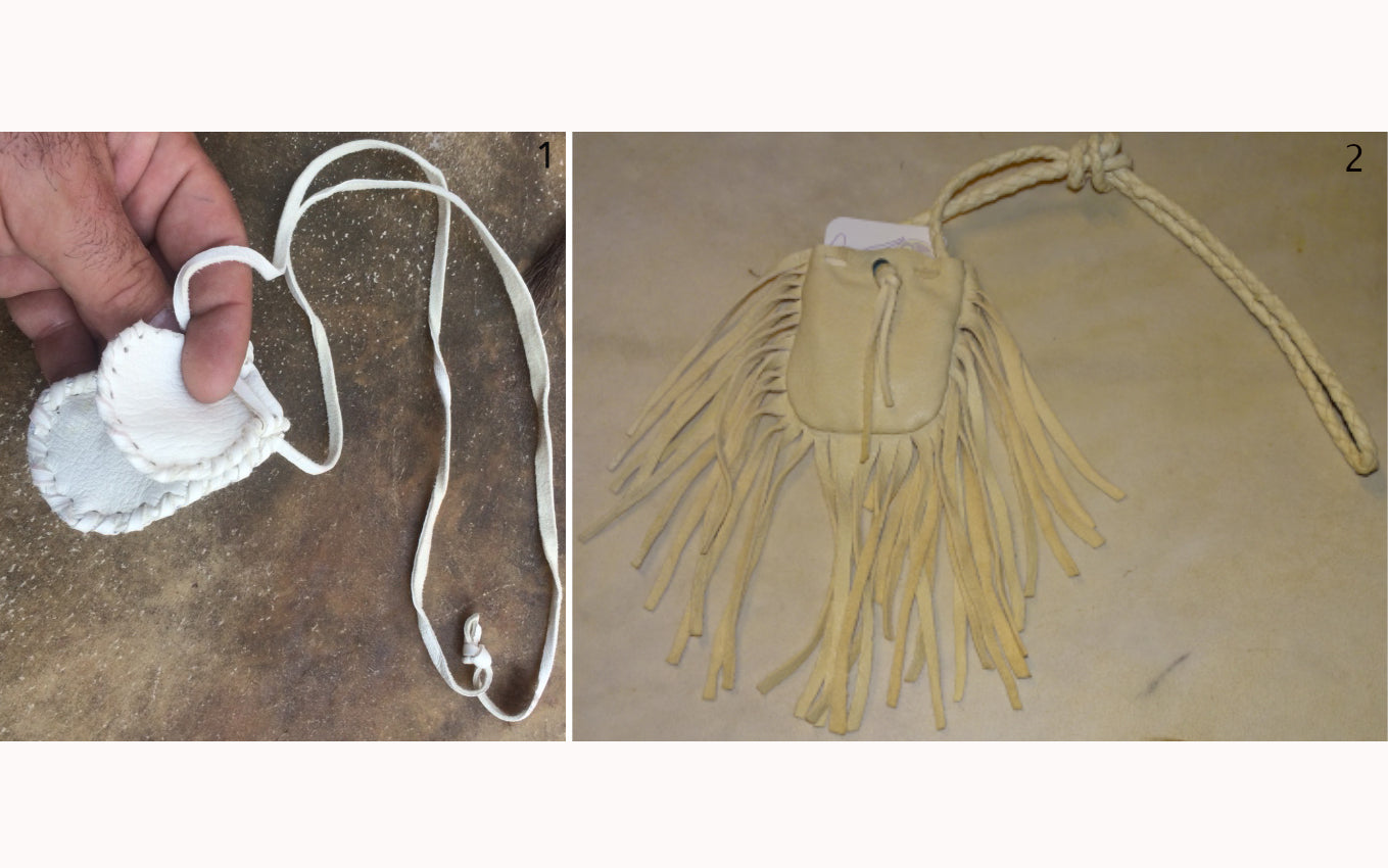 Medecine bag/ pochette en cuir fait main au Québec par de vrais Indiens, les 'Esprits de la terre'. 80 centimètres de longueur. Magnifique travail, 2 modèles au choix !