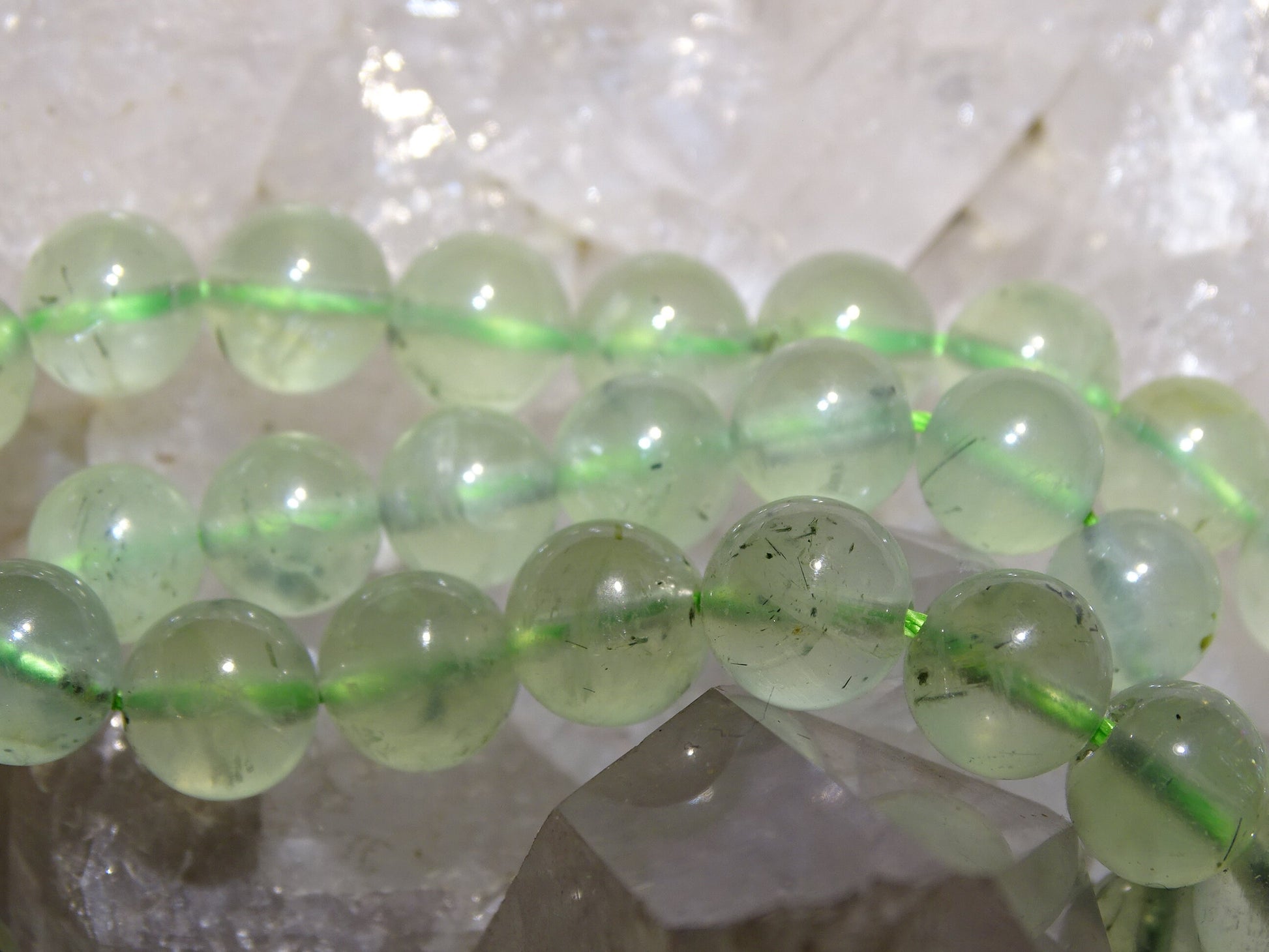 Préhnite verte avec Épidote du Mali, perles rondes de 4, 6 ou 8 mm. Vendu en fil de perle 38/39 cm, en bracelet de 17 à 21cm, en collier de 45 ou sautoir de 60cm. Qualité AA à AAA, merveilles de l'Afrique !