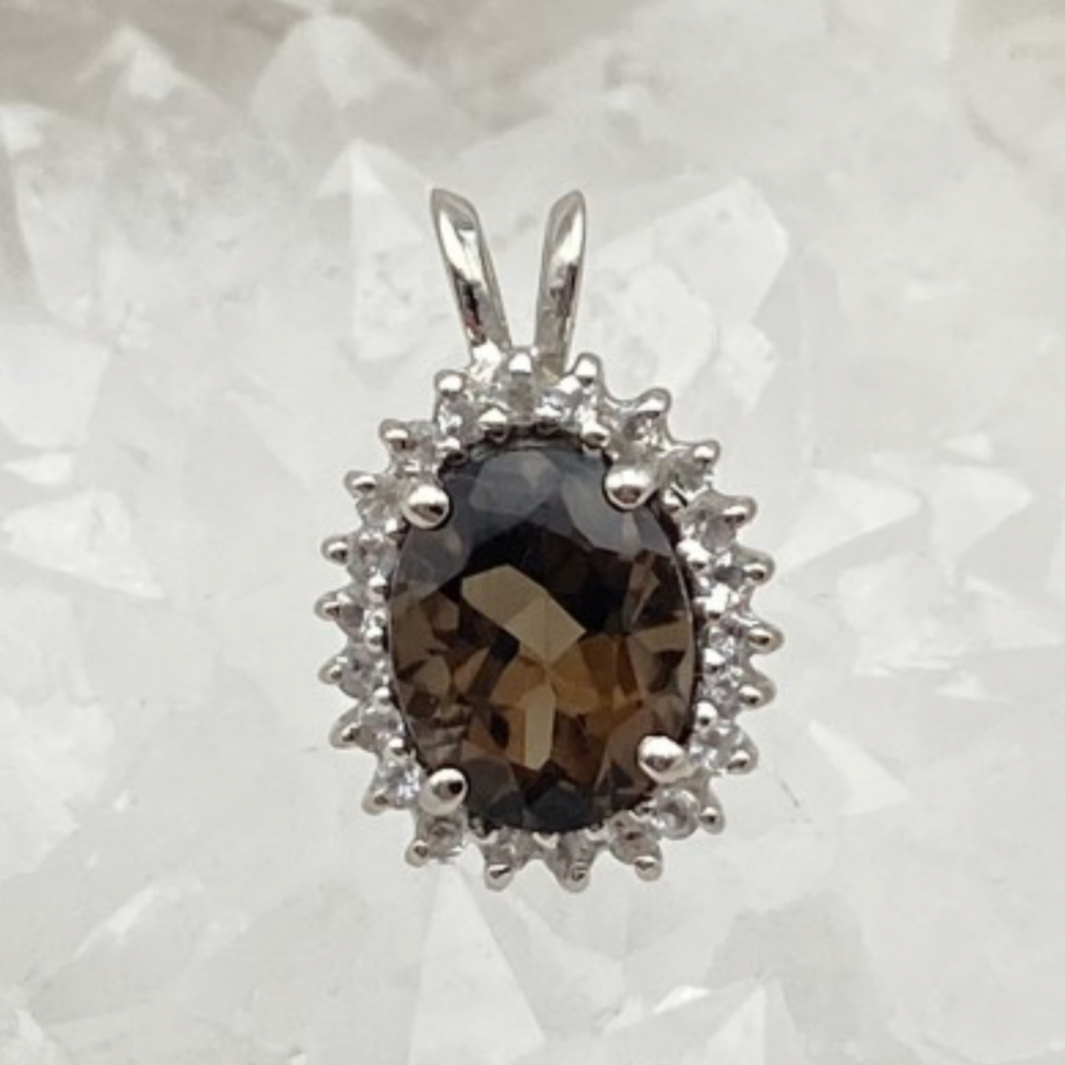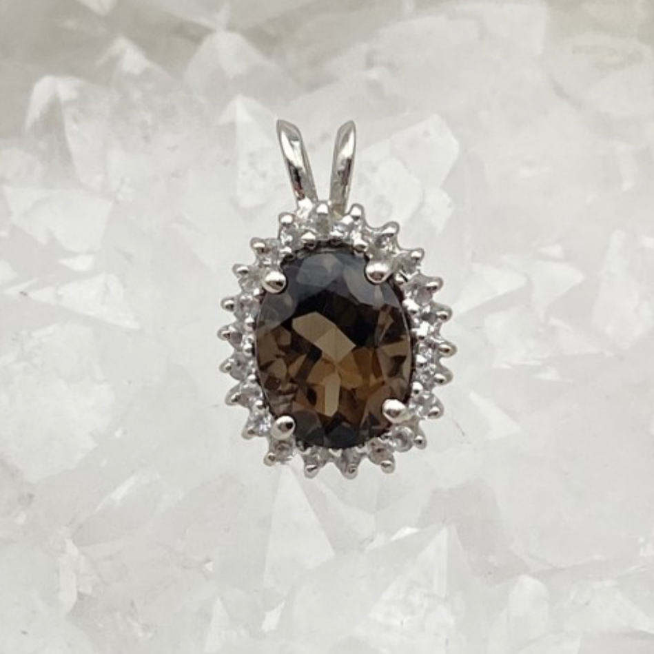 Quartz/ Cristal fumé | Collection Retro' | Pendentif en Argent serti d'une pierre gemme de forme de ovale, entouré d'Oxyde, 16 x 10 mm !