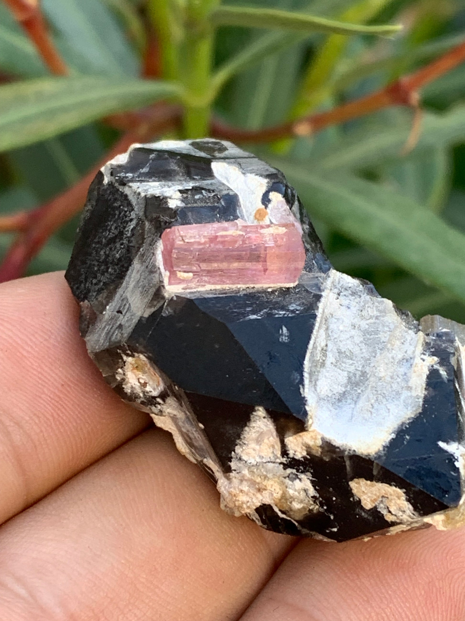 Particularité | Association rare et esthétique : contraste entre le quartz sombre et la tourmaline rose intense |