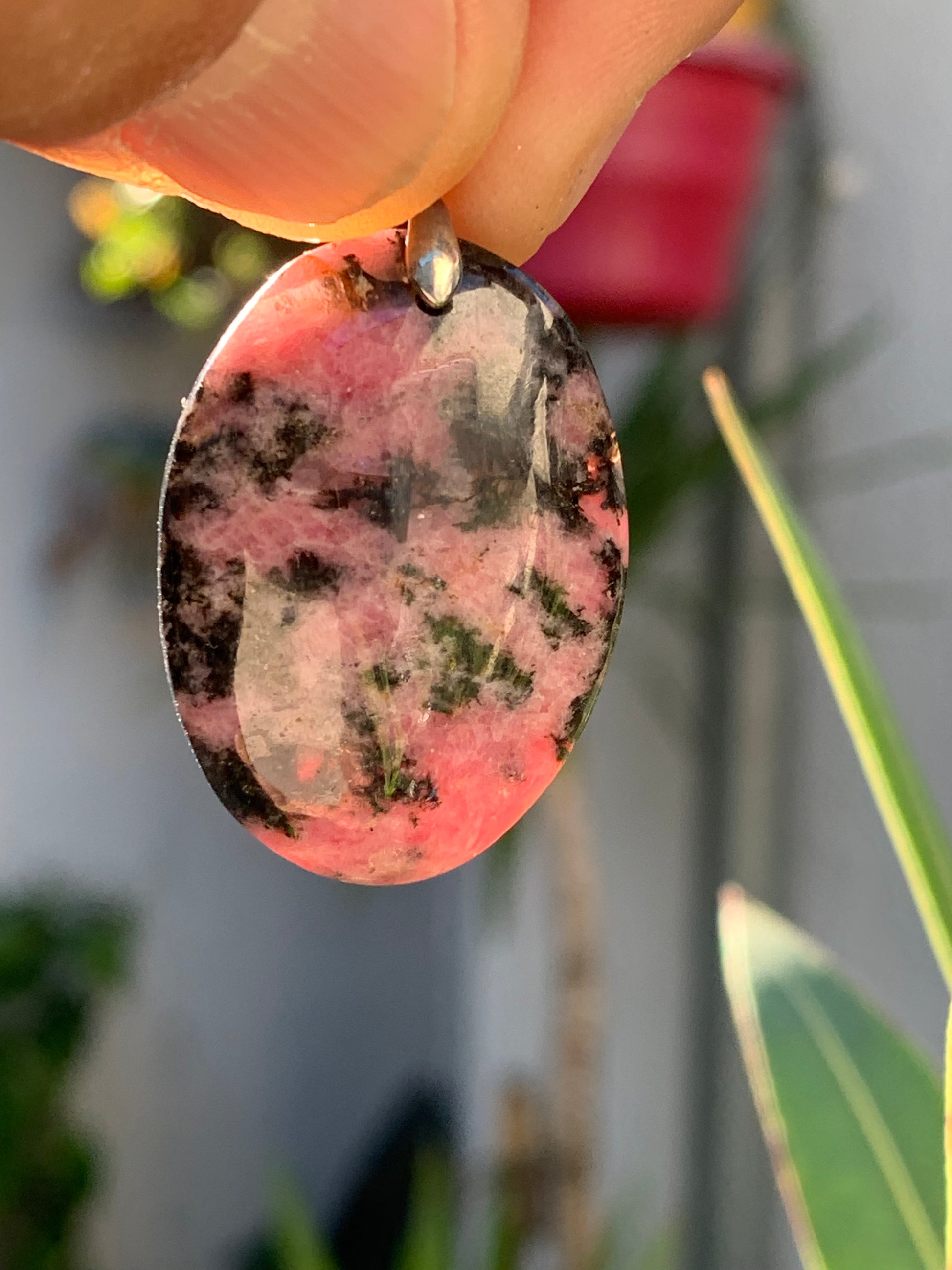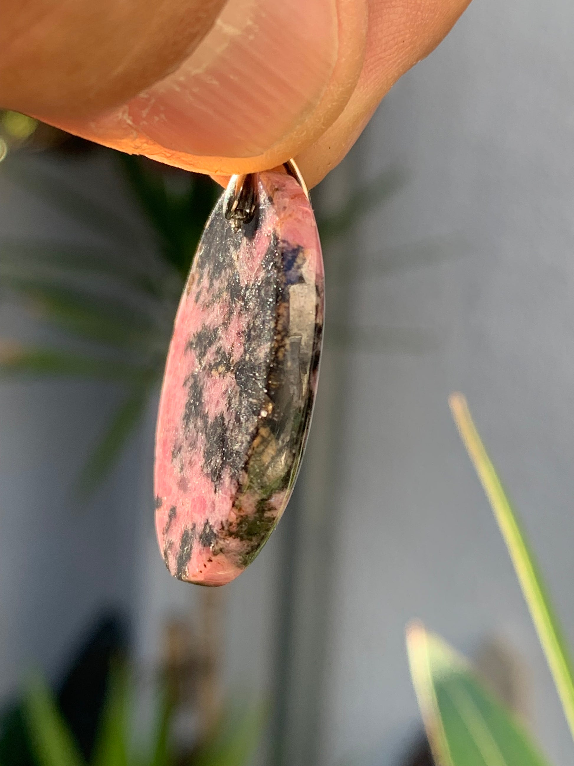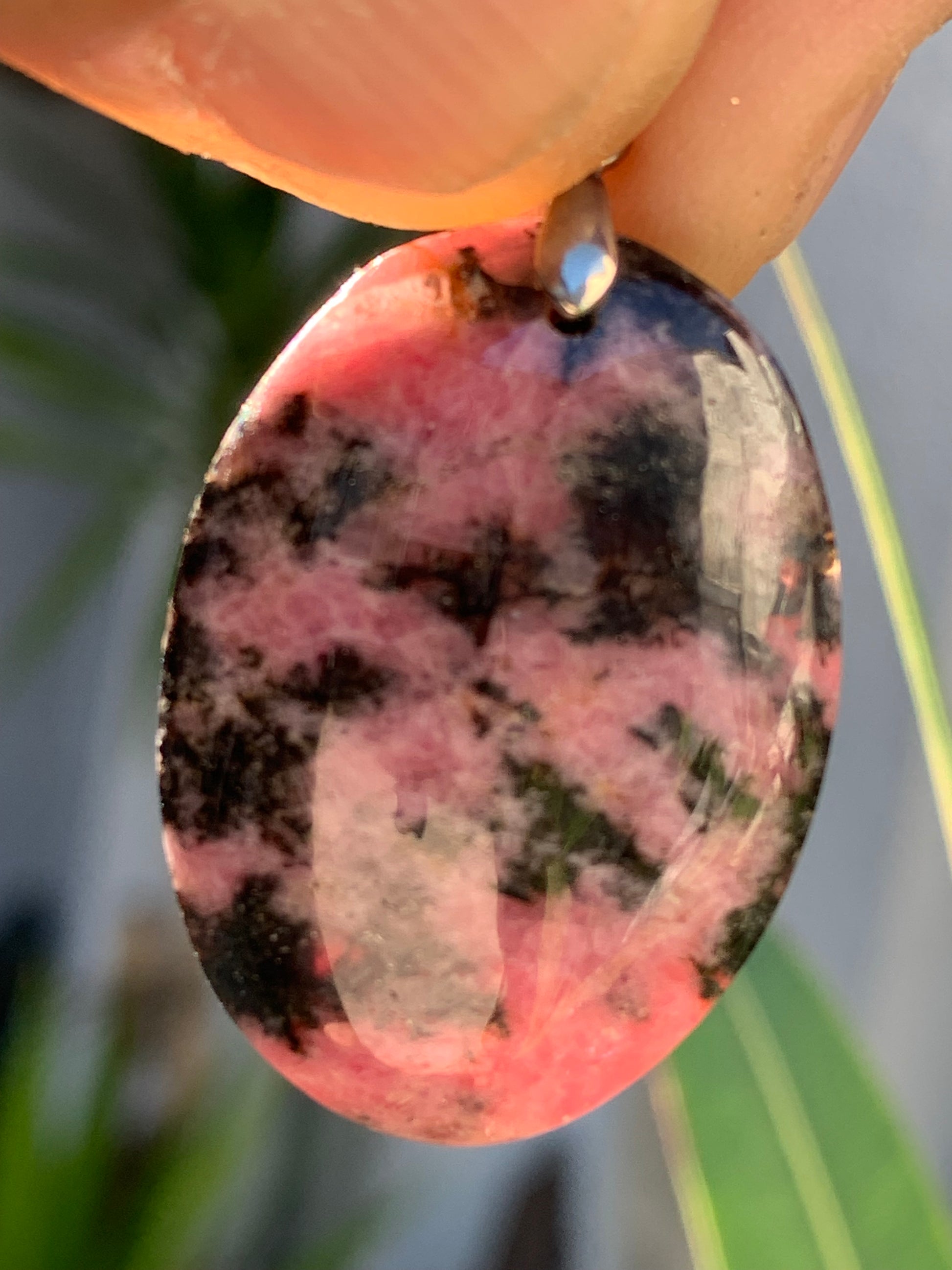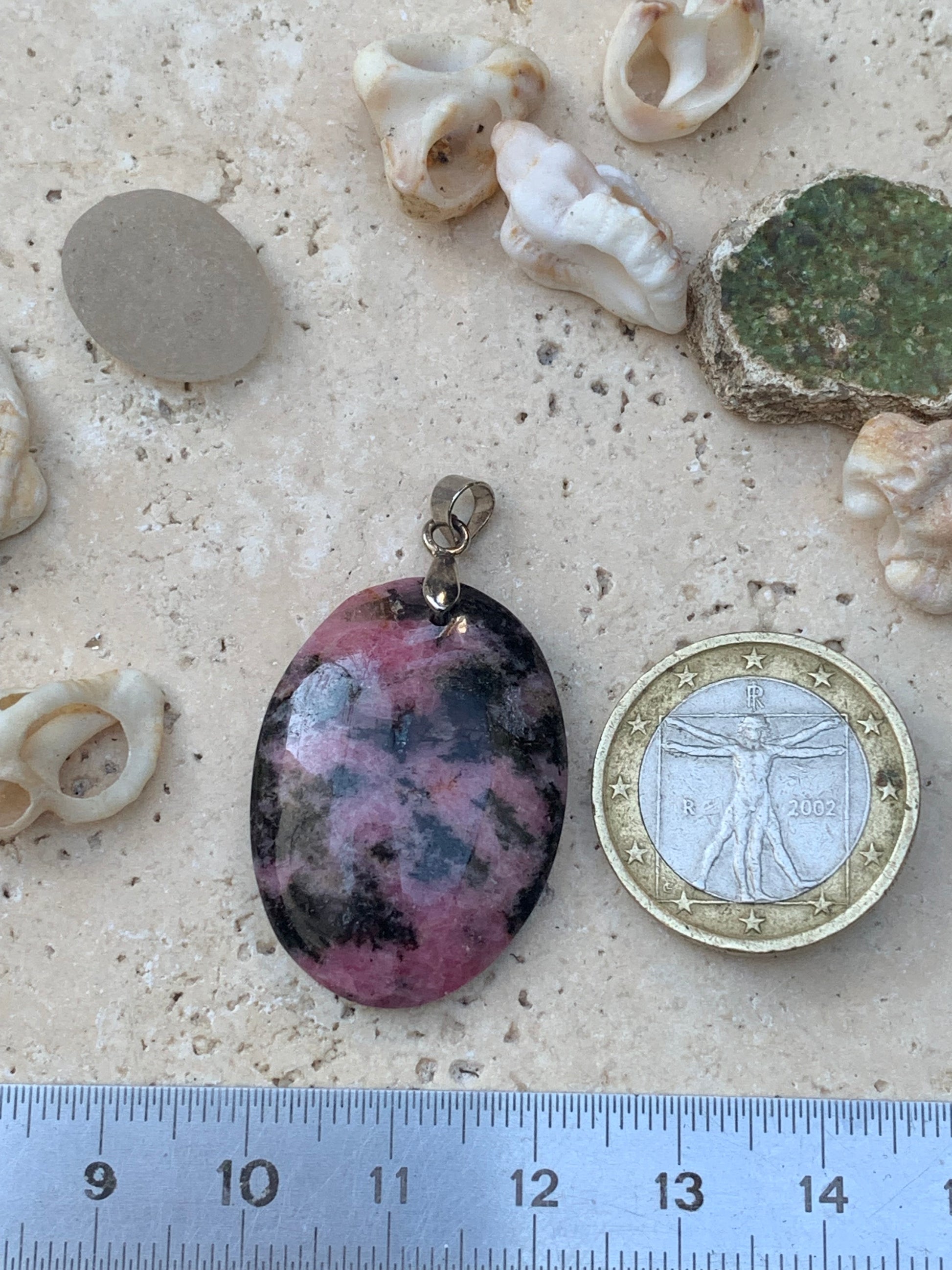 Rhodonite, pendentif 'cabochon percé' de 39mm x23 x7. Vendu avec cordon réglable de couleur noire !