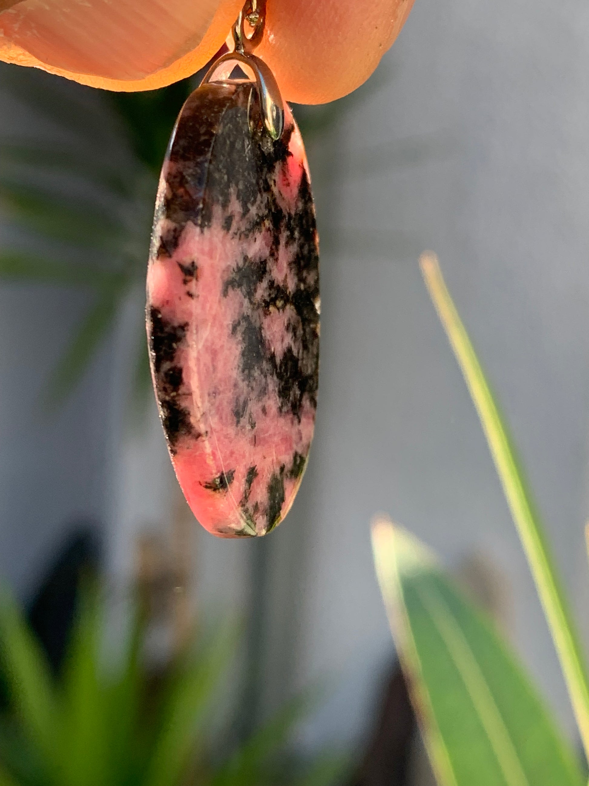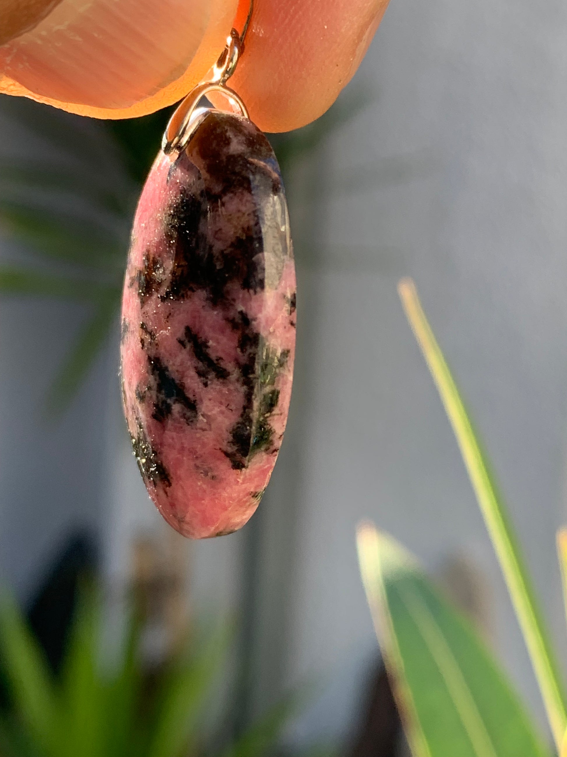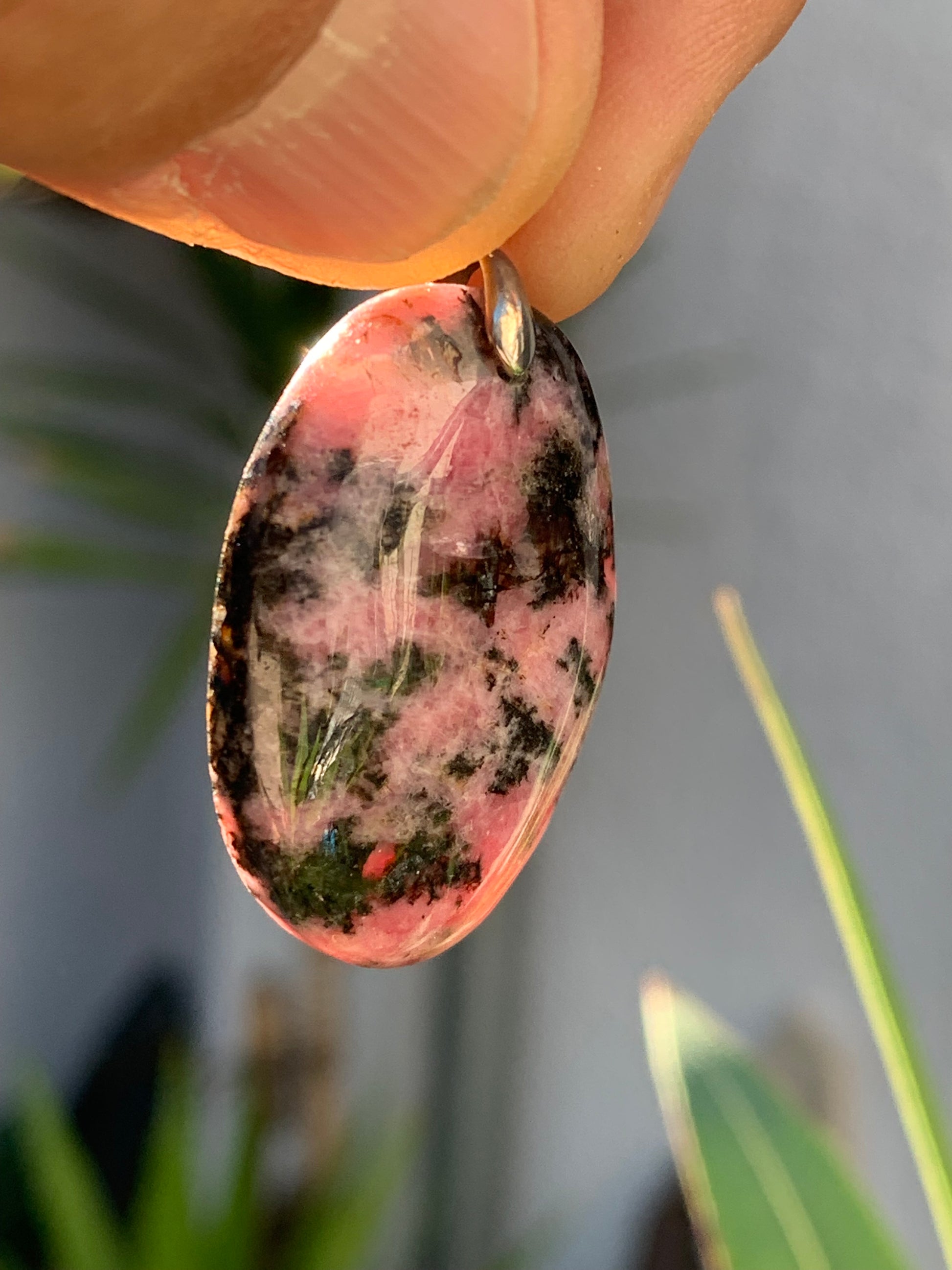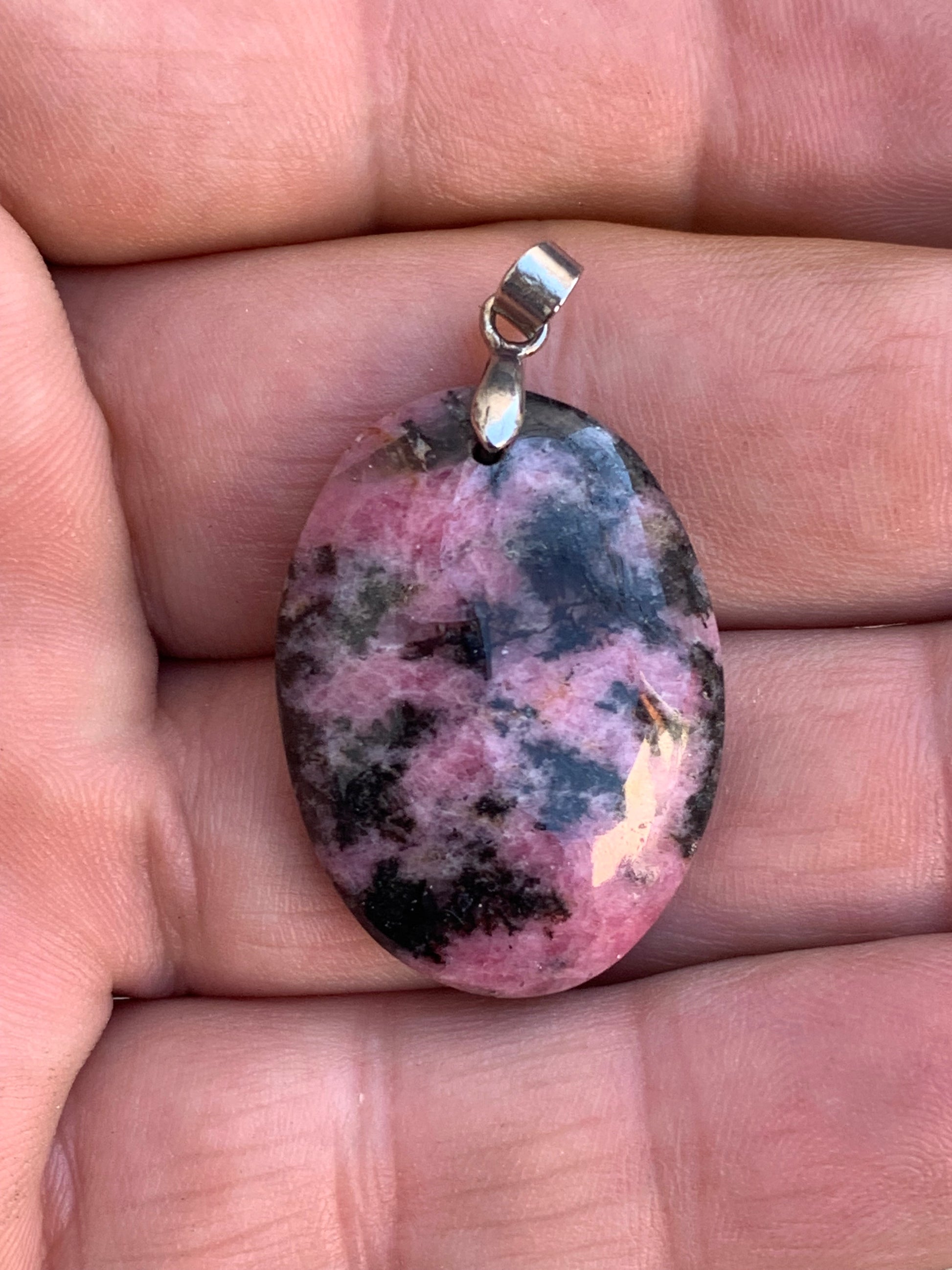 Rhodonite, pendentif 'cabochon percé' de 39mm x23 x7. Vendu avec cordon réglable de couleur noire !
