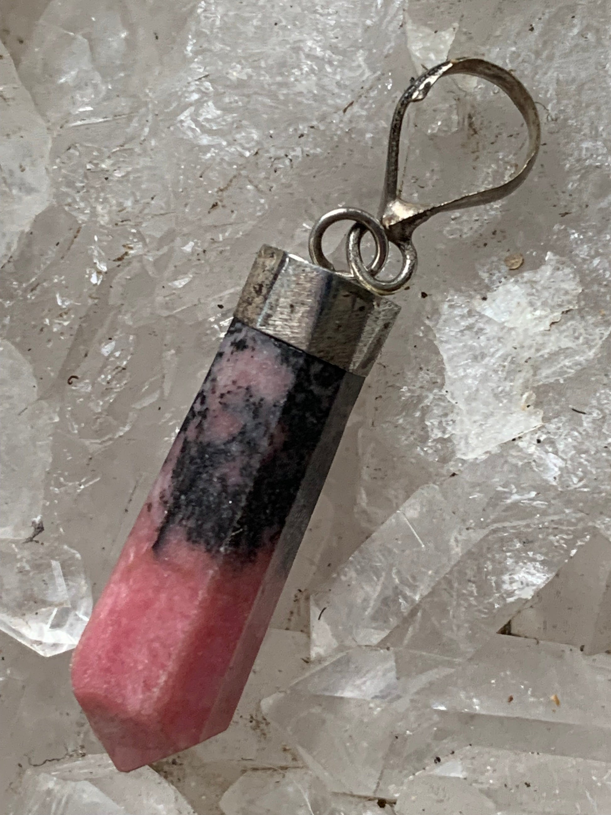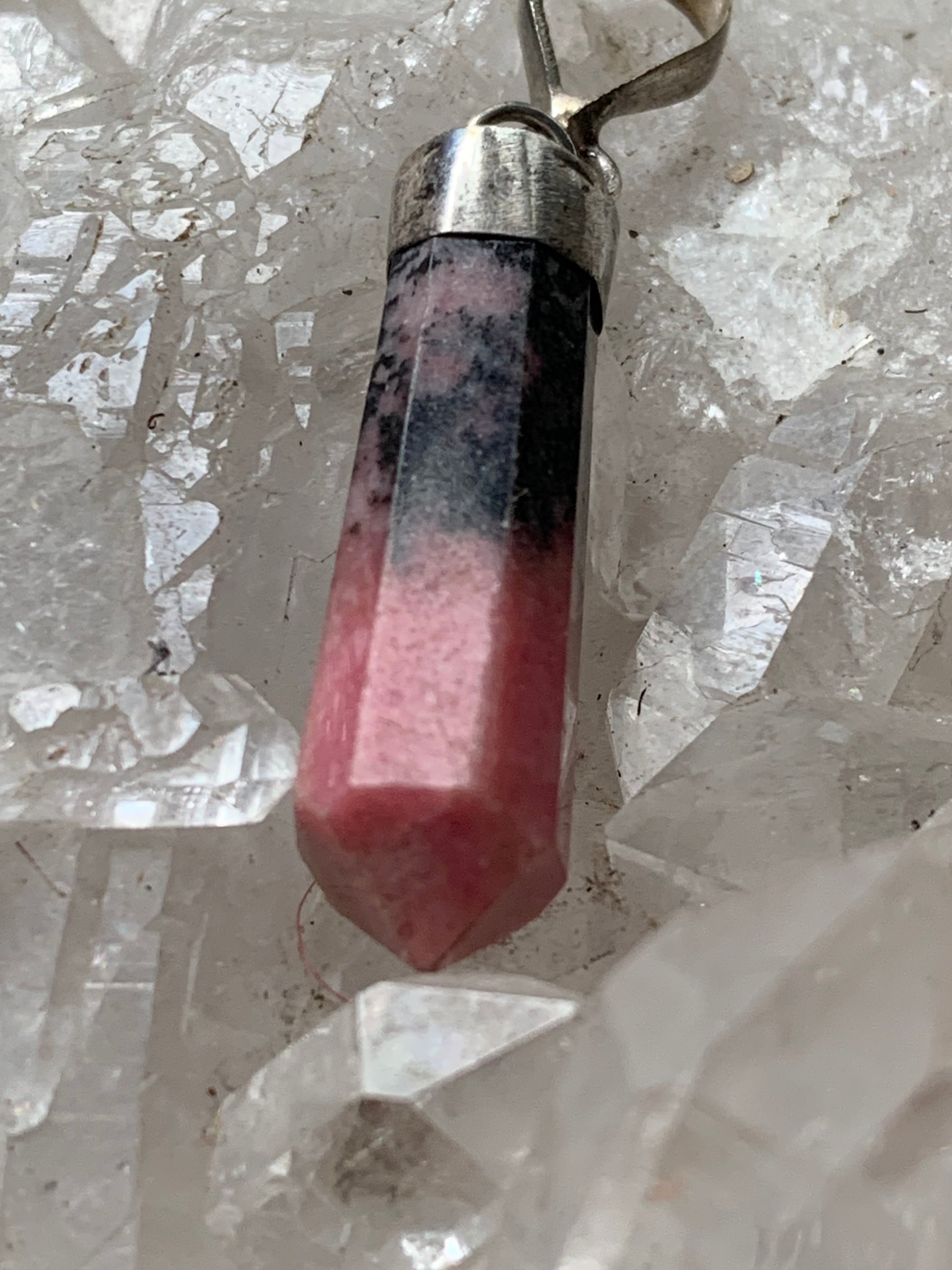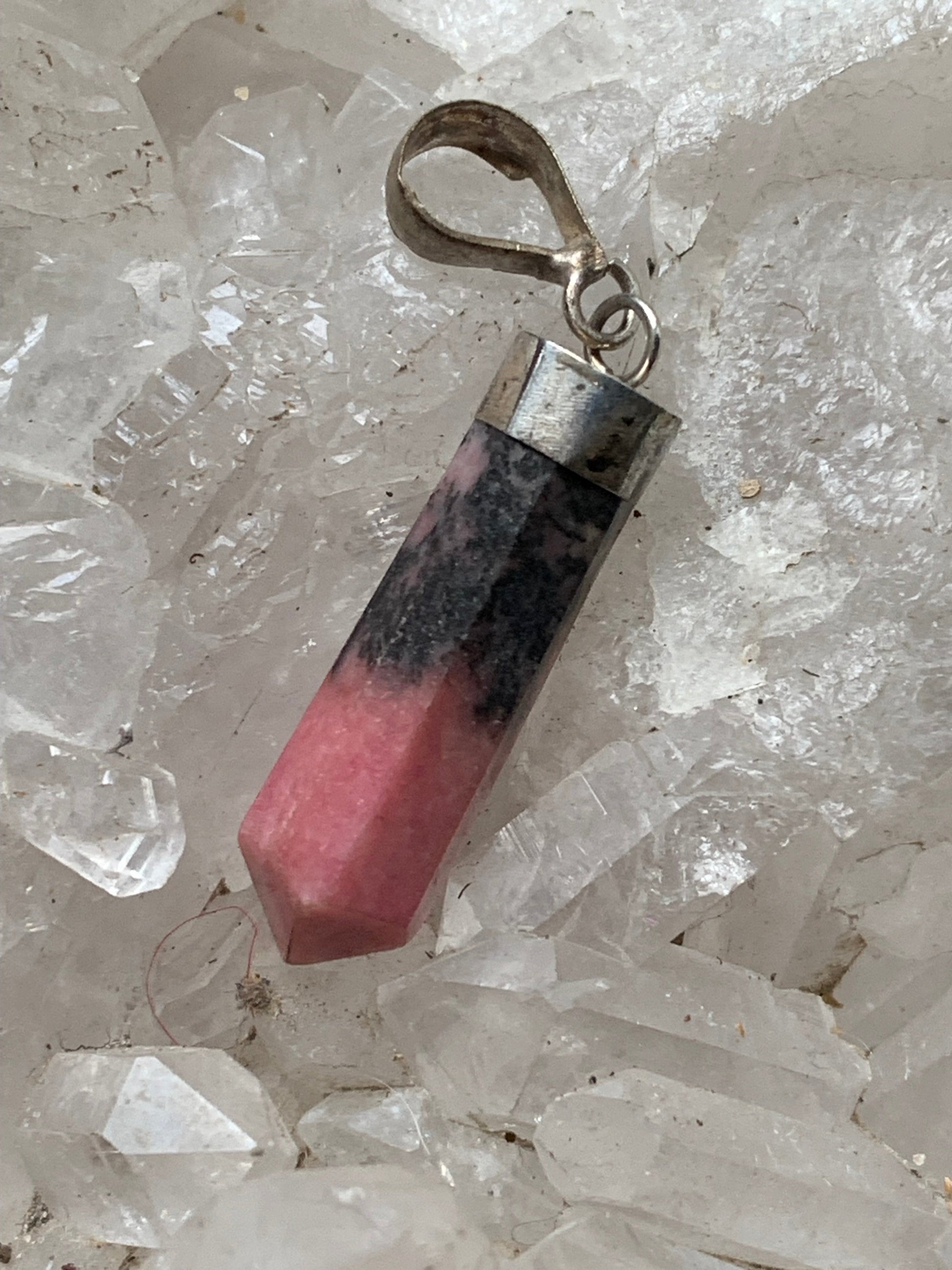 Rhodonite, pièce unique en Argent de 37 millimètres de hauteur x 8 millimètres de largeur x 7 d'épaisseur. Vendu avec un cordon réglable de couleur noire !