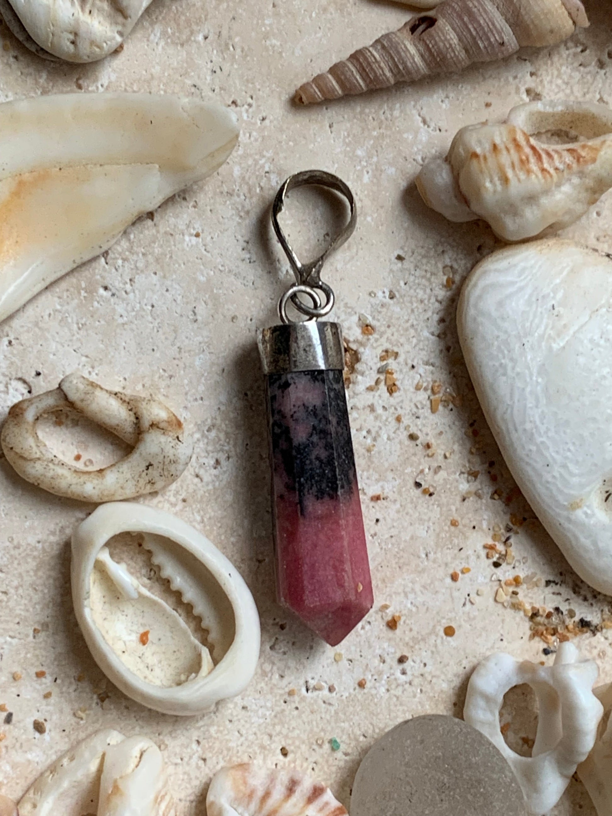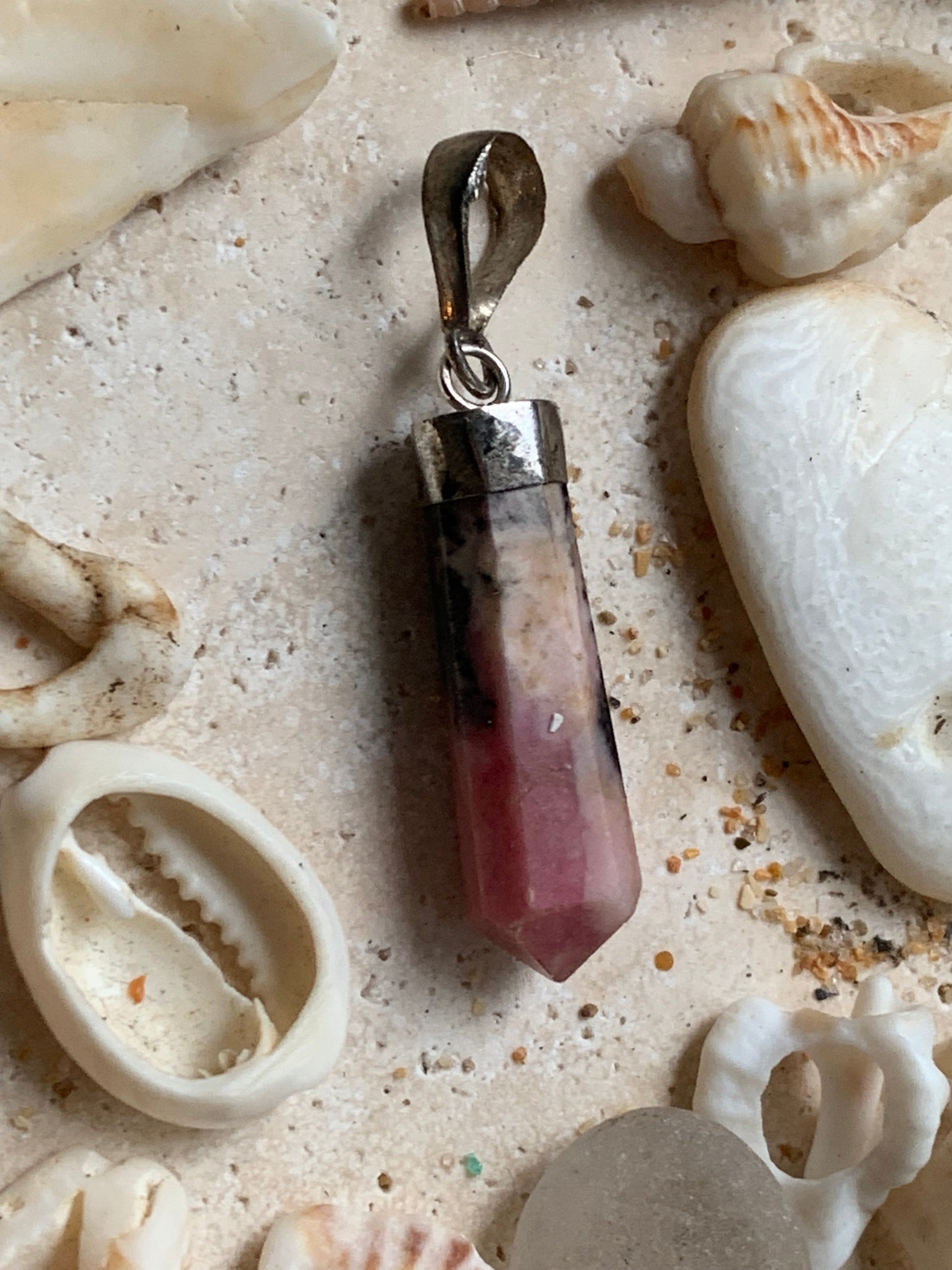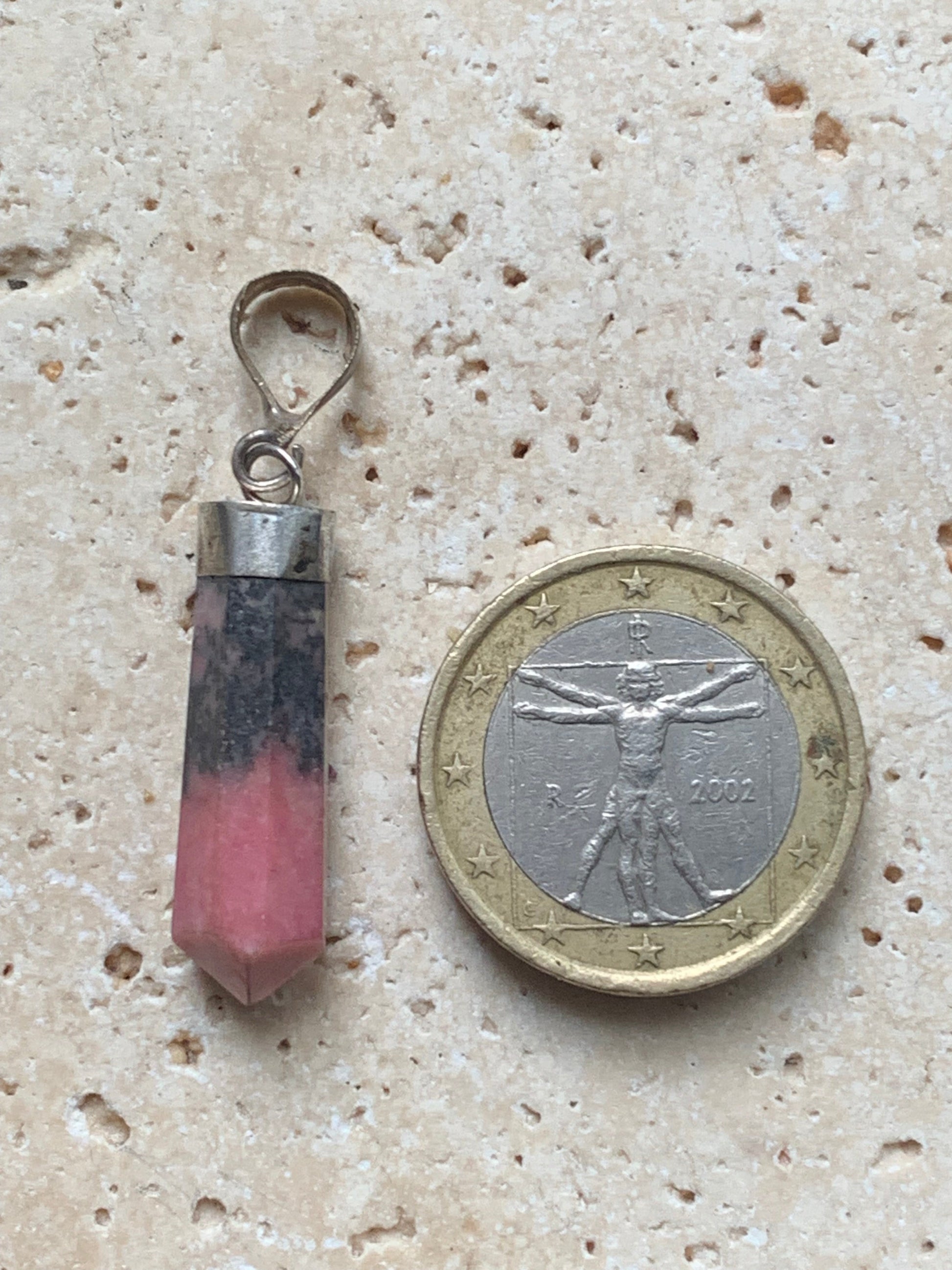 Rhodonite, pièce unique en Argent de 37 millimètres de hauteur x 8 millimètres de largeur x 7 d'épaisseur. Vendu avec un cordon réglable de couleur noire !