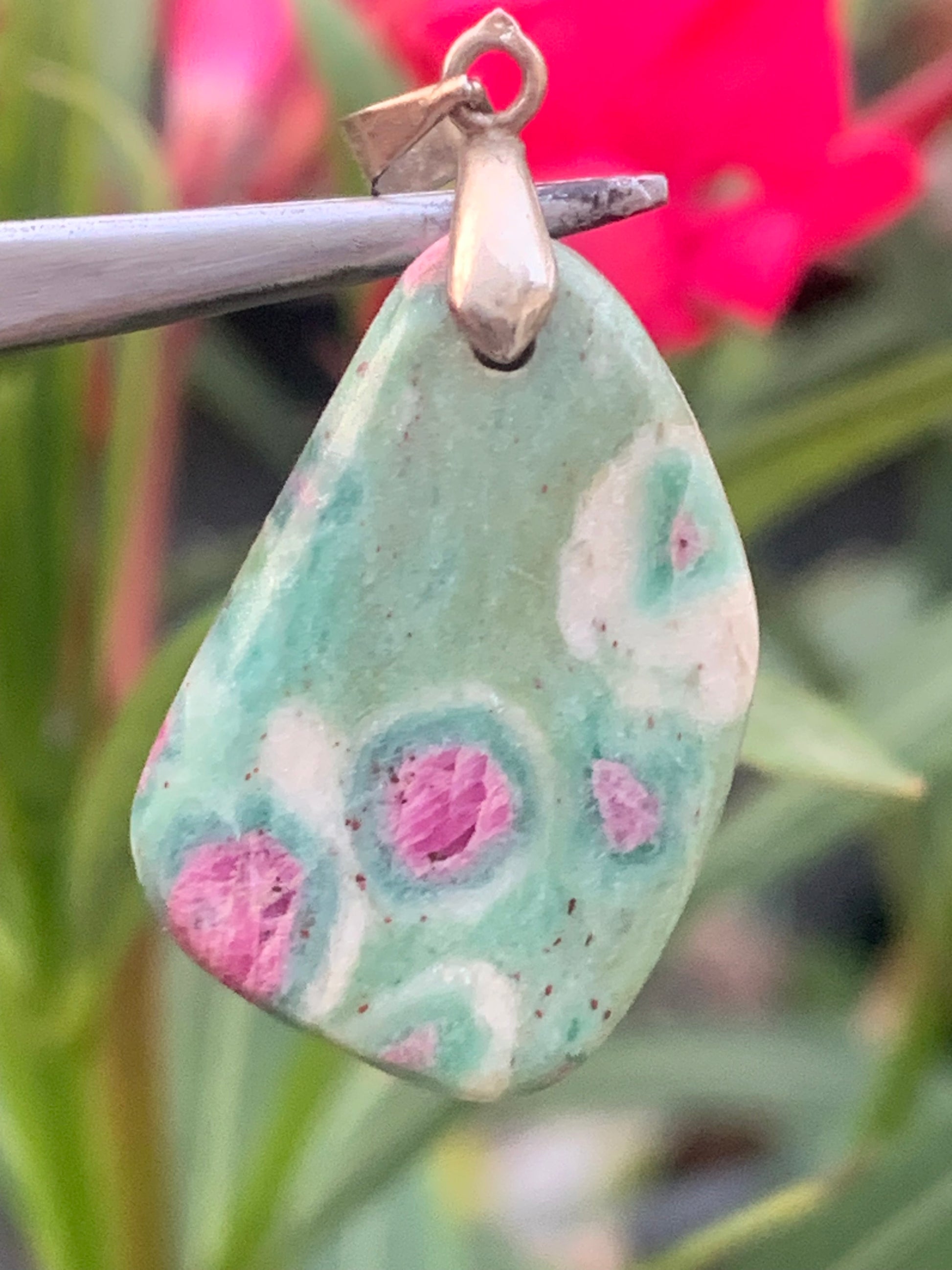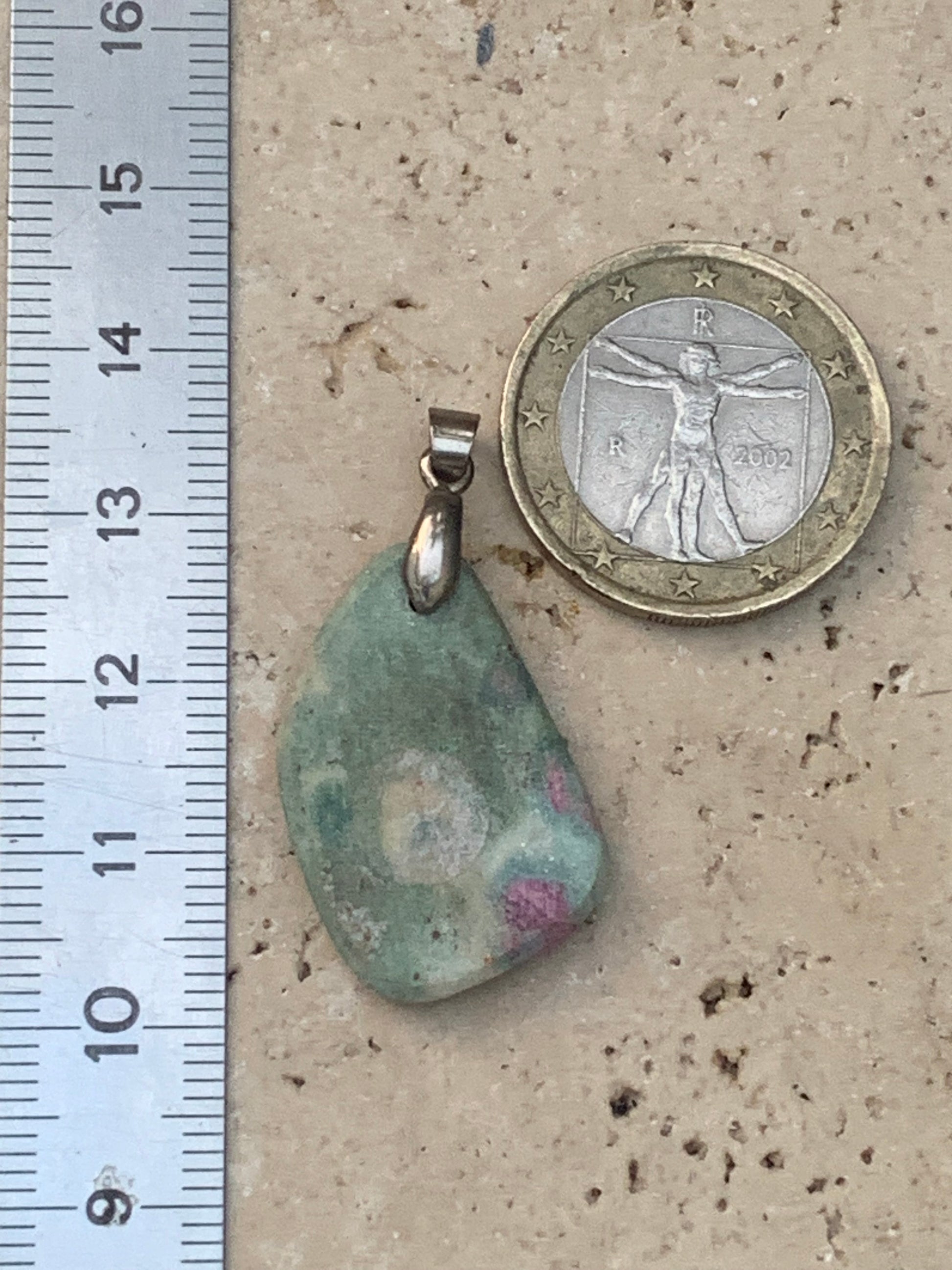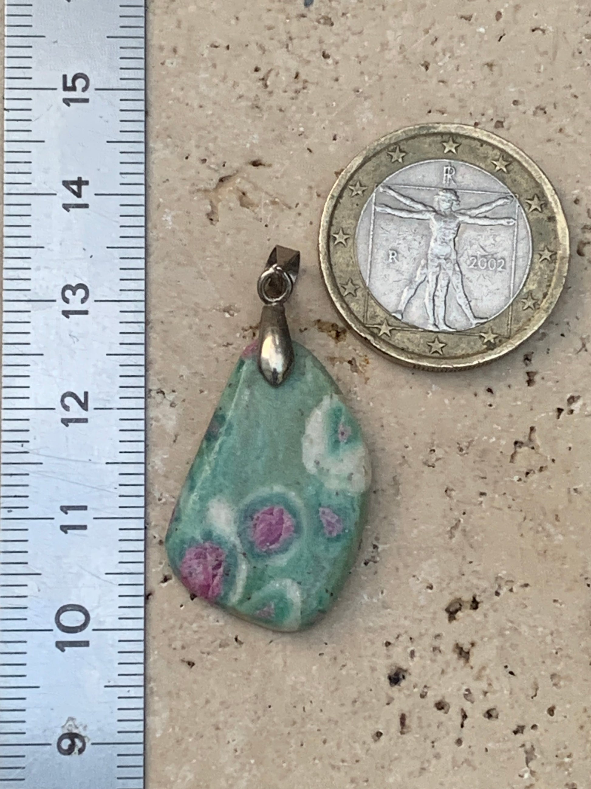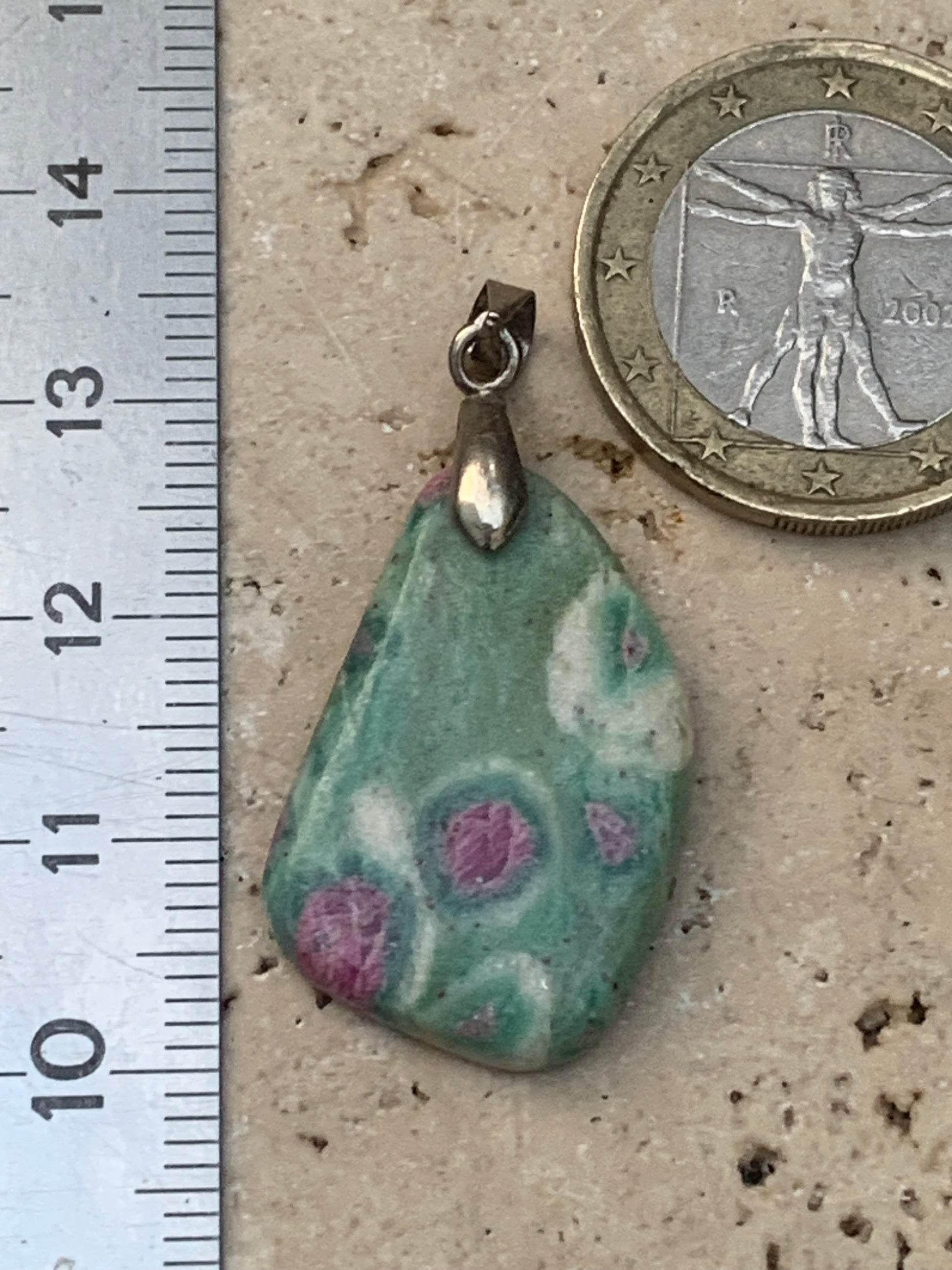 Rubis sur Fuchsite (micas vert), monté par G & Z, taille de 36 mm de ht x17 x5. Vendu avec un cordon réglable de couleur noire !