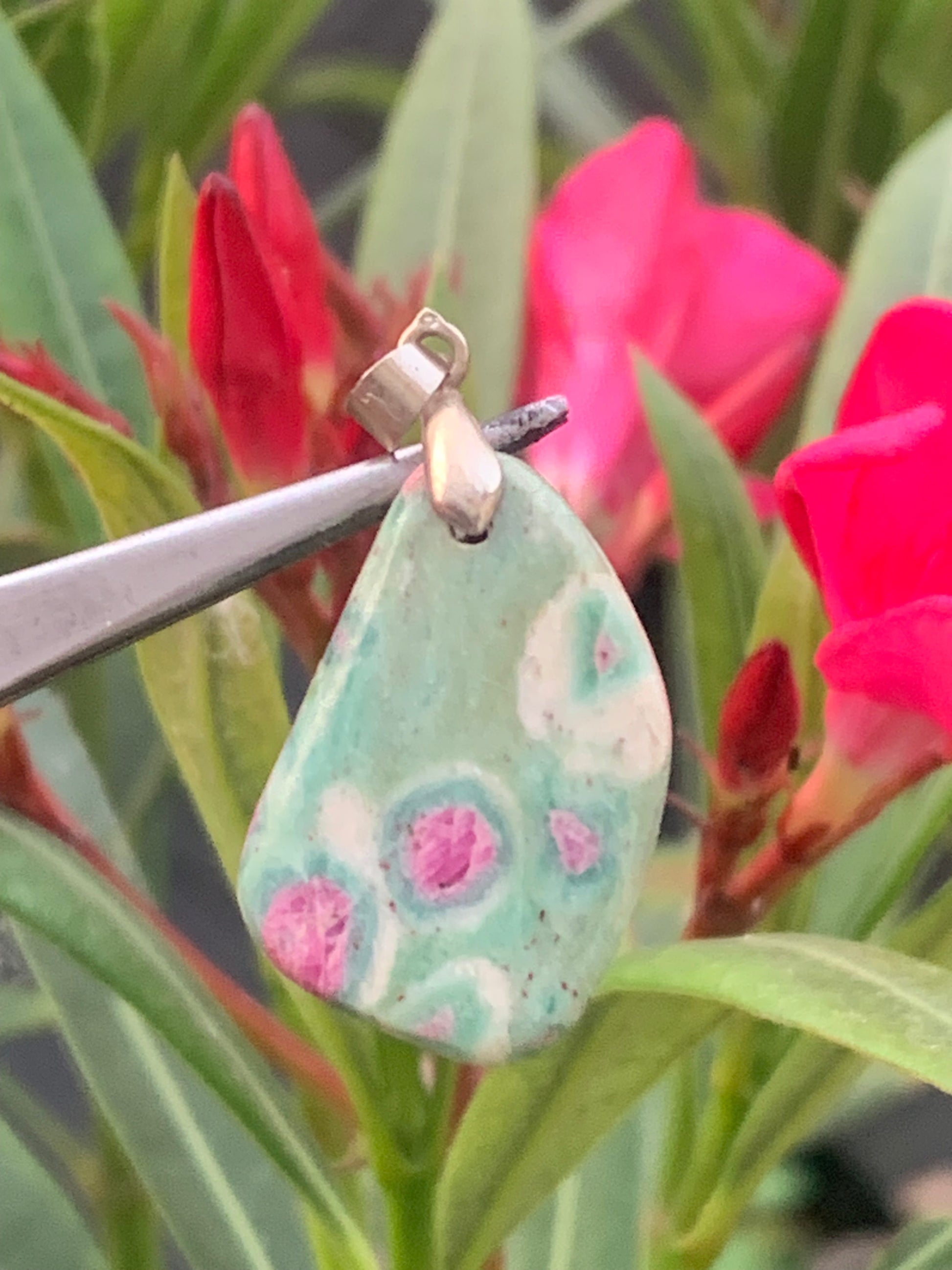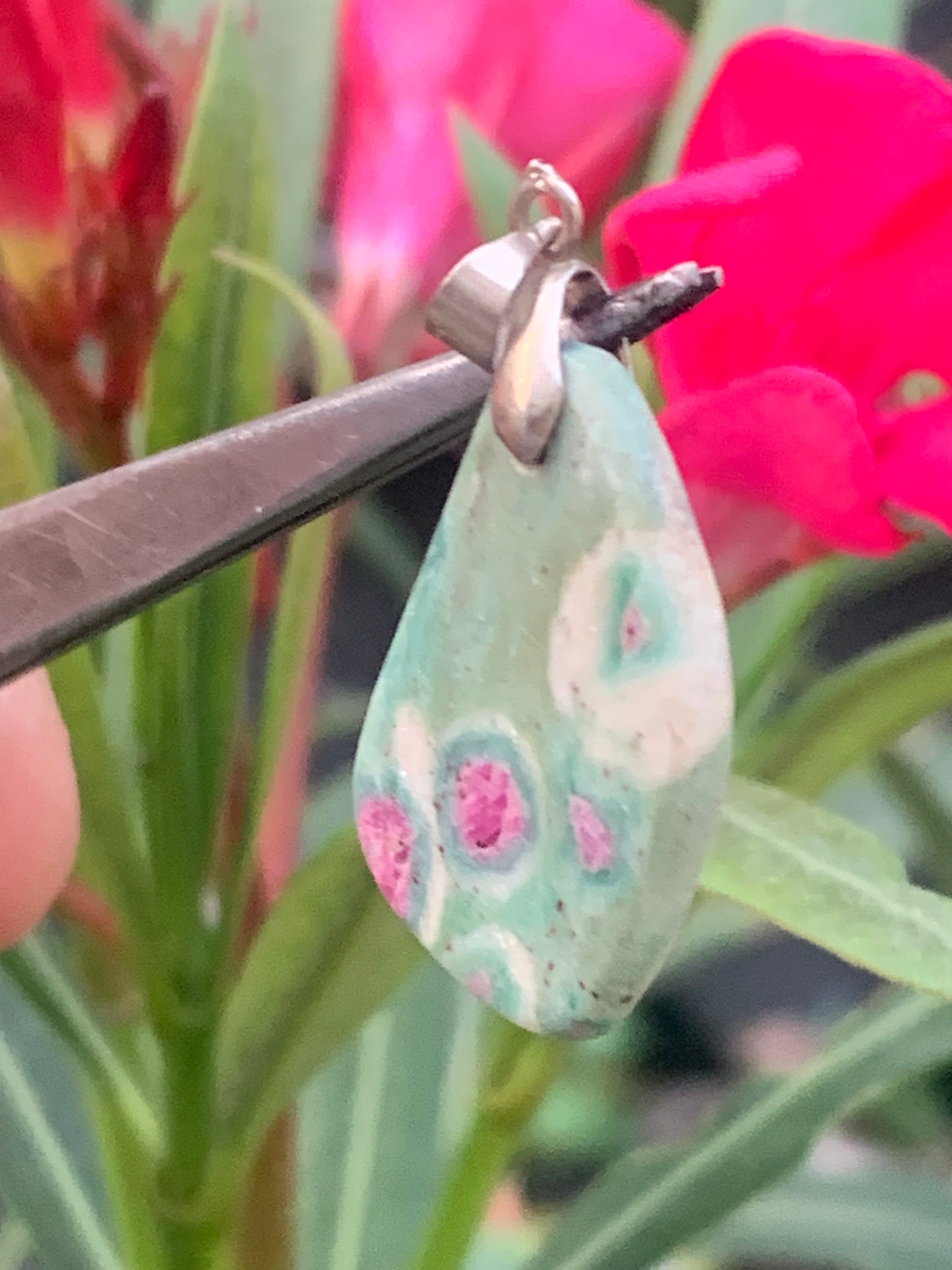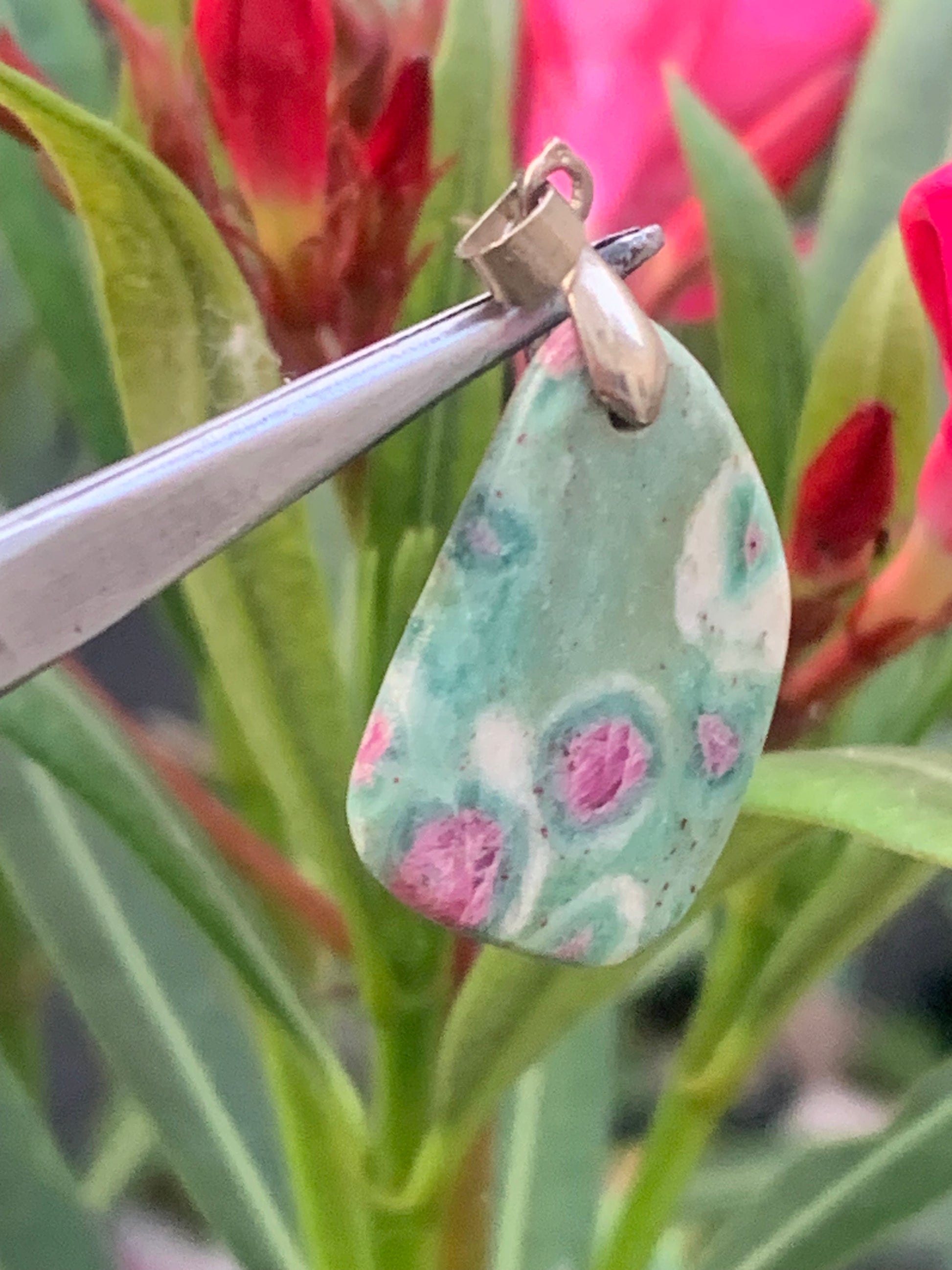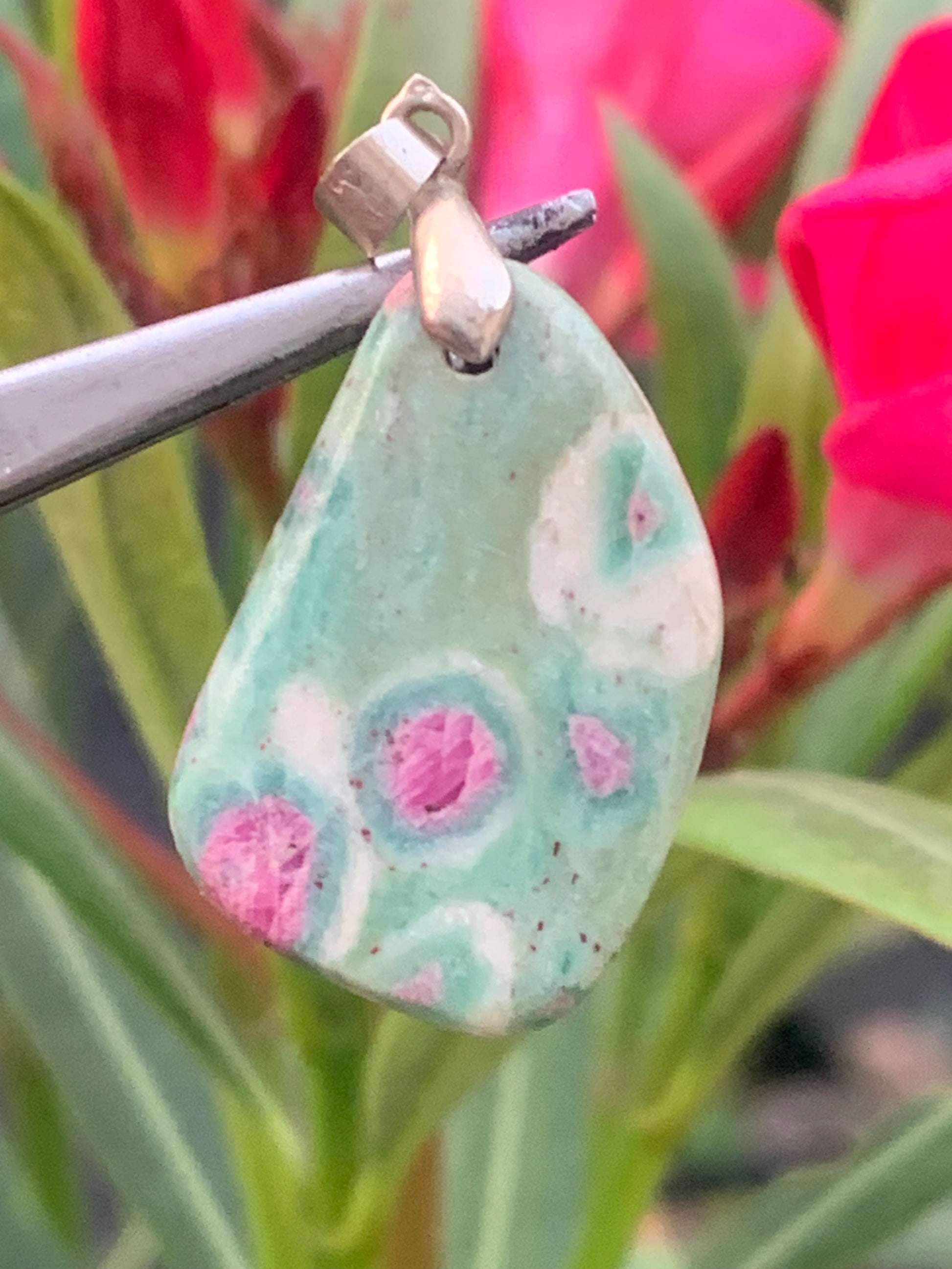Rubis sur Fuchsite (micas vert), monté par G & Z, taille de 36 mm de ht x17 x5. Vendu avec un cordon réglable de couleur noire !