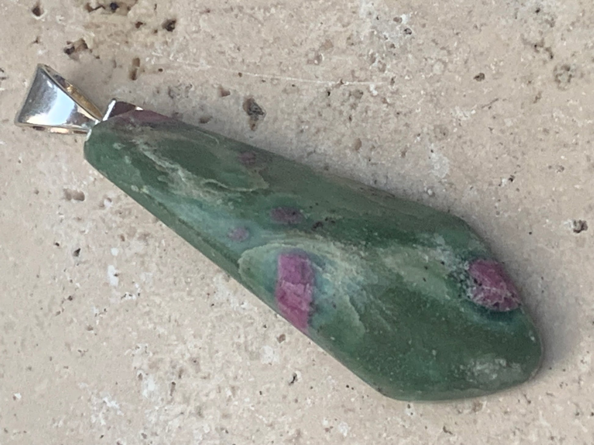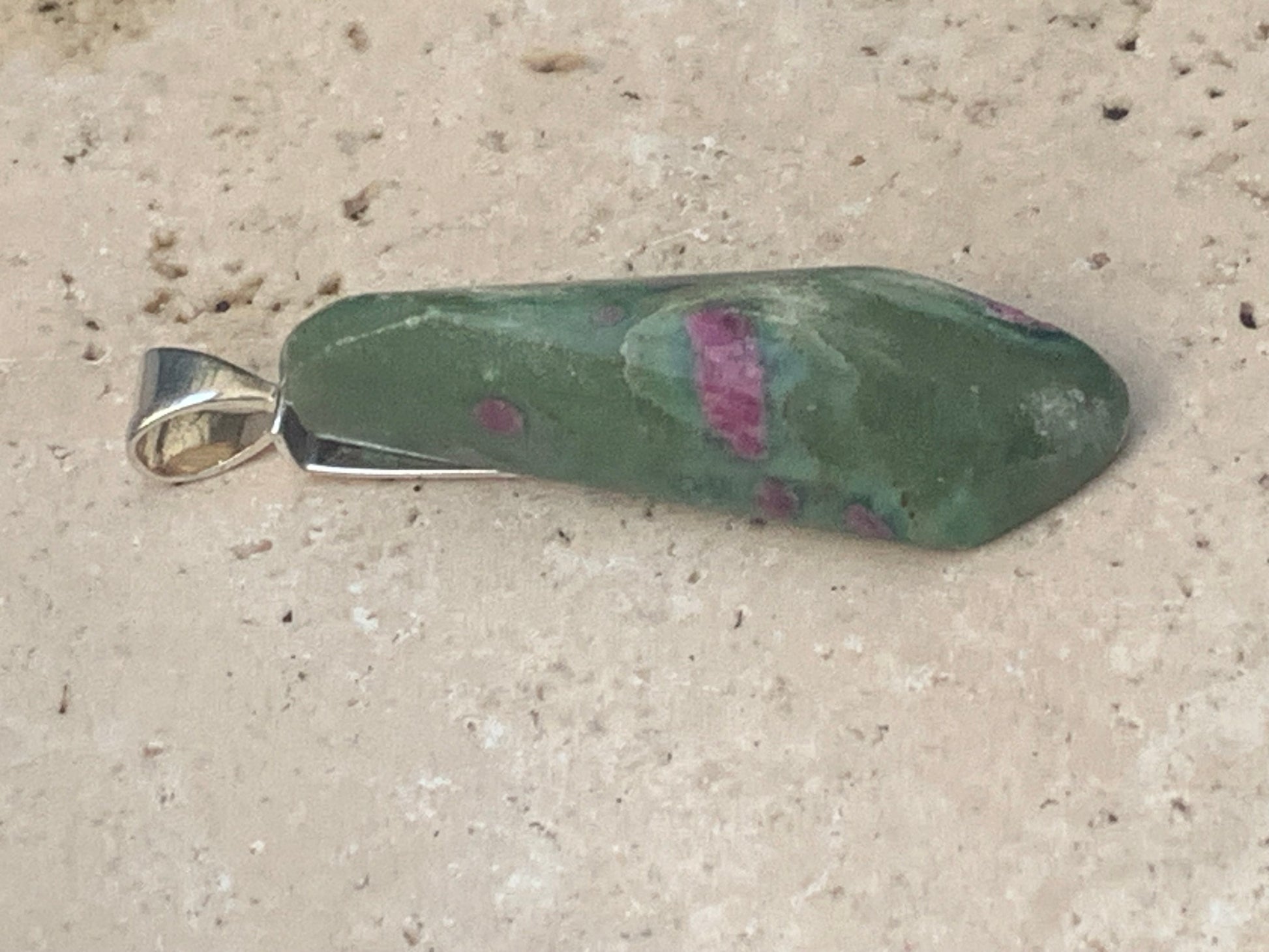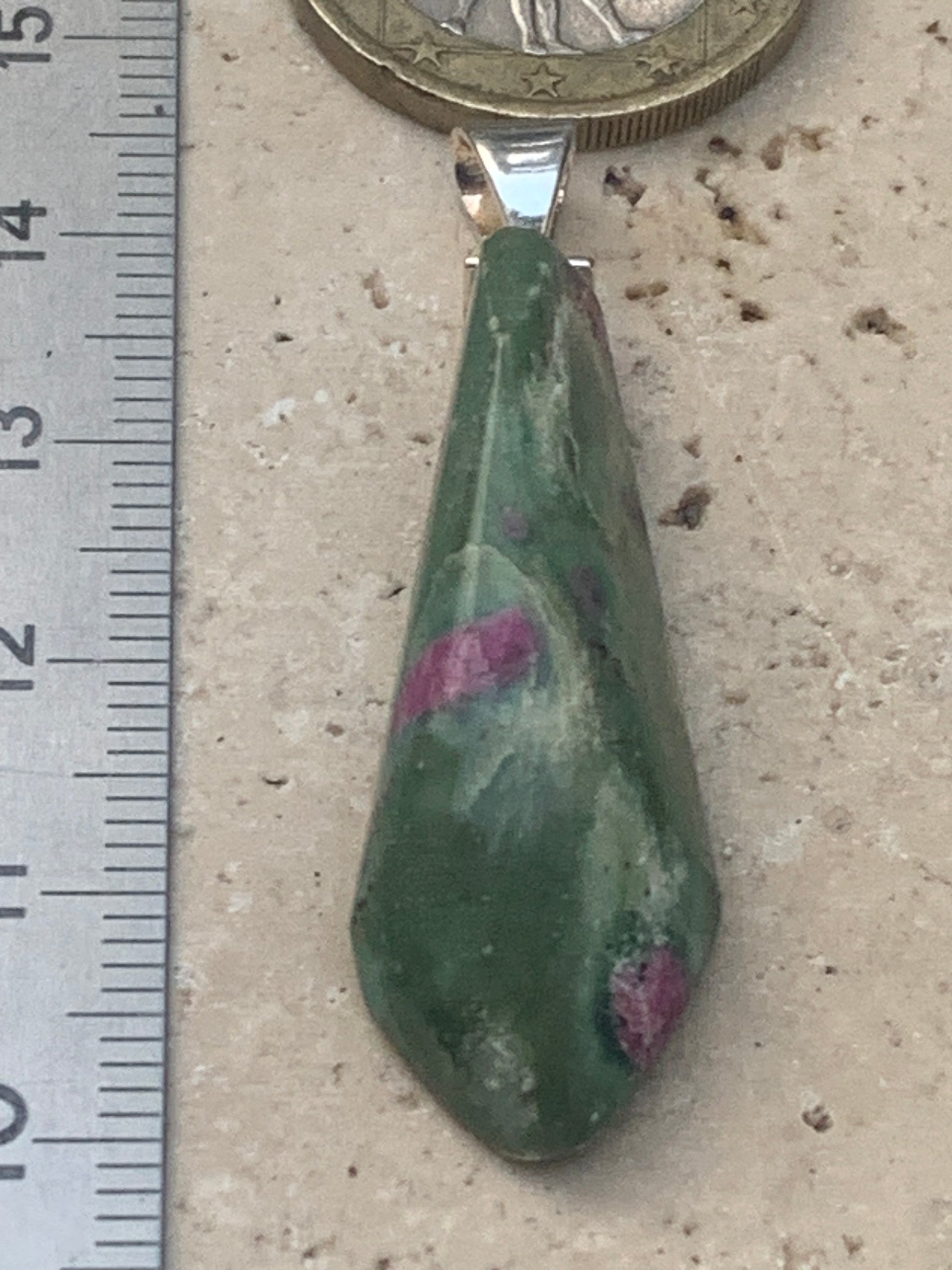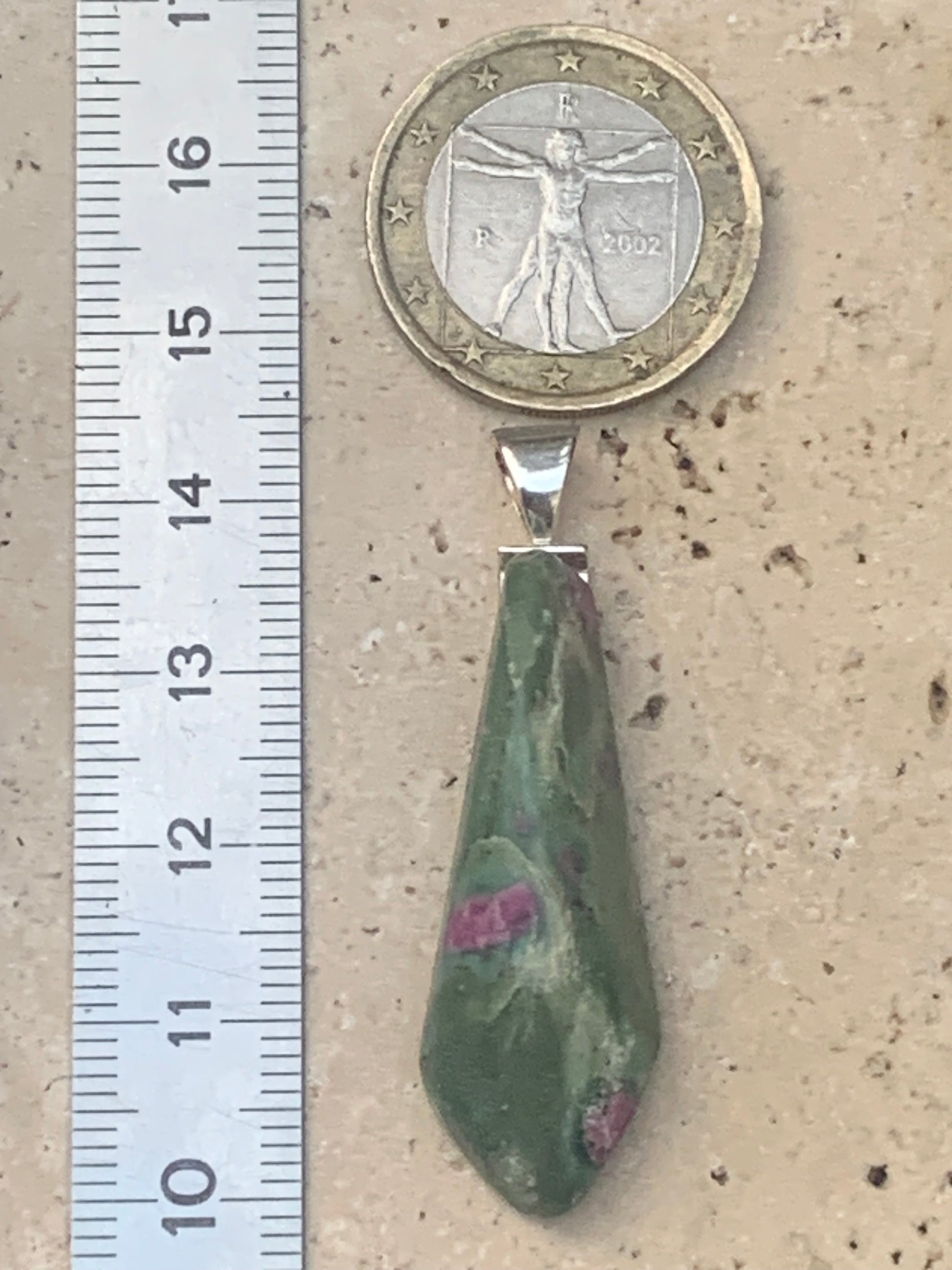 Rubis sur Fuchsite (micas vert), monté sur Argent par G & Z, de 45 mm de ht x14 x12. Vendu avec un cordon réglable de couleur noire !