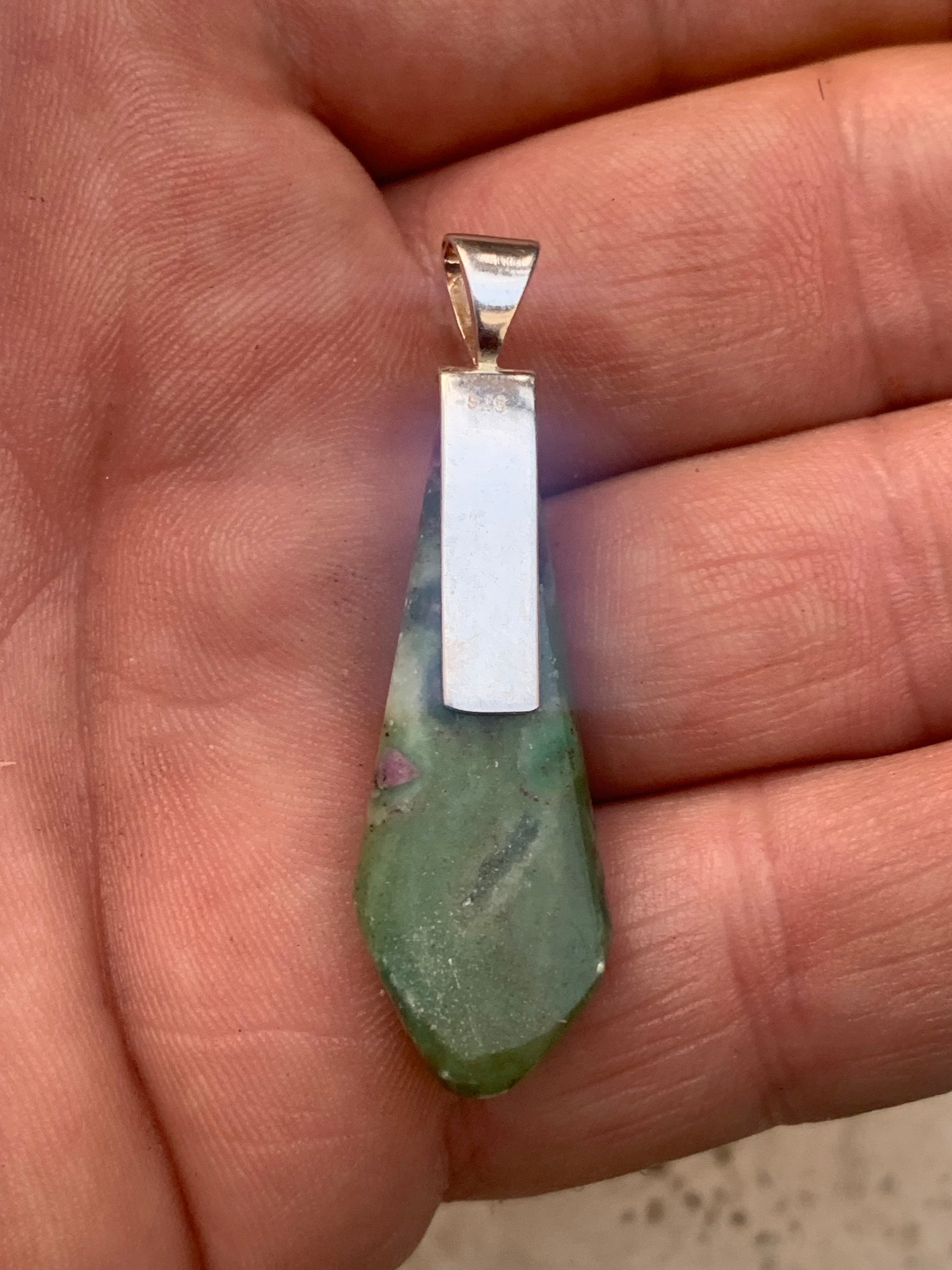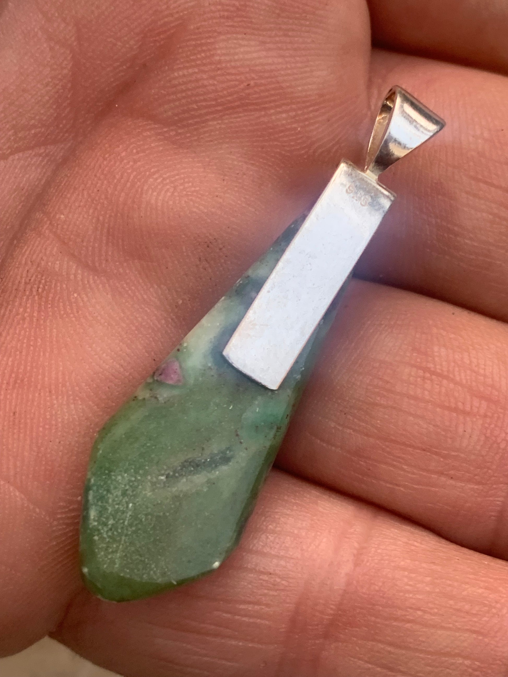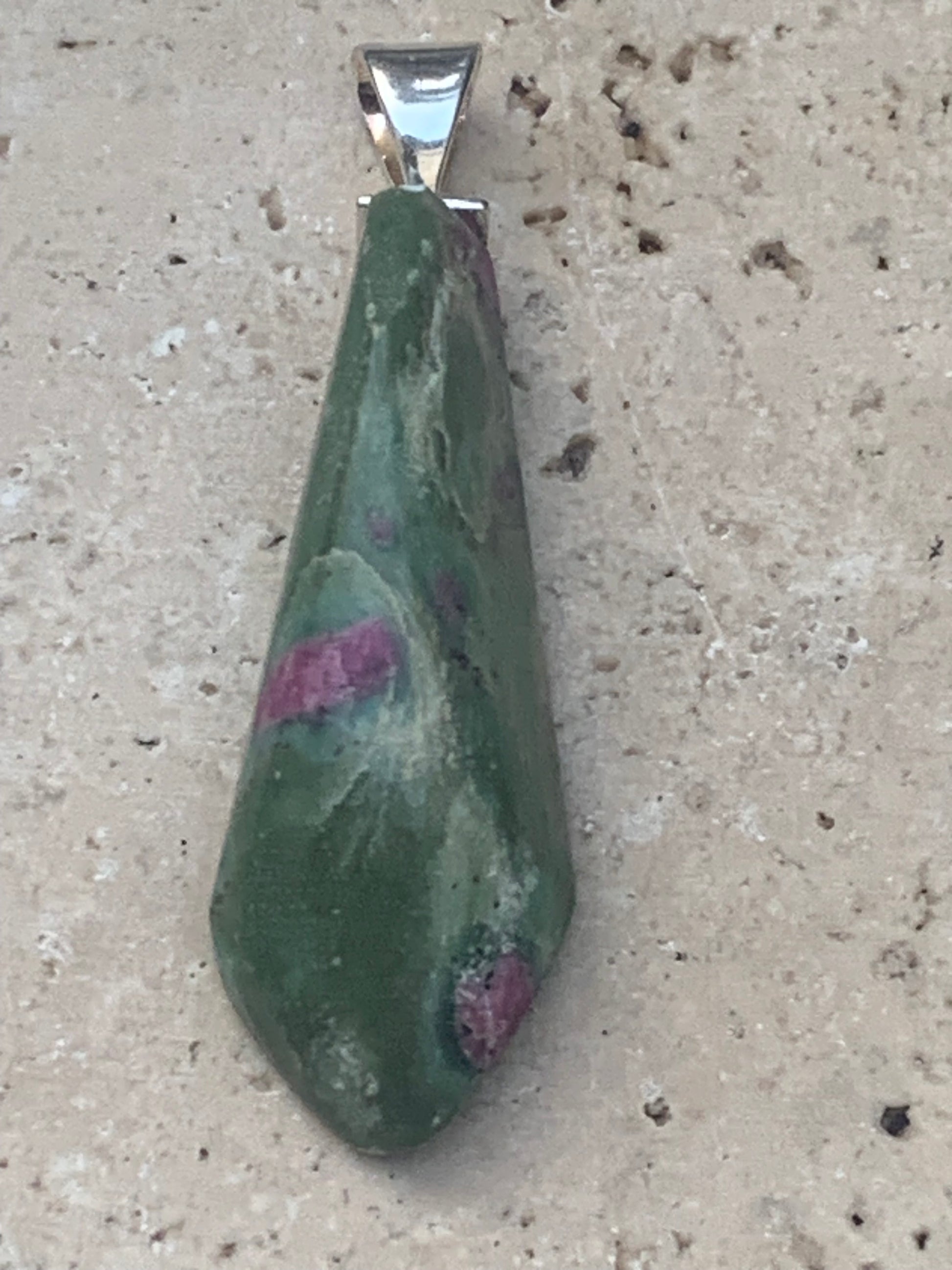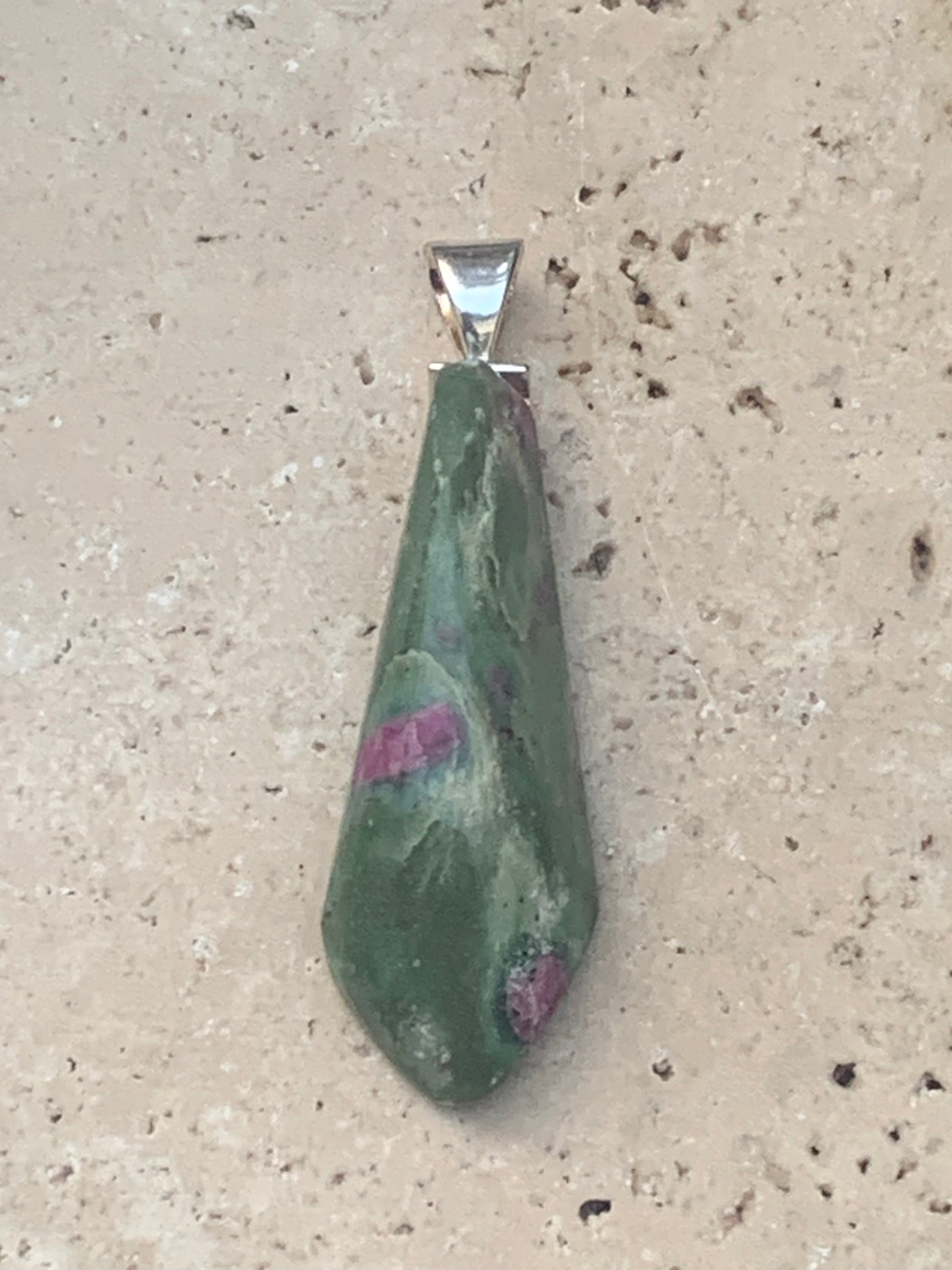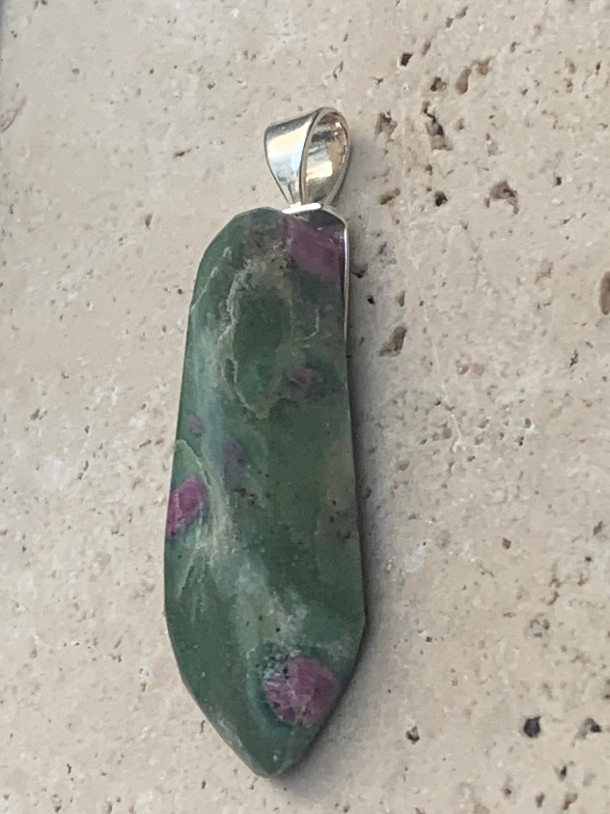 Rubis sur Fuchsite (micas vert), monté sur Argent par G & Z, de 45 mm de ht x14 x12. Vendu avec un cordon réglable de couleur noire !