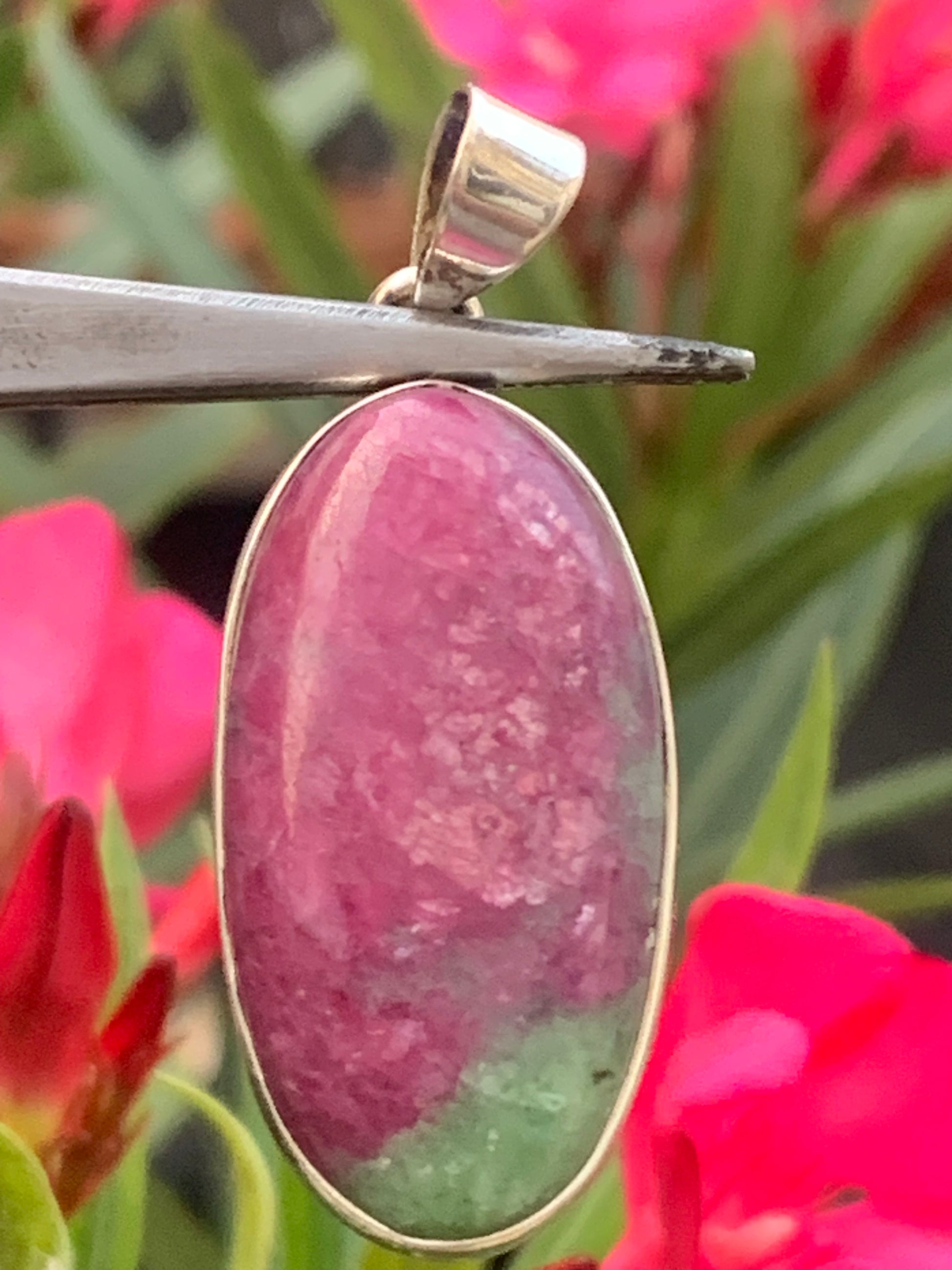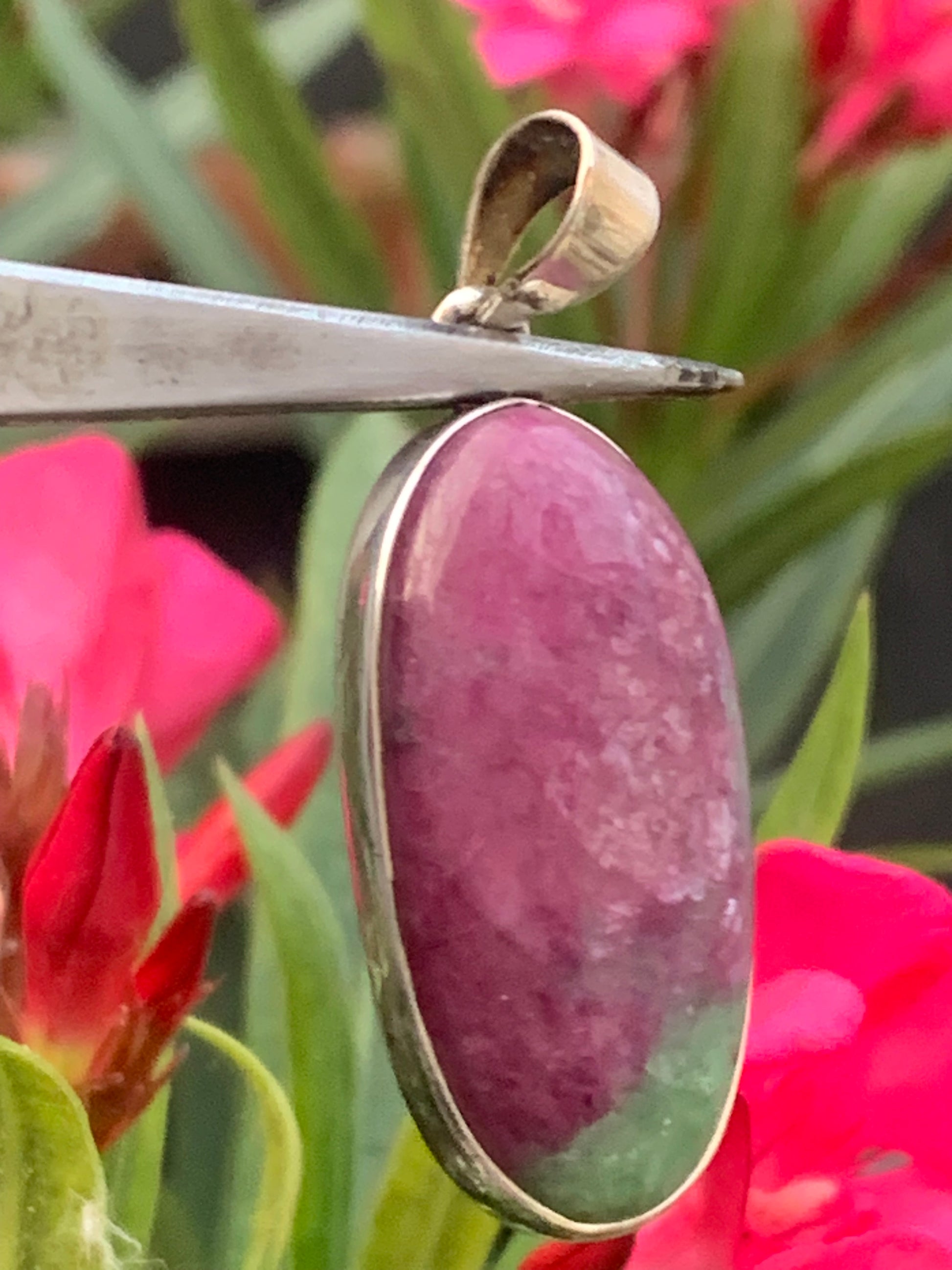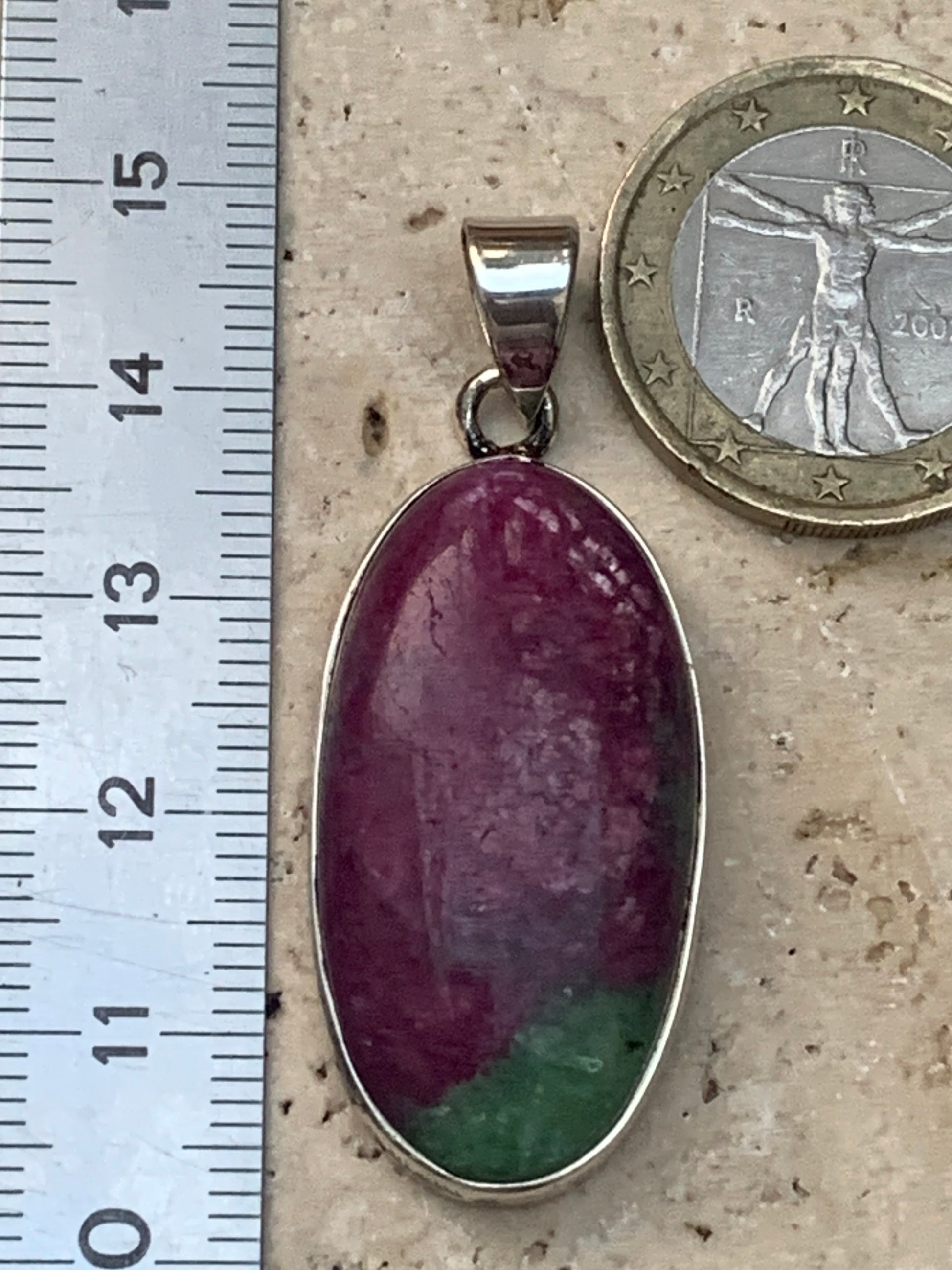 Rubis sur Fuchsite (micas vert), pendentif en Argent de 45 mm de ht x18 x8. Vendu avec un cordon réglable de couleur noire !