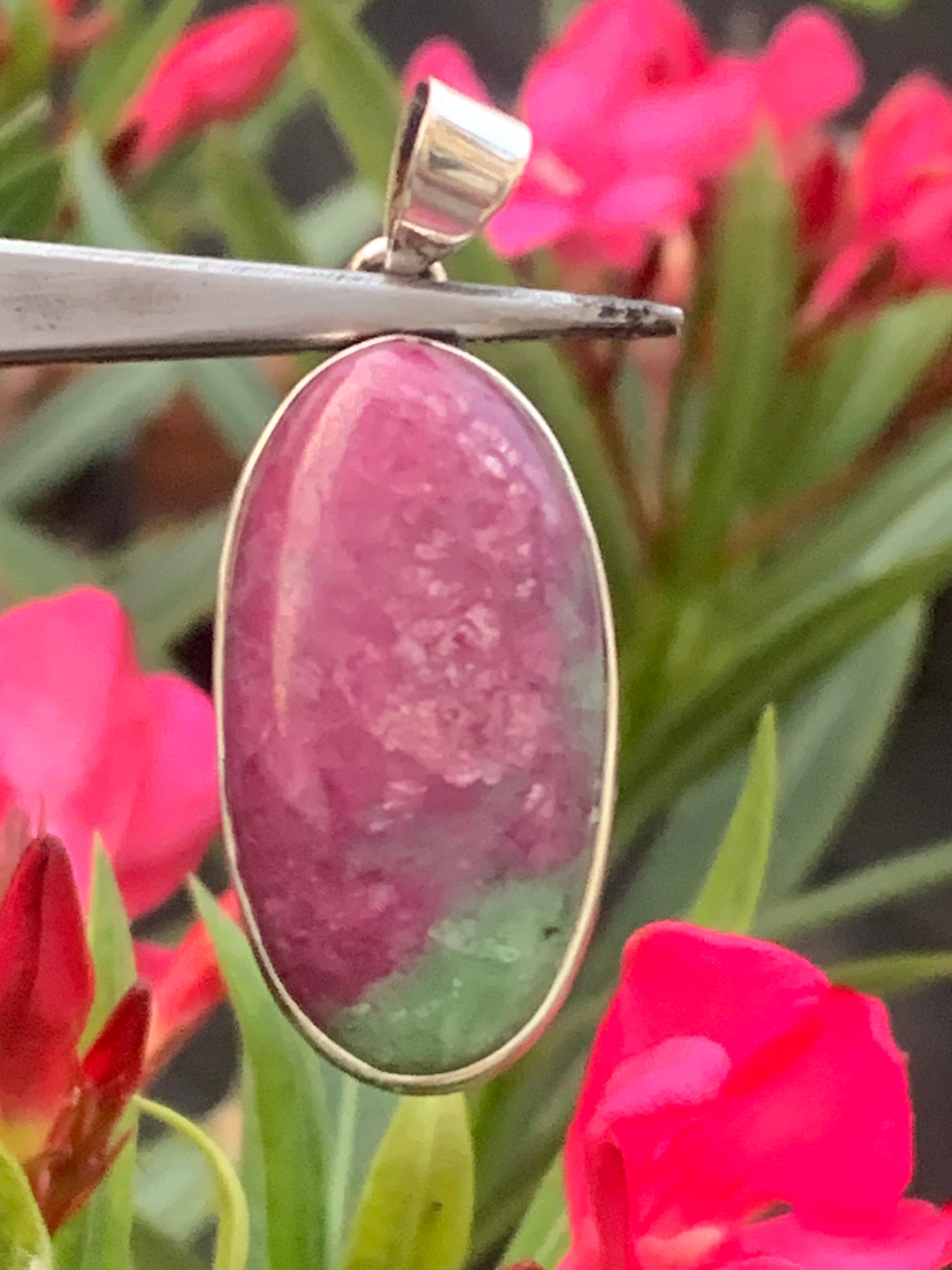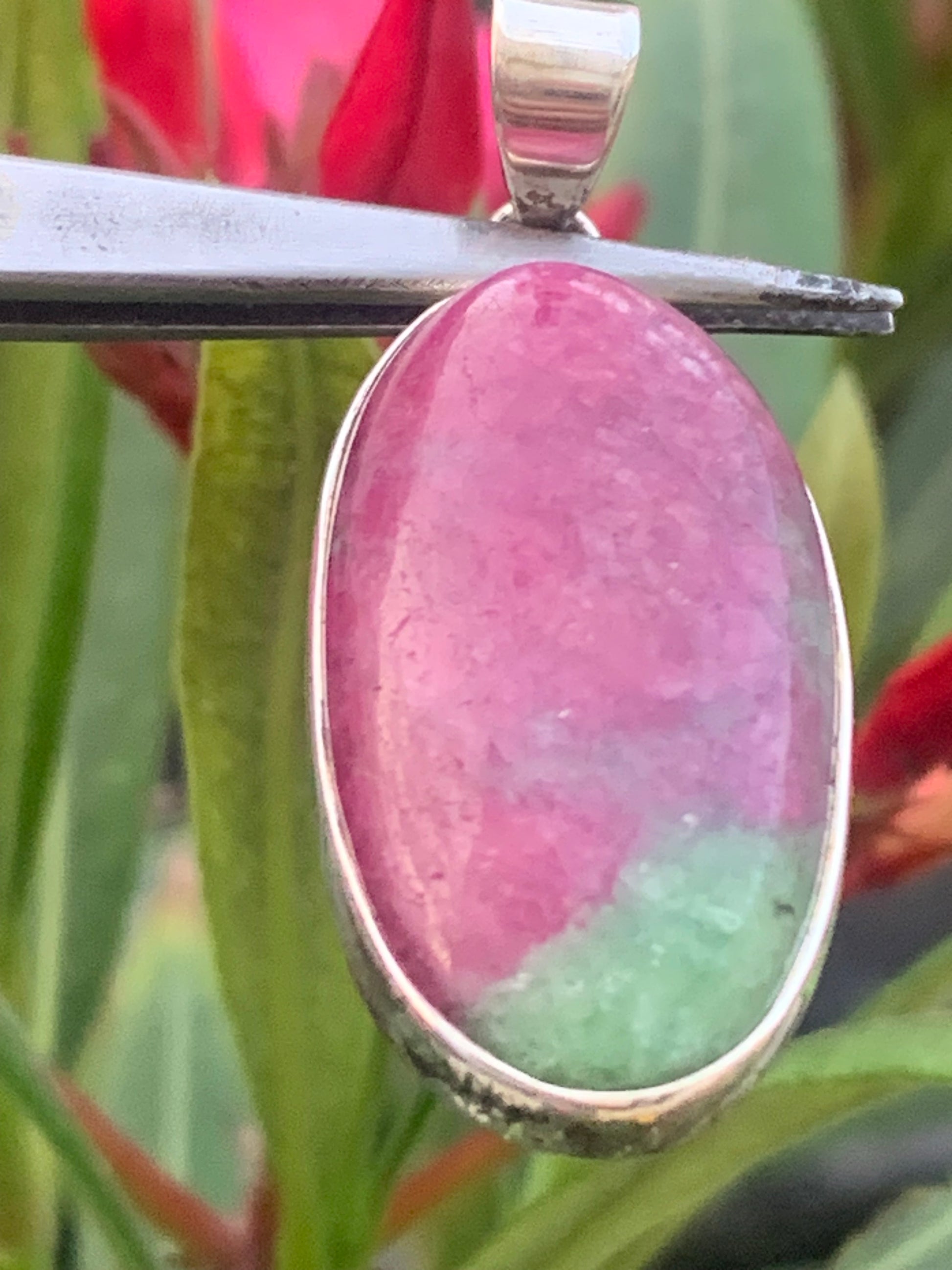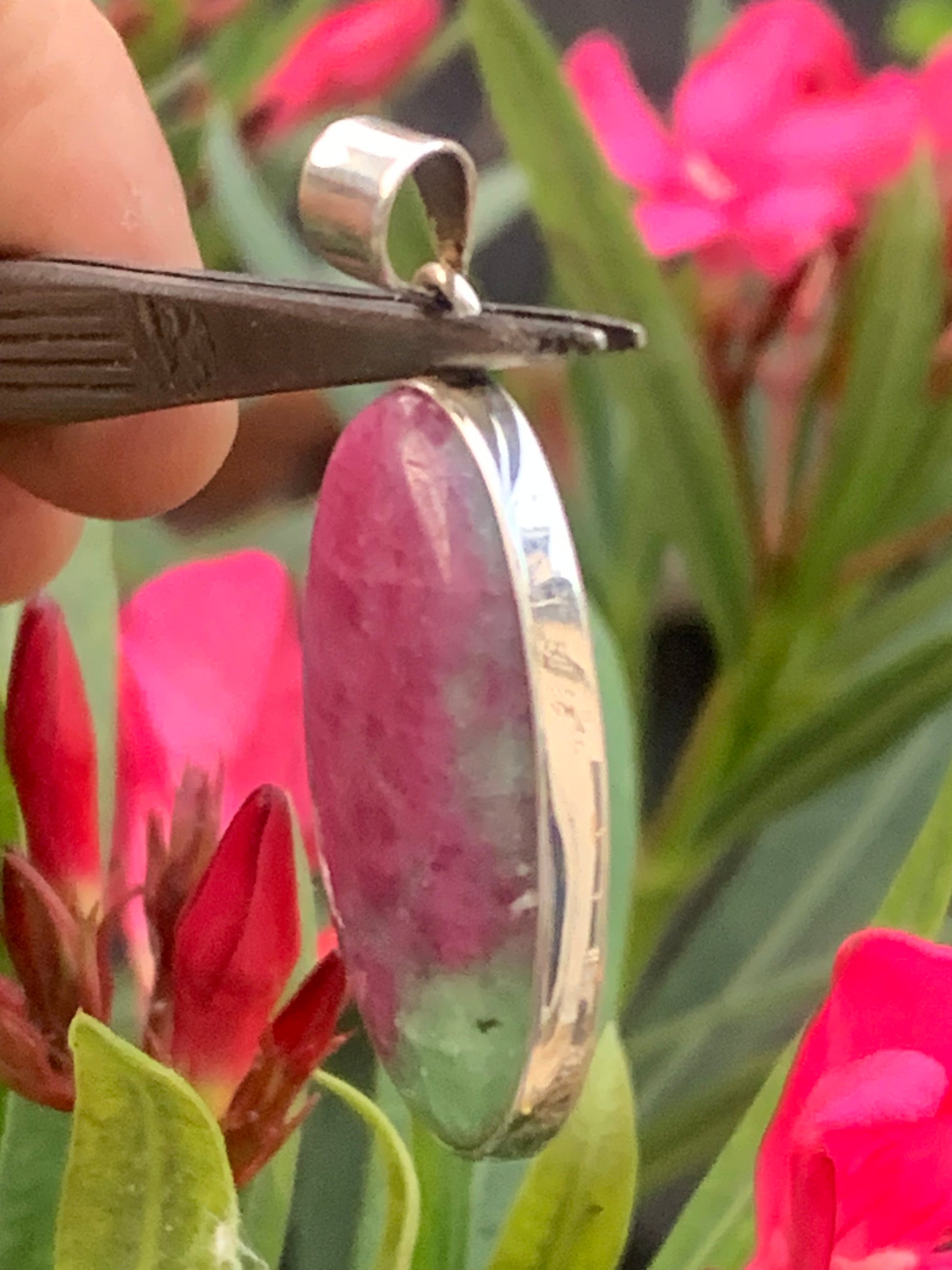 Rubis sur Fuchsite (micas vert), pendentif en Argent de 45 mm de ht x18 x8. Vendu avec un cordon réglable de couleur noire !