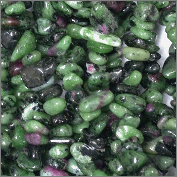 Rubis Zoïsite, bracelet de 17 à 21cm, collier de 42cm et sautoir de 60cm. Perles de type 'baroque/ chips' de formes naturelles montées sur fil élastique ou fil d'acier de haute résistance !