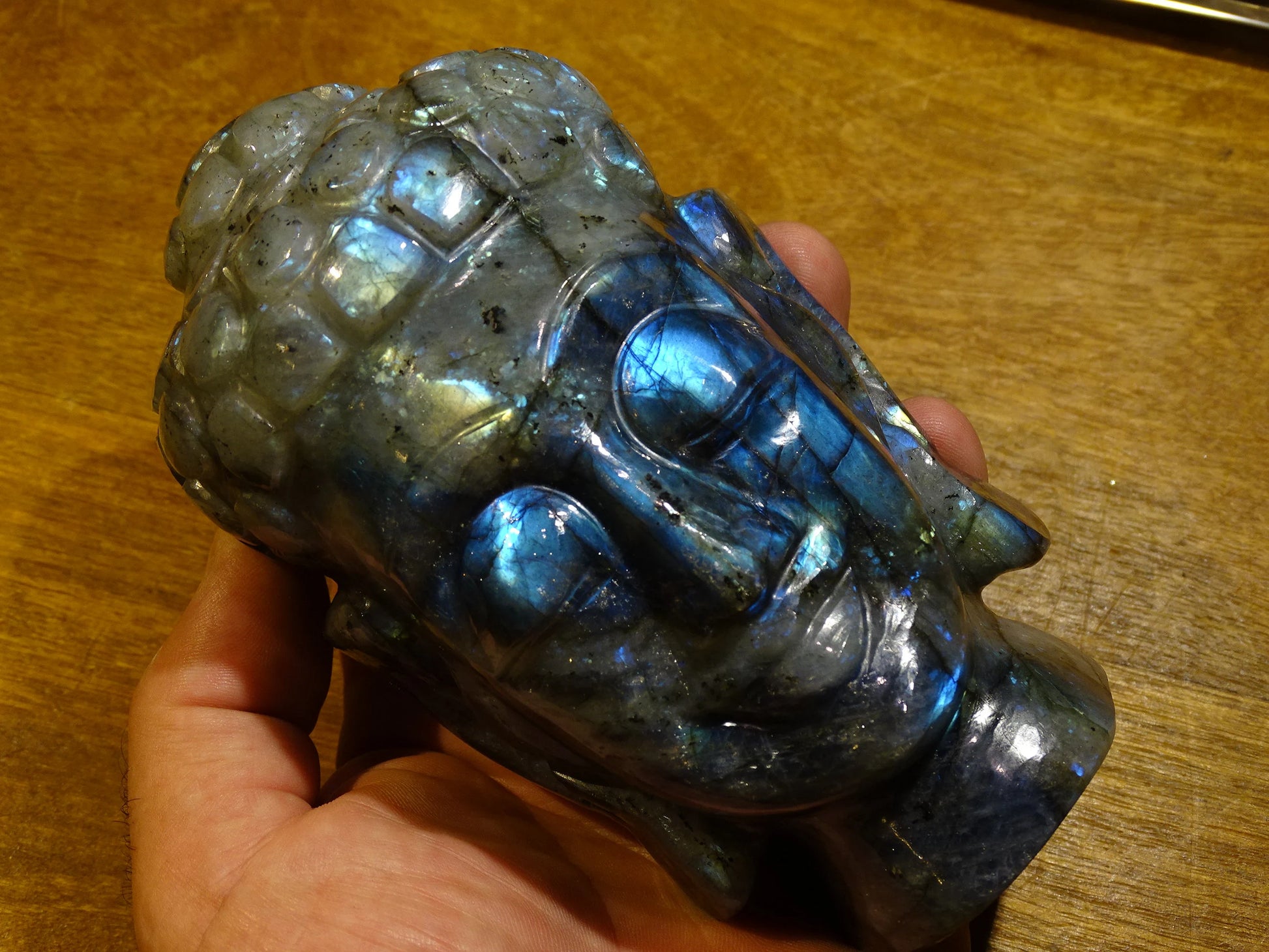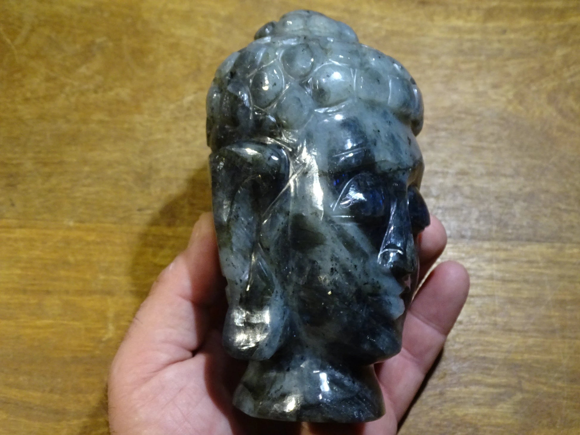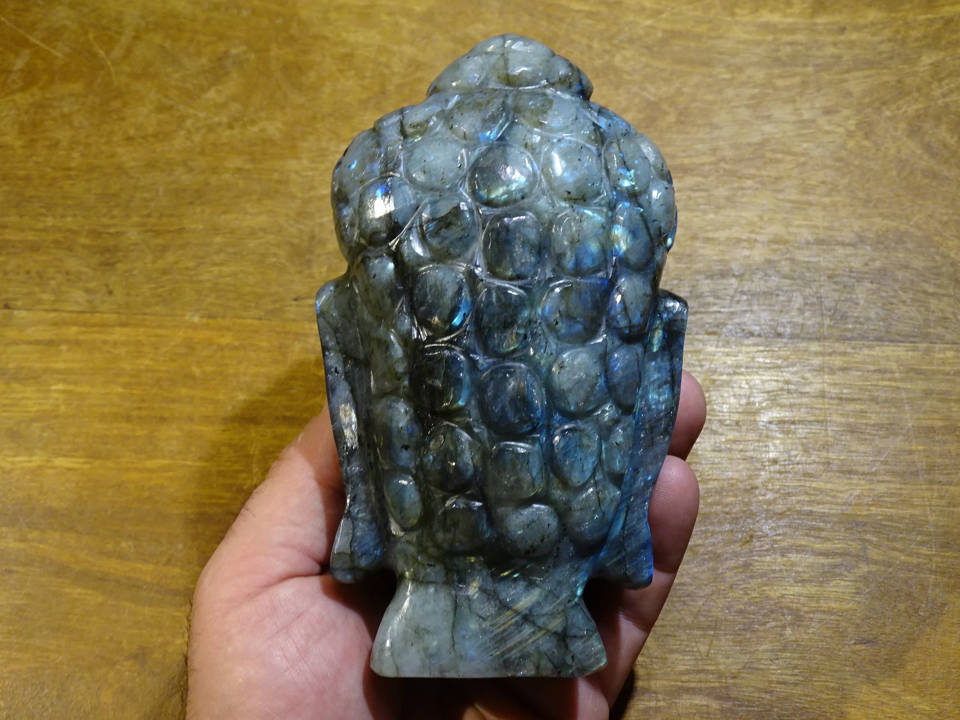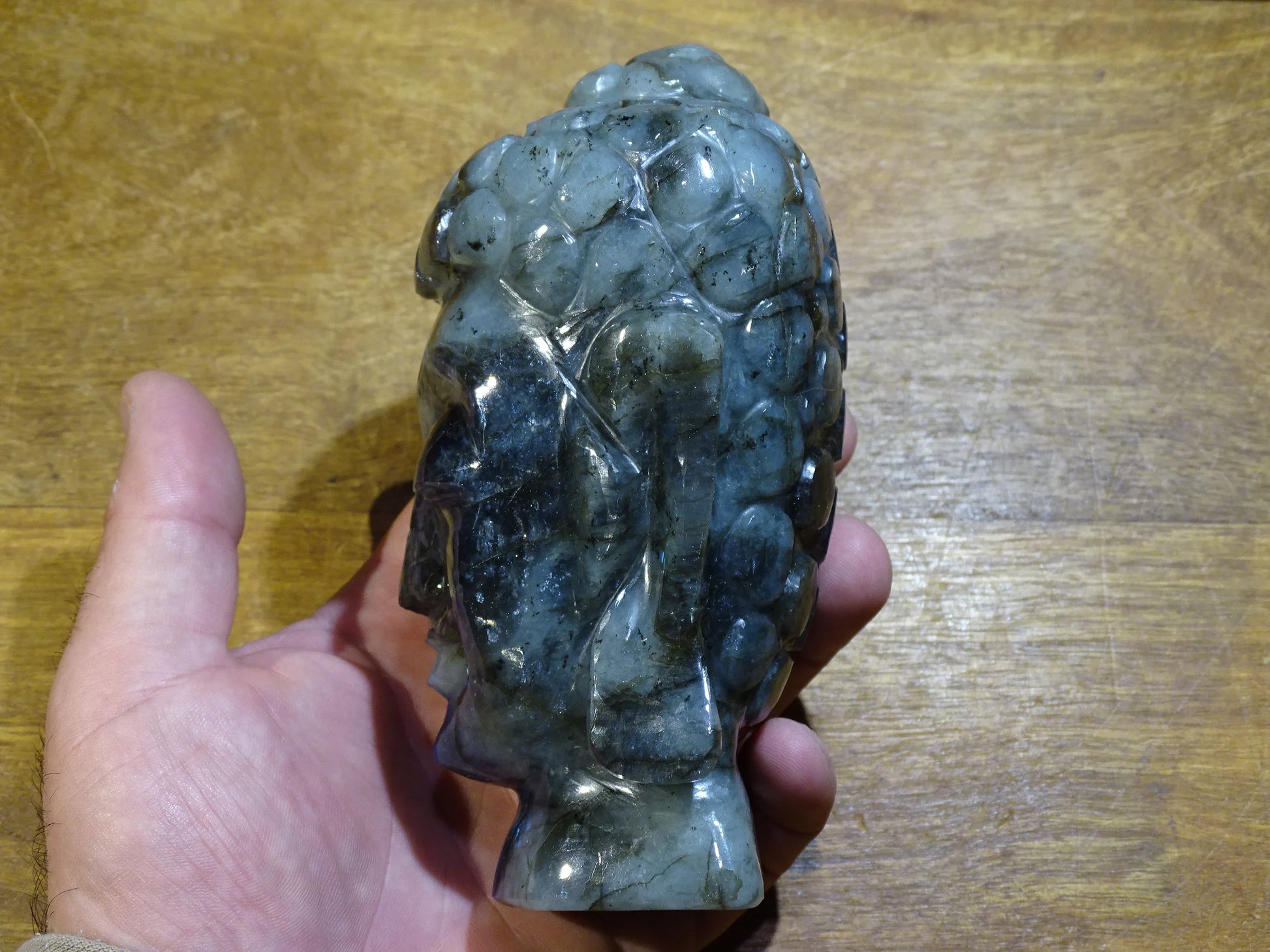 Sculpture de Bouddha en Labradorite qualité supèrieure, fait main. Ø 15 x 8 x 8cm. Reflets bleutés incroyables, superbes pièces ! Parfait dans une salle de Méditation, Autel, Collection, Exposition...
