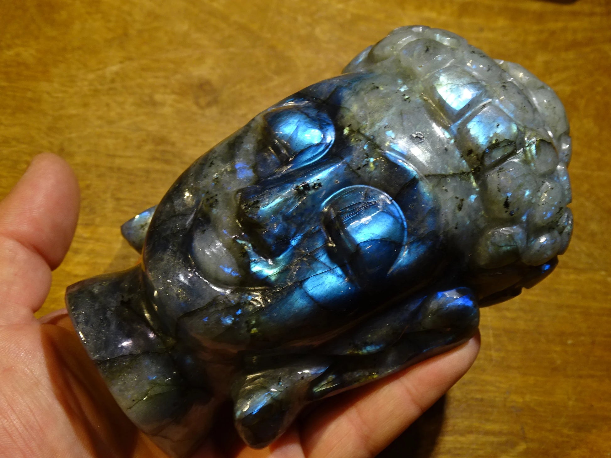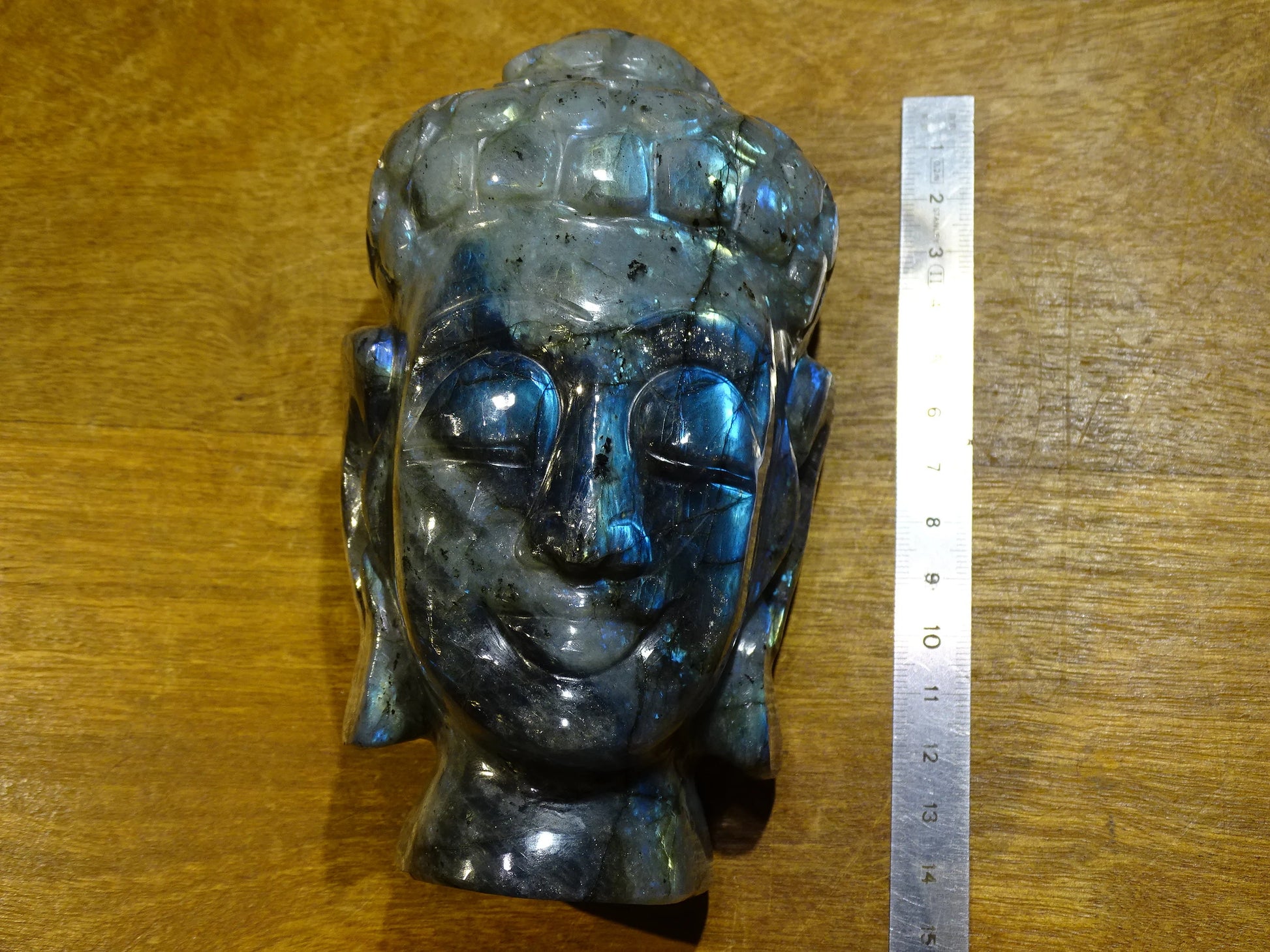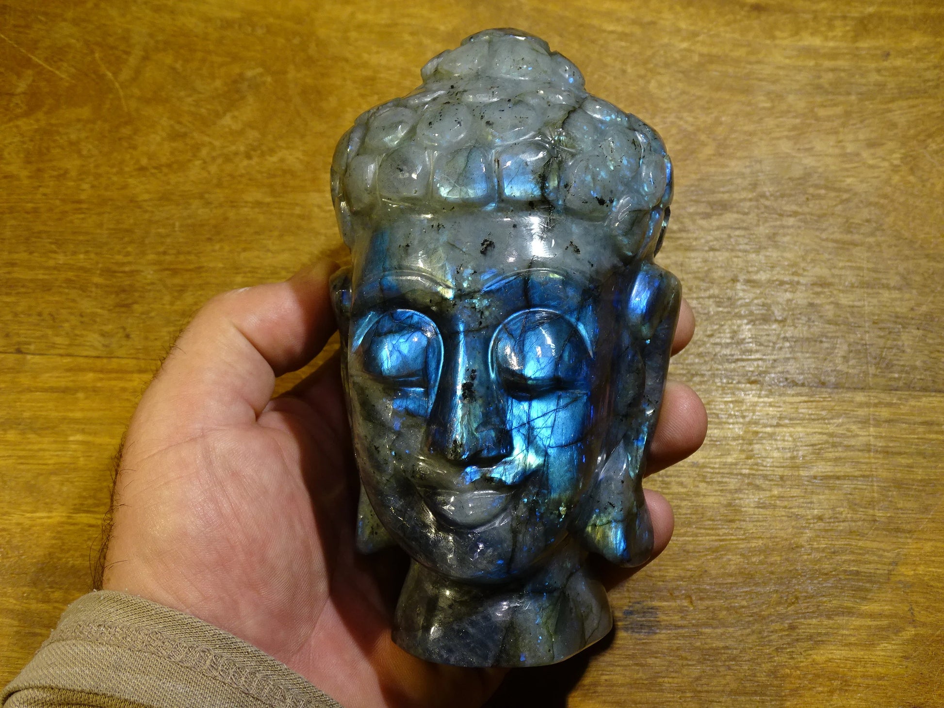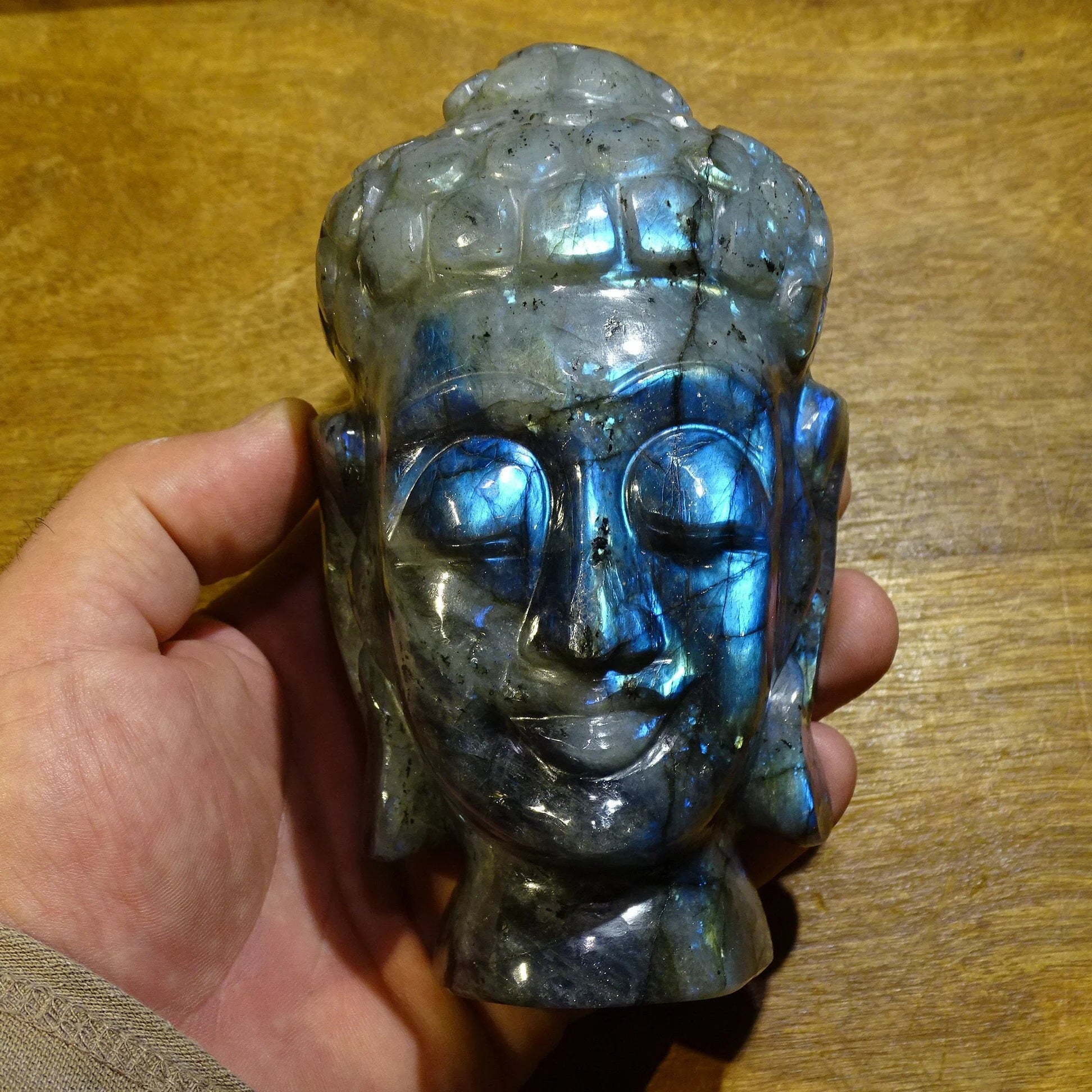 Sculpture de Bouddha en Labradorite qualité supèrieure, fait main. Ø 15 x 8 x 8cm. Reflets bleutés incroyables, superbes pièces ! Parfait dans une salle de Méditation, Autel, Collection, Exposition...