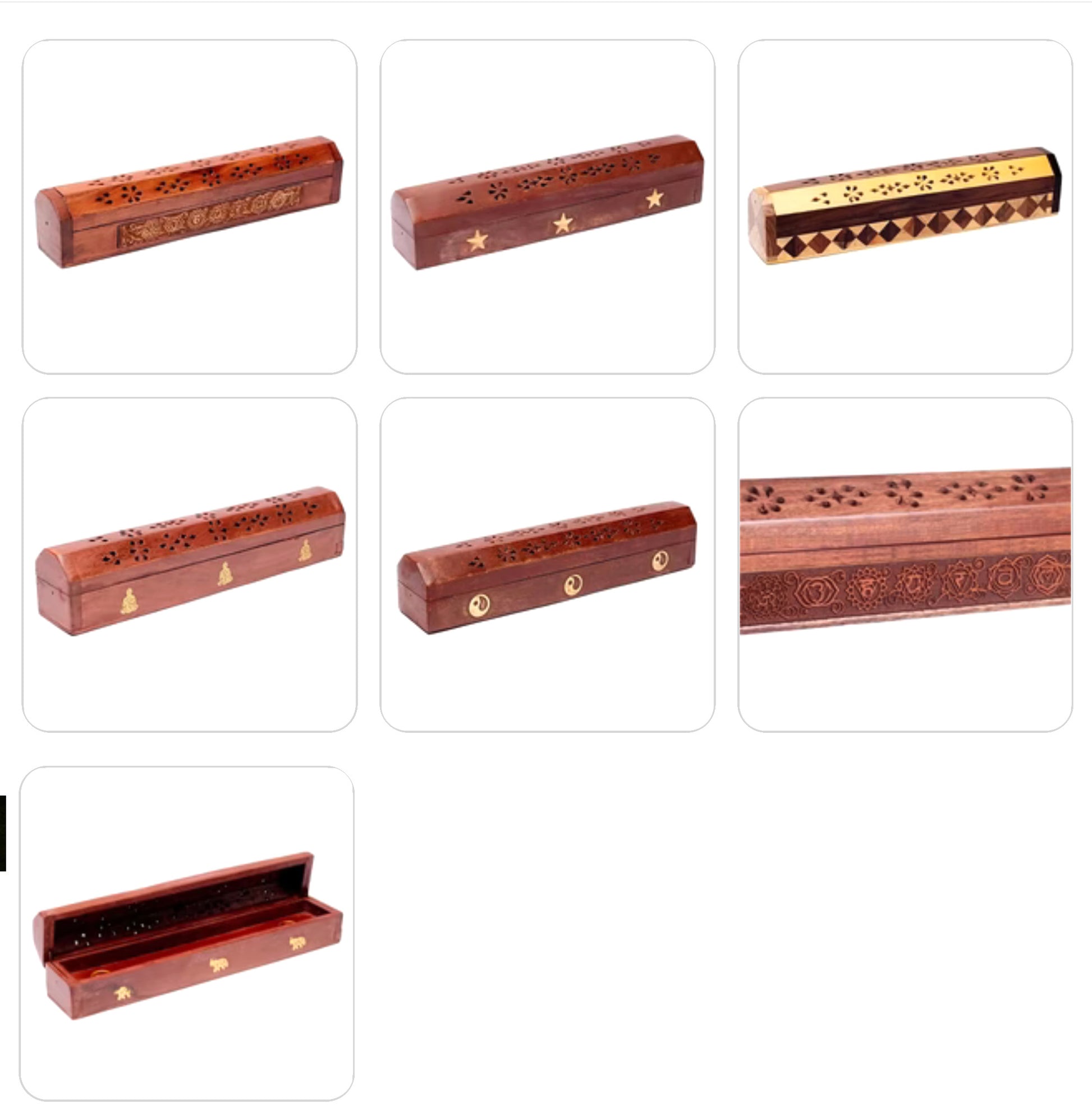 Sélection de boîtes 'brûle encens' en bois d'acacia, 31x5.5x6 cm - 250 grammes. Modèles au choix avec gravures ou incrustations de motifs, parfait !