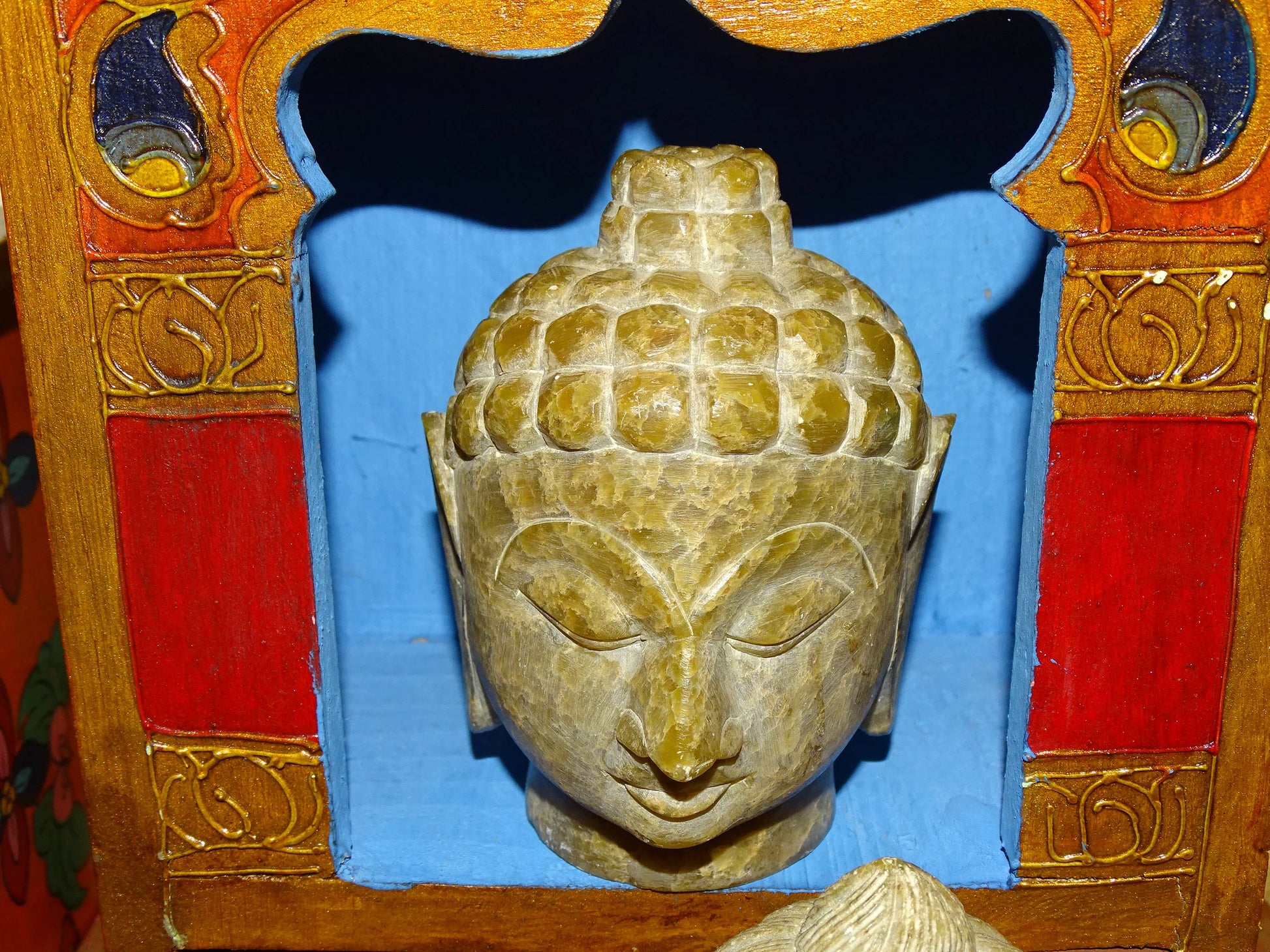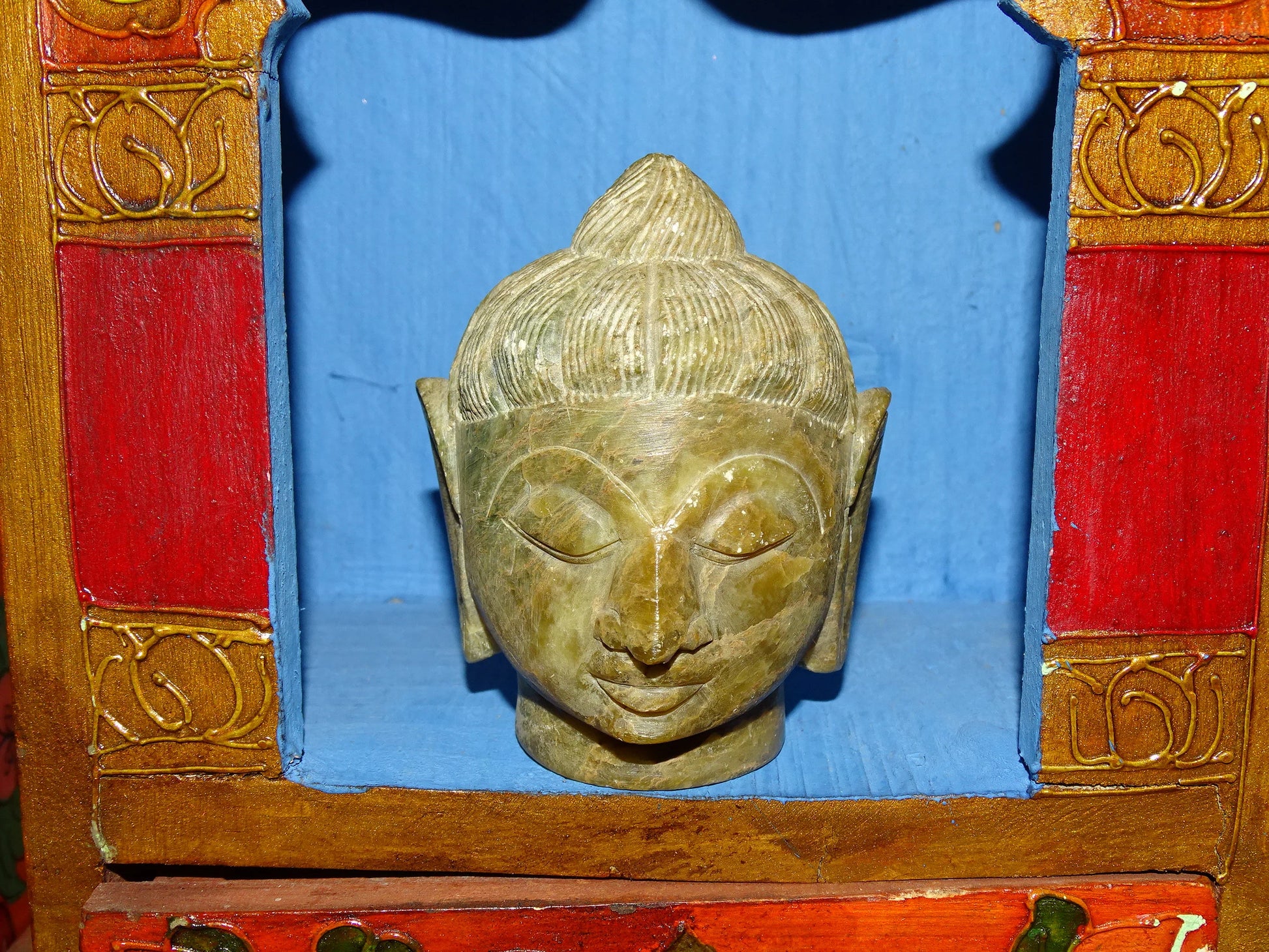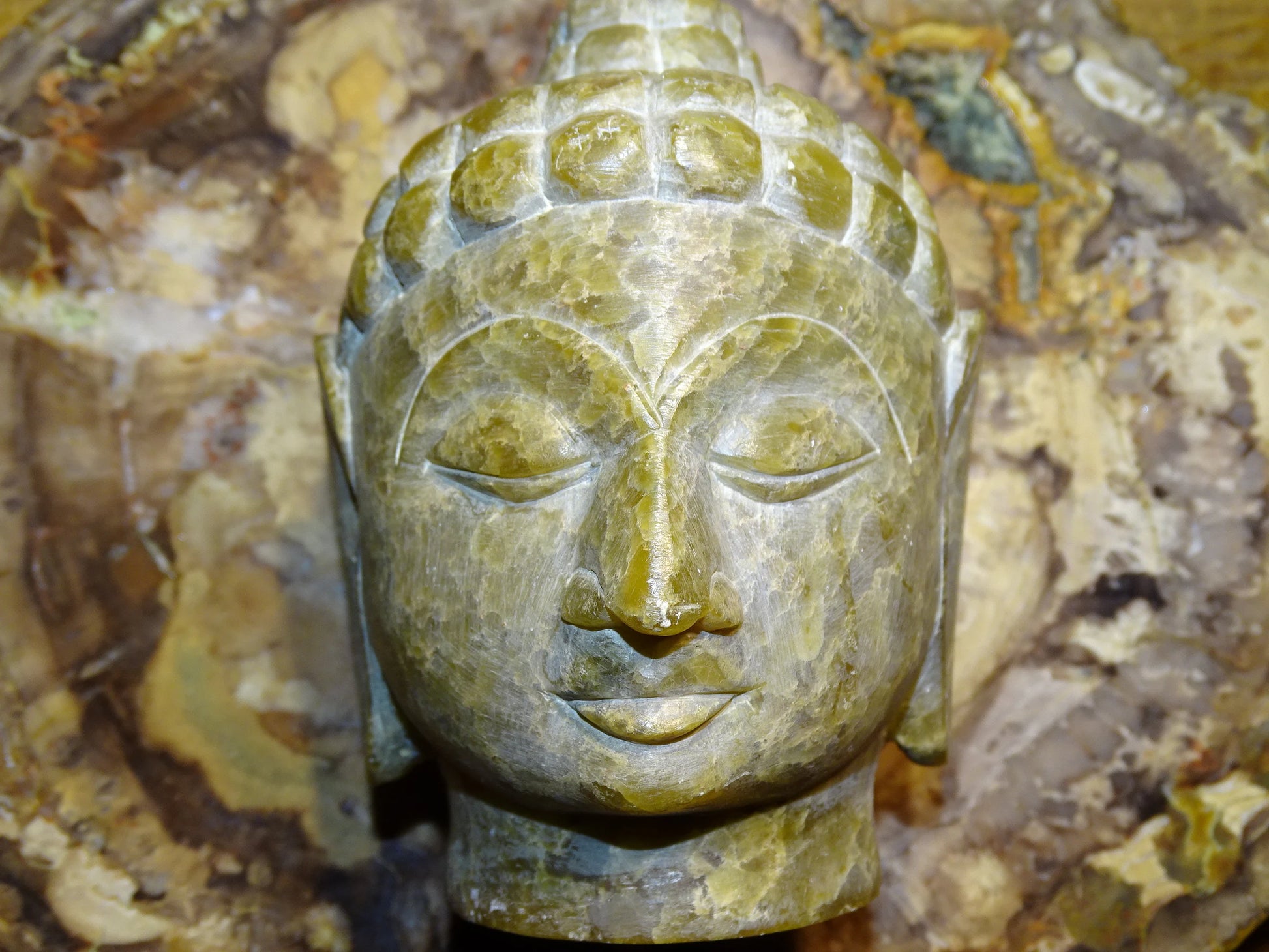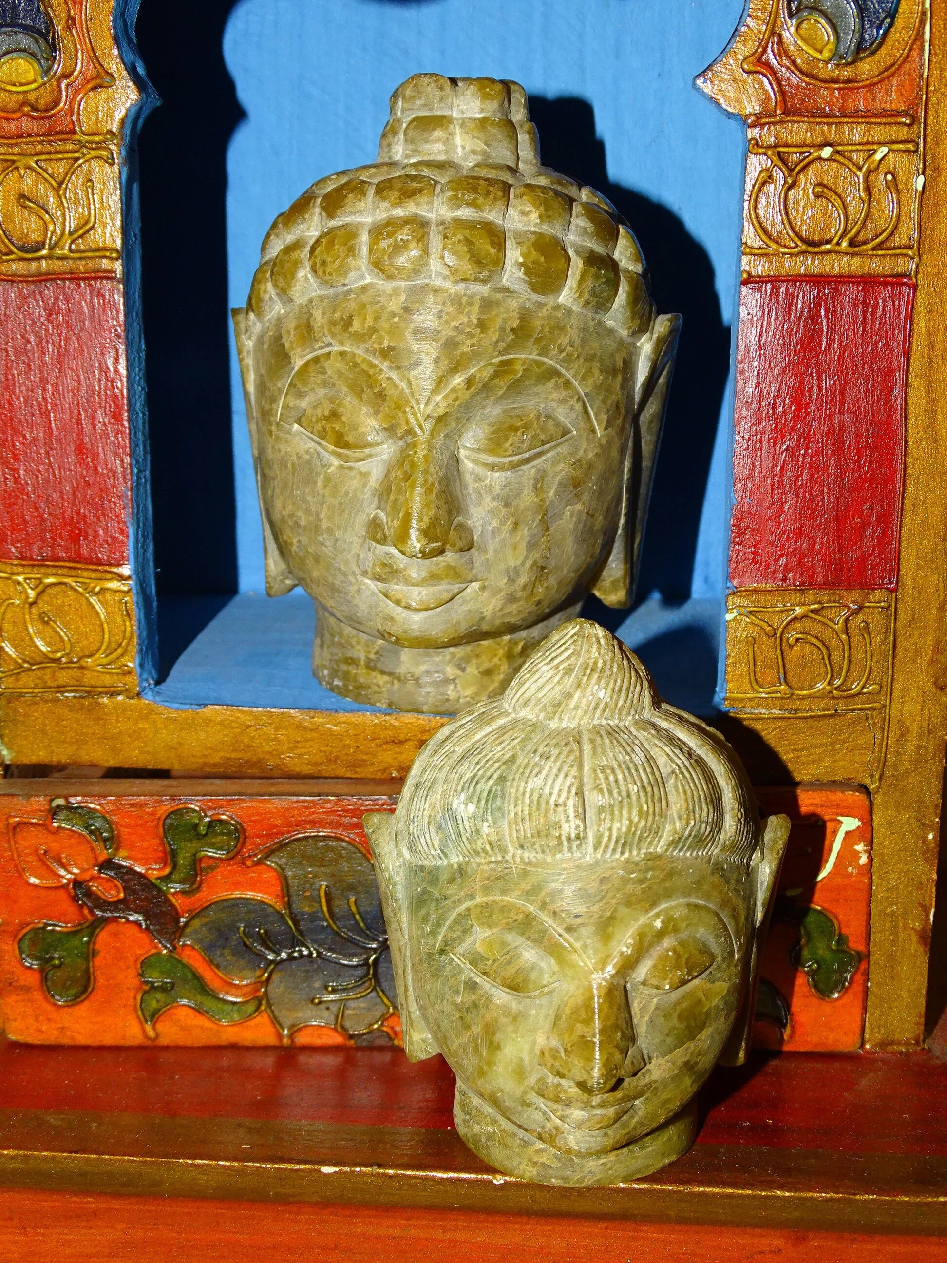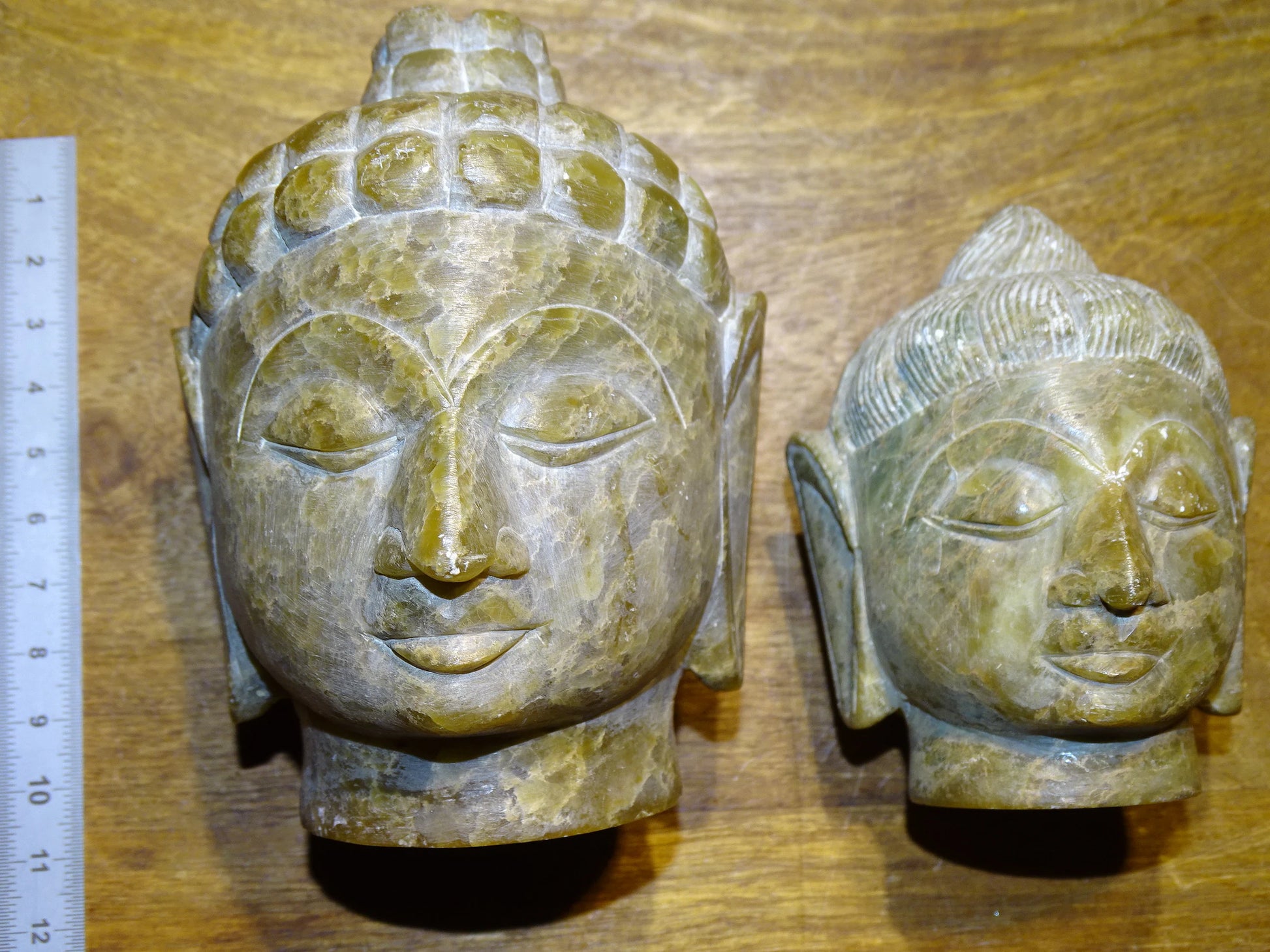 Sélection au choix de 2 Têtes du Bouddha, pièces anciennes, sculptés en pierre de type Jadeite', de taille XL de 8 et 11 centimètres de hauteur - Superbe pièce monté sur socle en bois, magnifique !