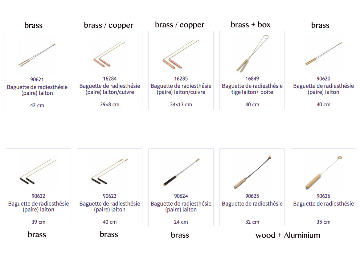 - Baguettes de radiesthésie en cuivre, laiton, bois.