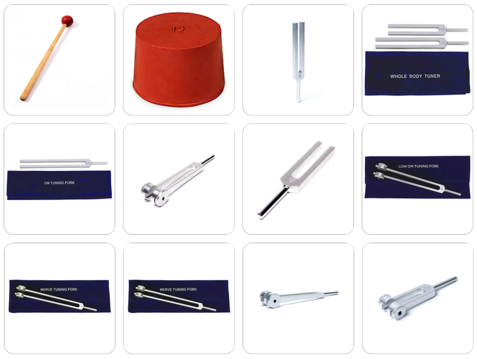 Sélection de diapasons vendu à l'unité, pondérés ou non pondérés, en aluminium anodisé finition dorée, de 13 à 31 cm. Livré dans 1 pochette en velours, parfait !