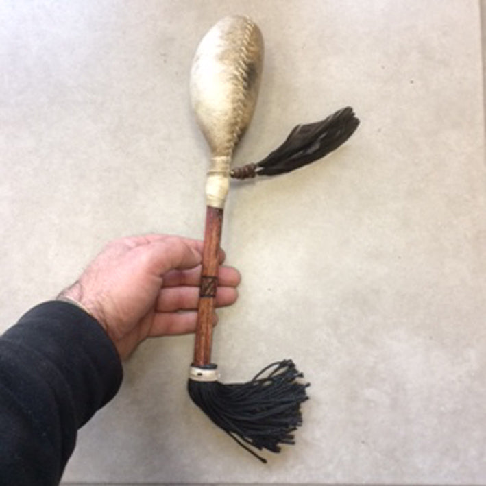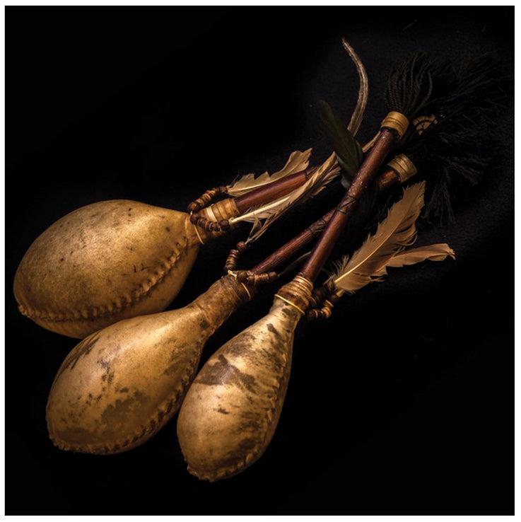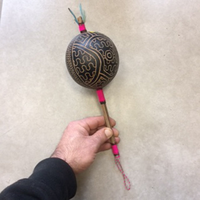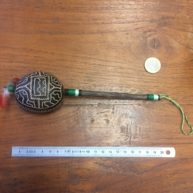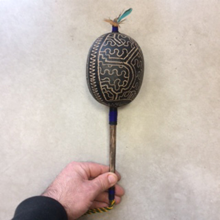 Hochet Shipibo (Pérou) | Peuple Shipibo-Conibo, Amazonie péruvienne | Fabriqué à partir de calebasses, graines et bois, souvent décoré de motifs sacrés | Utilisé par les chamans lors des cérémonies, rituels de guérison et chants icaros |