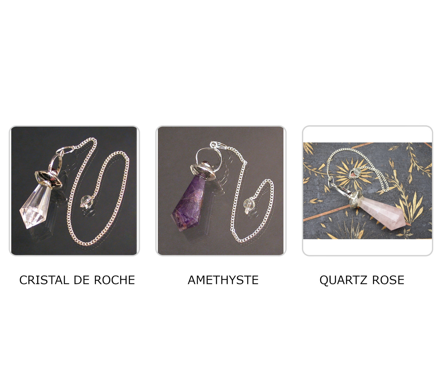 Pendule en cristal | Quartz, améthyste, sélénite | Amplification des énergies, divination | Débutant à Pro | Nettoyage énergétique régulier conseillé |