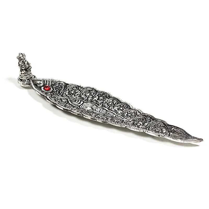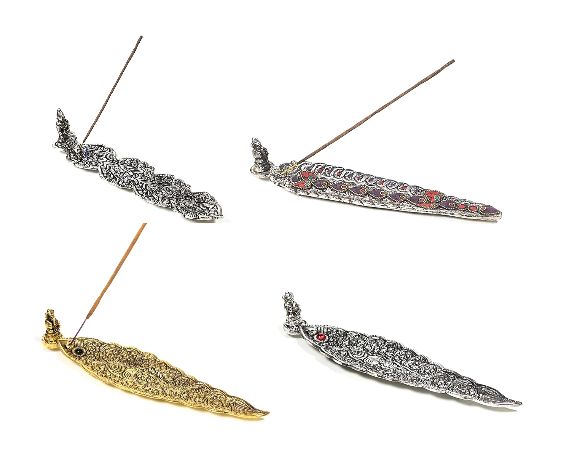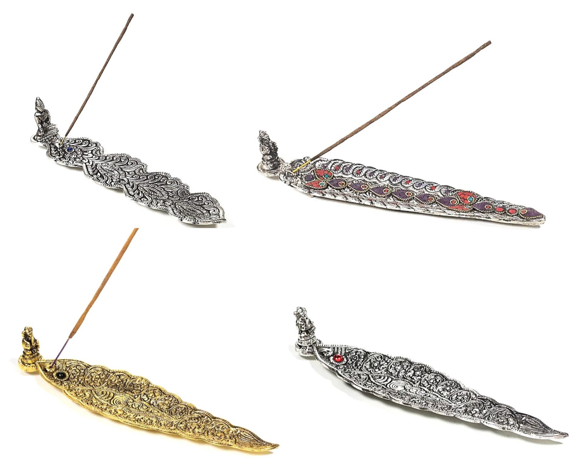 Portes-encens feuille avec Bouddha ou Ganesh – Couleur dorée ou argentée, perle assortie. Parfait pour encens fins. Taille 25×5,5×5 cm – 100 g !