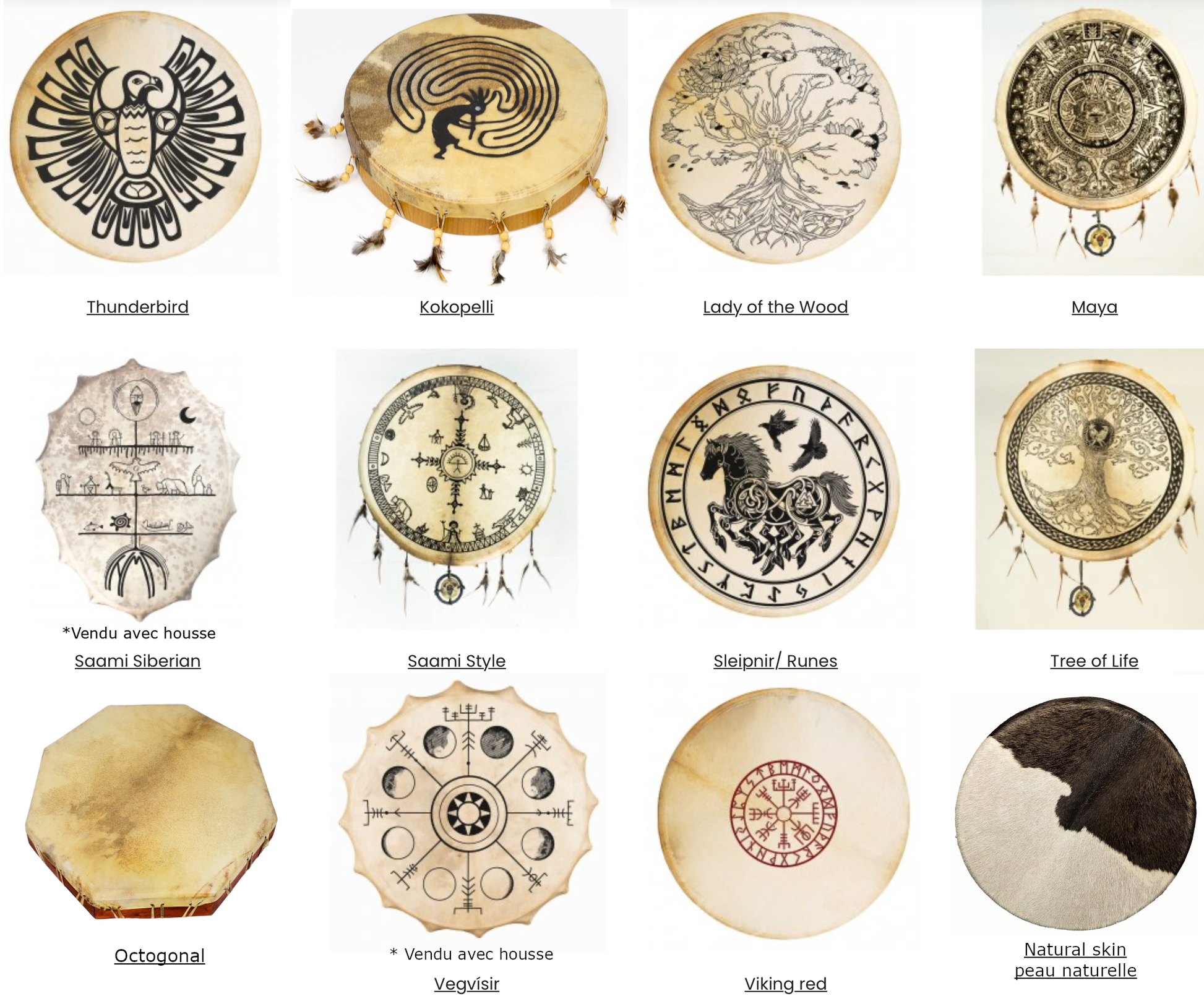 Petite histoire / particularité | Les tambours chamaniques décorés sont considérés comme sacrés. Le dessin renforce l’intention du tambour, sert de guide spirituel et favorise la connexion avec les esprits, les animaux totems et les forces de la nature. Chaque tambour est unique, fabriqué à la main pour refléter l’énergie et la vision de son créateur. |
