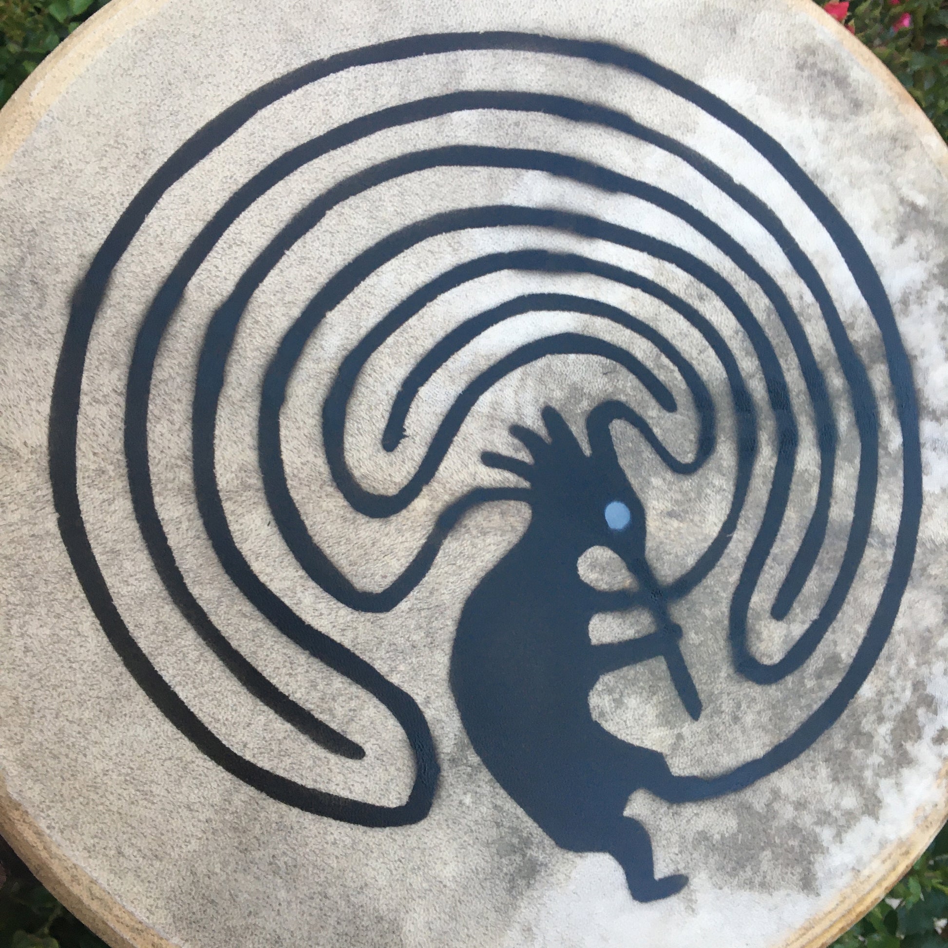 Tambour traditionnel inspiré des pratiques chamaniques, décoré du célèbre motif de Kokopelli, figure sacrée amérindienne symbolisant la musique, la fertilité, la joie et l’abondance.
