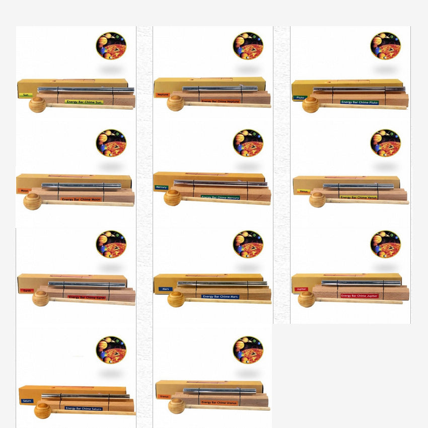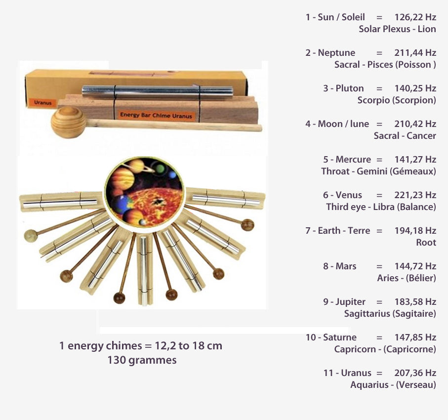 Sélection d'energy chimes/ barres sonores, set de 11 barres 'Fréquences des planètes' ! 12,2 à 18 centimètres de longueur, vendu avec maillet. Parfait pour la Méditation, soins, bains de sons...