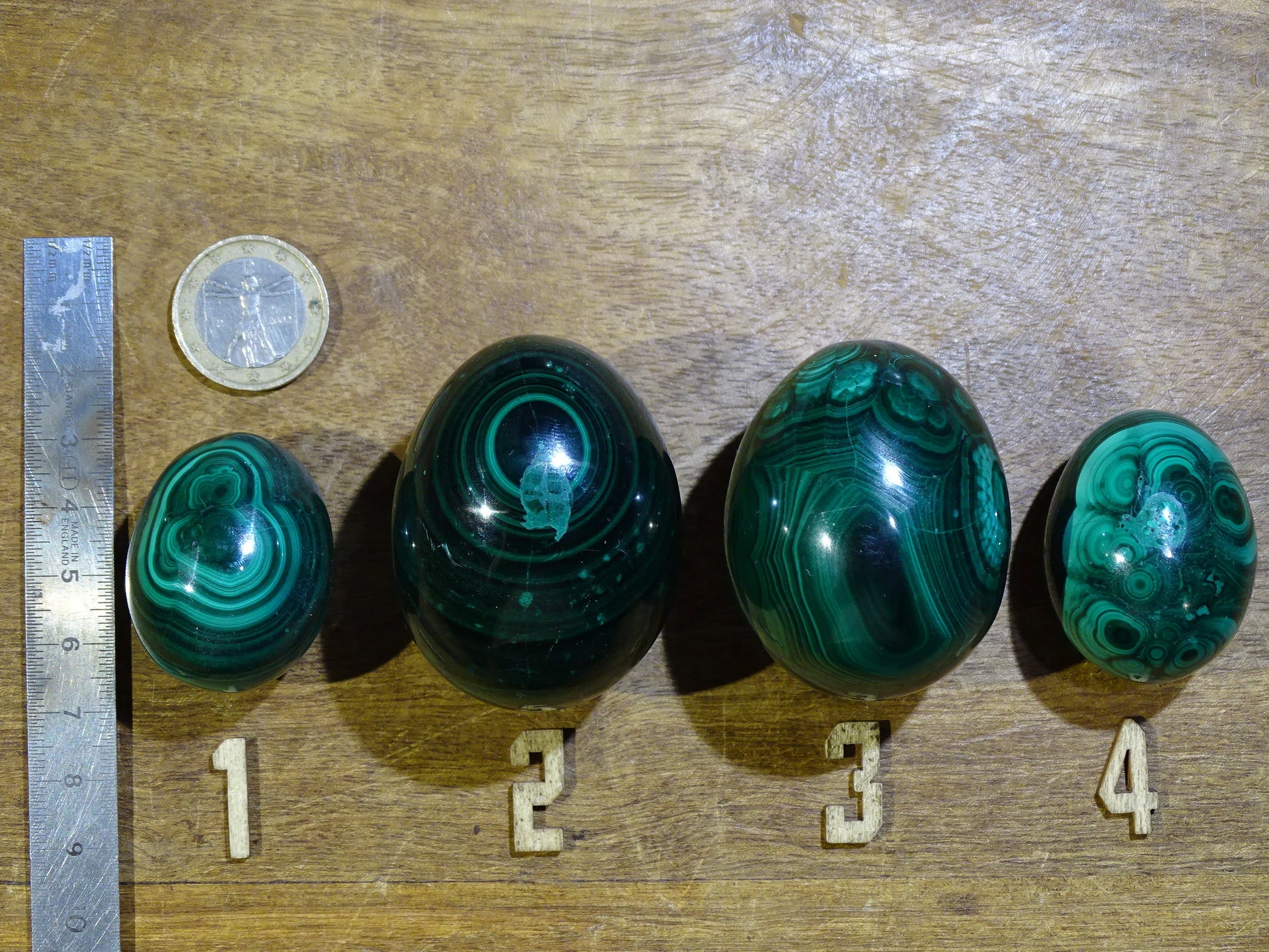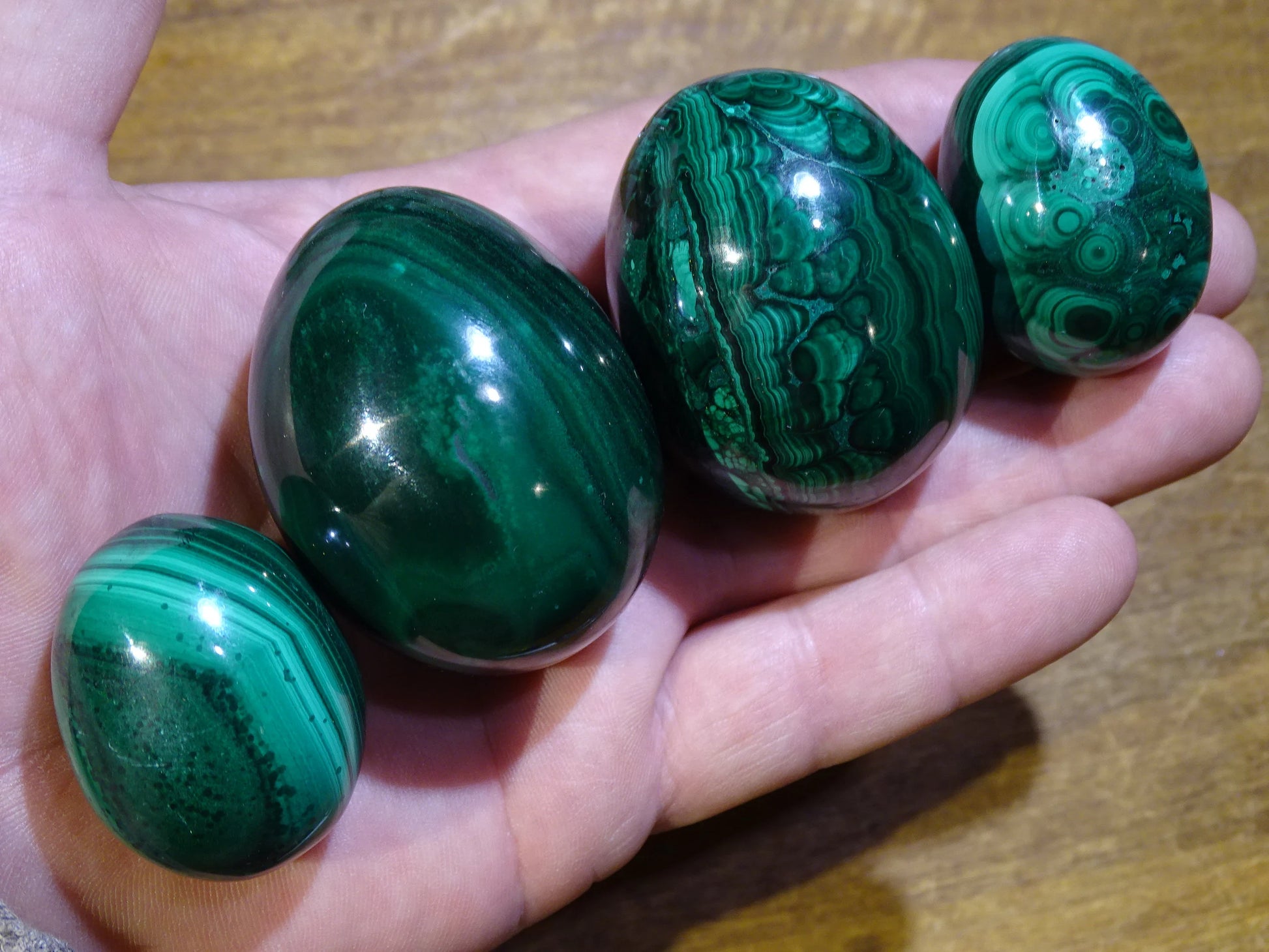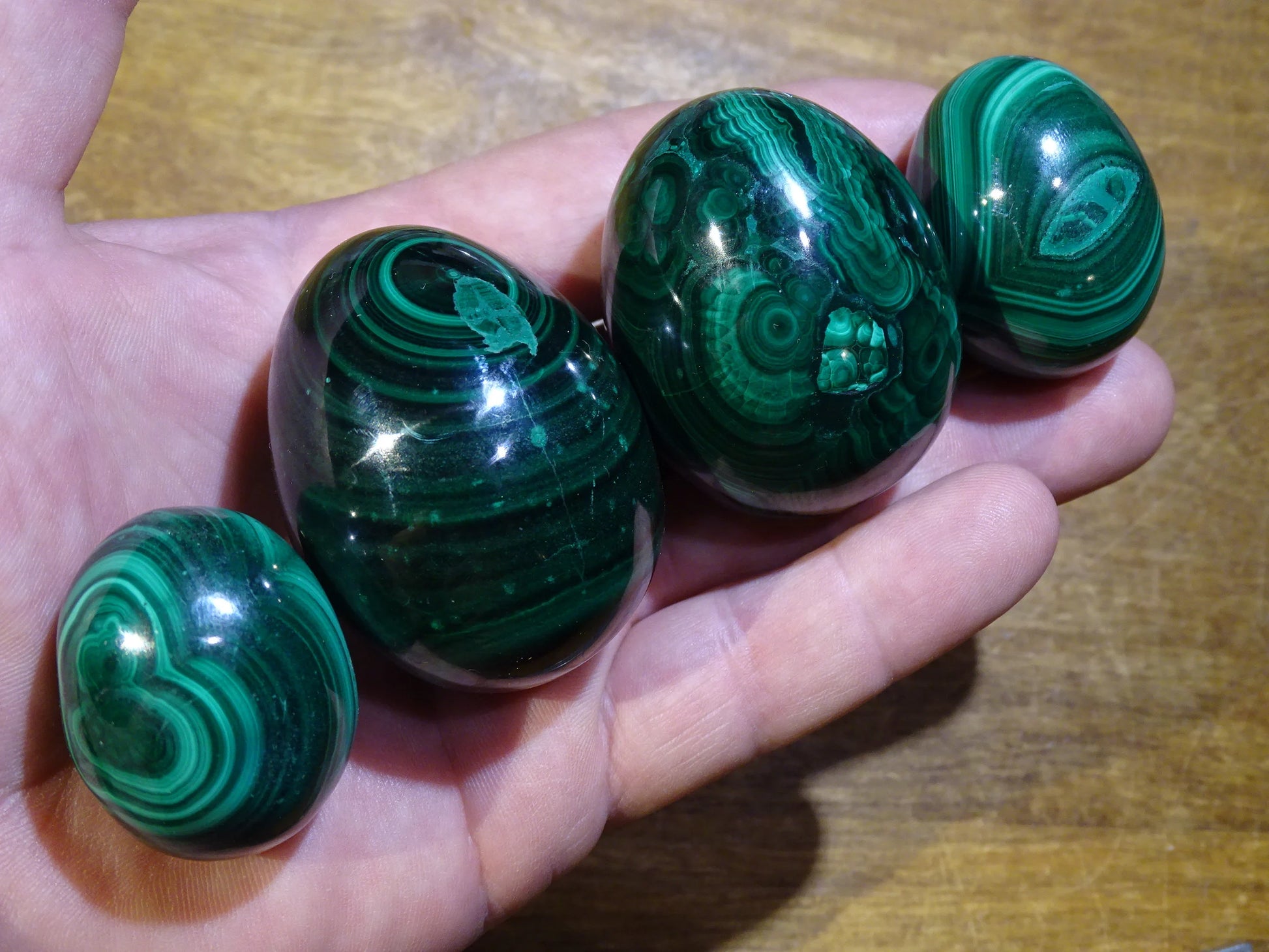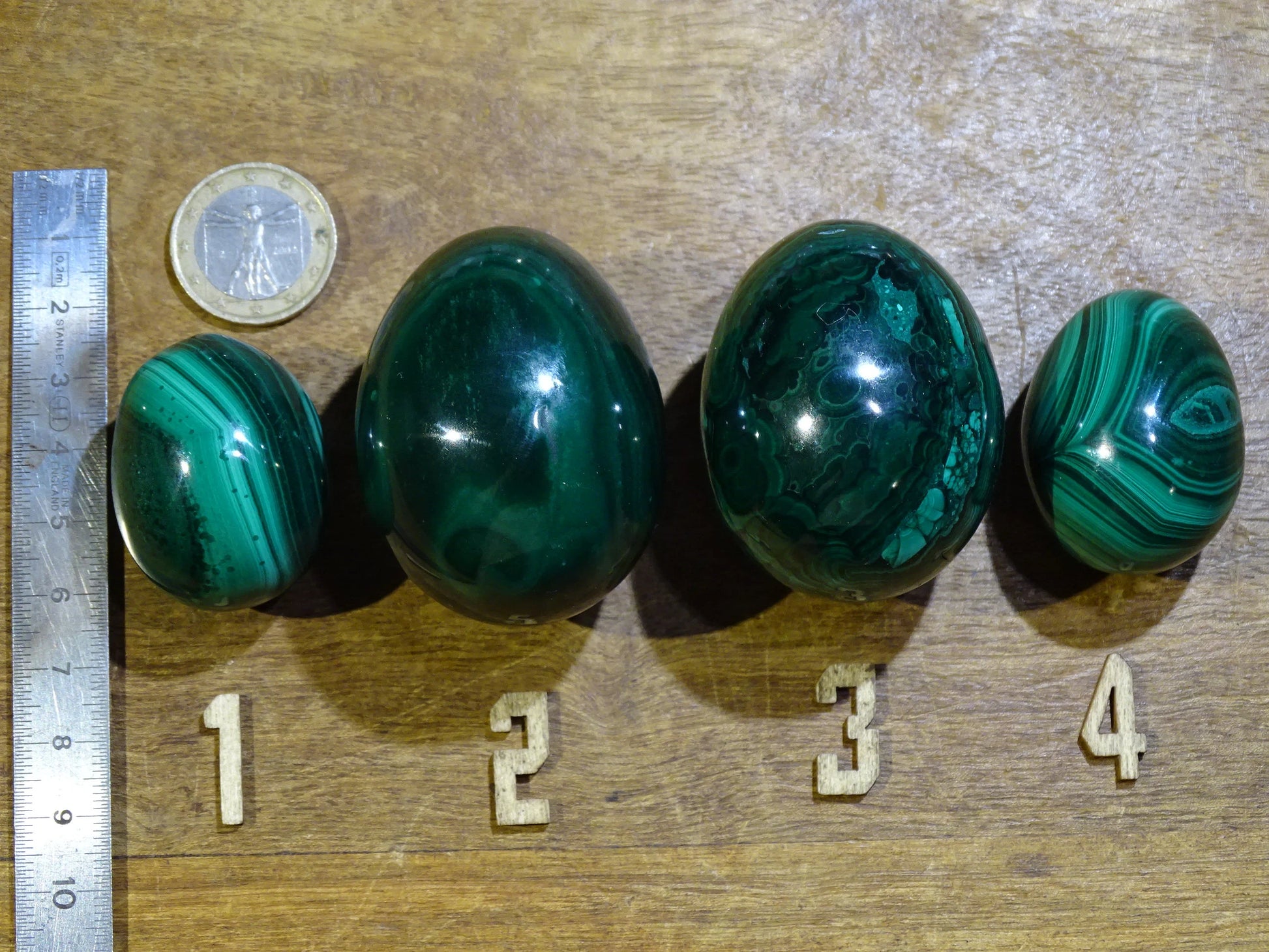 Sélection d'oeufs en malachite, de 57 à 177 grammes, de 35 à 50 millimètres de diamètre. Très belle qualité, parfait pour la lithothérapie, collection, exposition... !